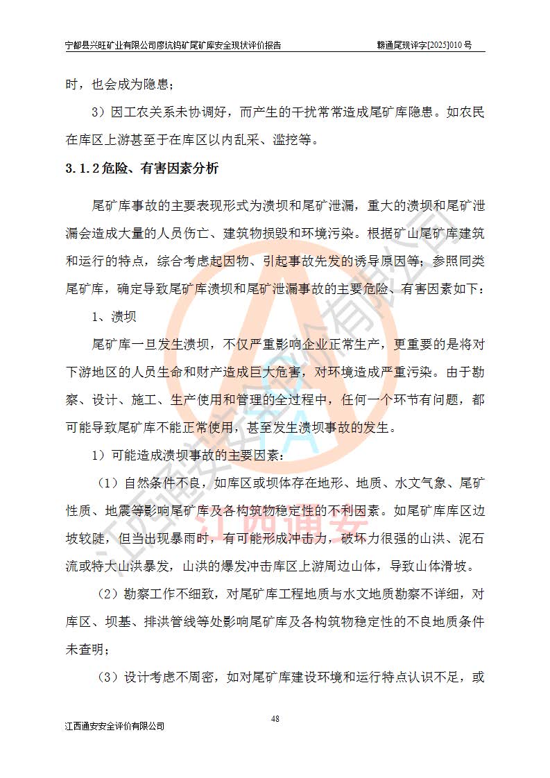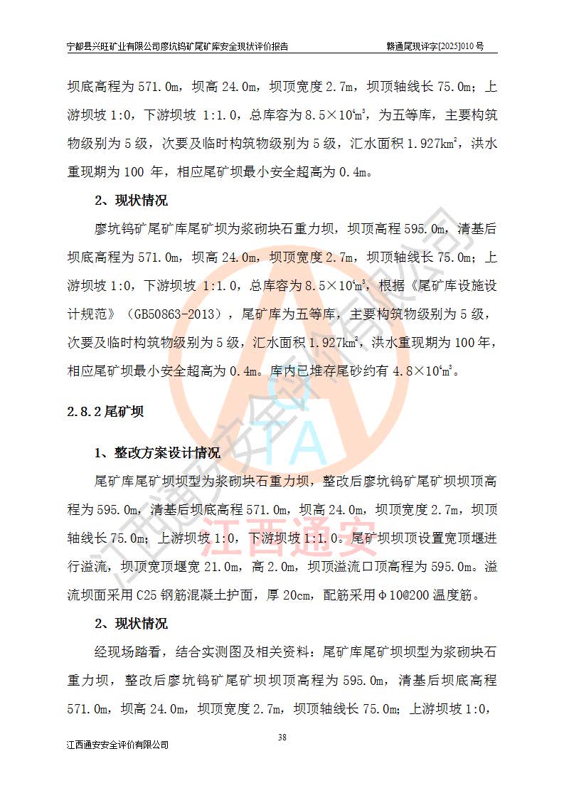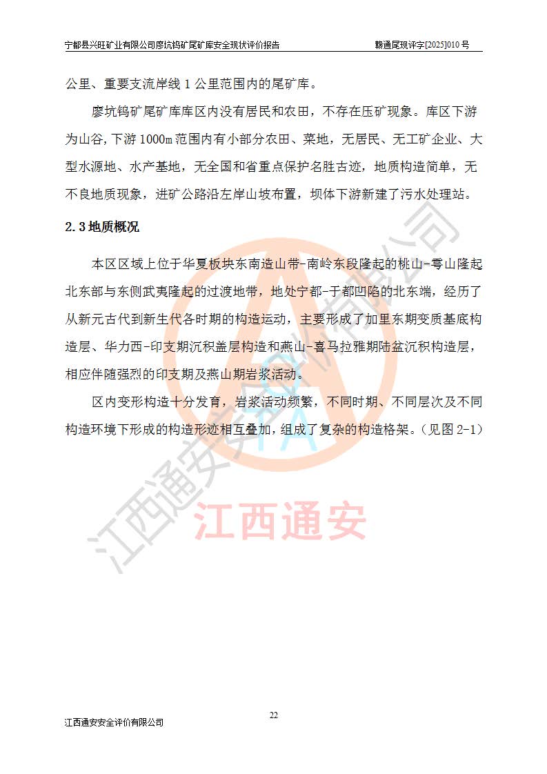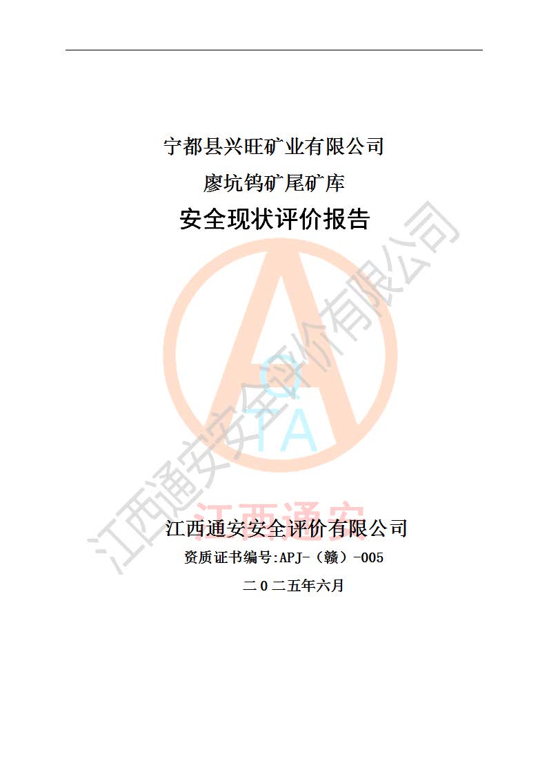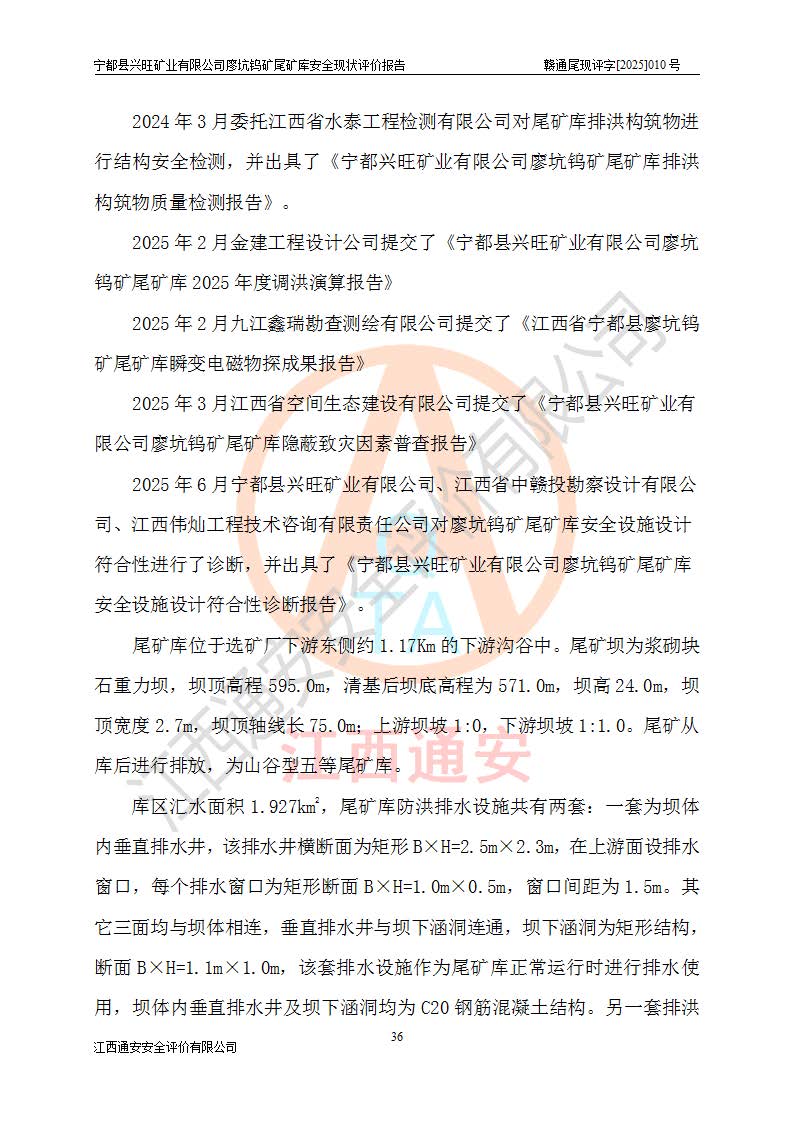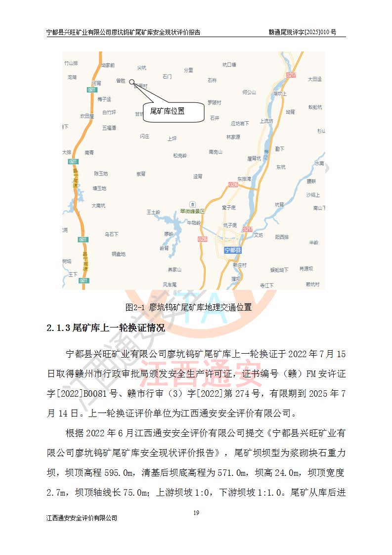 宁都县兴旺矿业有限公司廖坑钨矿位于宁都县县城北西直距约15km处的安福乡西甲村,地理坐标:东经115°50′48″;北纬26°32′1″。宁都县兴旺矿业有限公司成立于2006年03月29日,统一社会信用代码为91360730787253633E,企业类型为有限责任公司(自然人投资或控股),企业注册地位于江西省赣州市宁都县安福乡西甲村,法定**人为曾德强,注册资本为1915万元人民币,所属行业为有色金属矿采选业,经营范围包括钨砂开采及废砂石加工、销售。 廖坑钨矿尾矿库位于宁都县安福乡西甲村、选矿厂东面约1.17Km的下游沟谷中,选矿厂年生产工作日300d,尾矿堆积干容重1.60 t/m3。尾矿库汇水面积1.927km2,尾矿坝为浆砌块石重力坝,坝顶高程595.0m,清基后坝底高程为571.0m,坝高24.0m,坝顶宽度2.7m,坝顶轴线长75.0m;上游坝坡1:0,下游坝坡1:1.0。尾矿从库尾进行排放,设计总库容8.5×104m3,服务年限10.9年。尾矿库总占地面积约21.0亩。为山谷型五等库。 该尾矿库于1982年11月由宁都县水电施工队建设施工,1983年11月投产,2007年1月由江西省冶金设计院编制了《宁都县兴旺矿业有限公司廖坑钨矿尾矿库整改方案设计》,2008年4月2日取得江西省安全生产监督管理局颁发的安全生产许可证,证书编号(赣)FM安许证字[2008]M1268号。2022年江西通安安全评价有限公司编制了安全现状评价报告,2022年7月15日由赣州市行政审批局下发了安全生产许可证,证号(赣)FM安许证字[2022]B0081号,(赣市行审证(3)字[2022]第274号),**期至2025年7月14日。 依照《非煤矿矿山企业安全生产许可证延期换证工作》的通知,根据***《安全生产许可证条例》、《江西省安全生产条例》、《非煤矿山安全生产许可证实施办法》、《江西省非煤矿矿山企业安全生产许可证办法》规定及非煤矿山安全评价导则的要求,受宁都县兴旺矿业有限公司的委托,我公司承担廖坑钨矿尾矿库延期换证的安全现状评价工作。 |