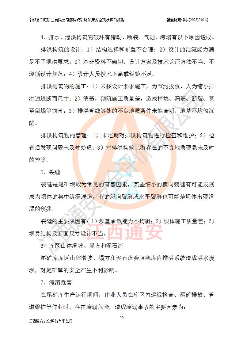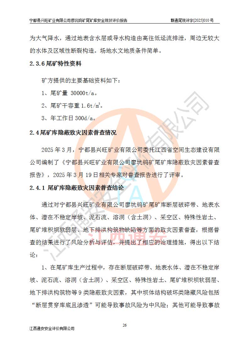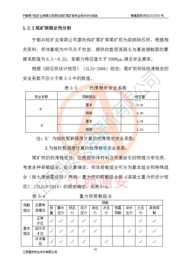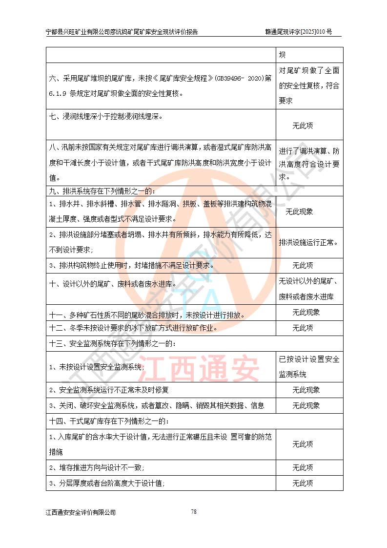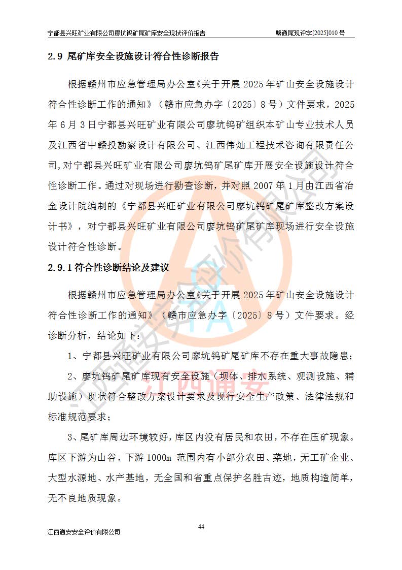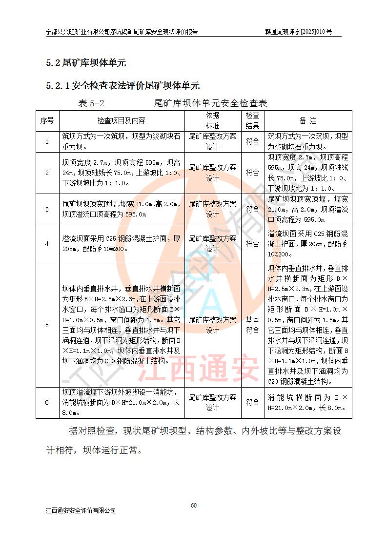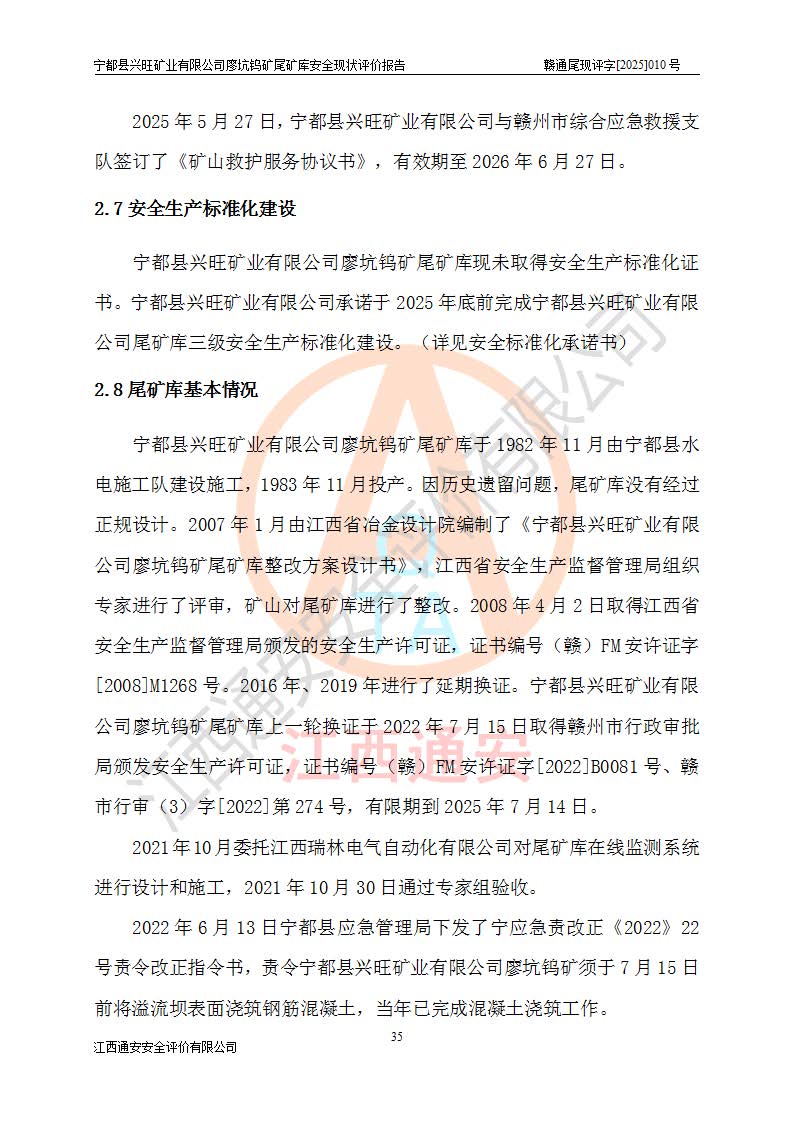 宁都县兴旺矿业有限公司廖坑钨矿位于宁都县县城北西直距约15km处的安福乡西甲村,地理坐标:东经115°50′48″;北纬26°32′1″。宁都县兴旺矿业有限公司成立于2006年03月29日,统一社会信用代码为91360730787253633E,企业类型为有限责任公司(自然人投资或控股),企业注册地位于江西省赣州市宁都县安福乡西甲村,法定**人为曾德强,注册资本为1915万元人民币,所属行业为有色金属矿采选业,经营范围包括钨砂开采及废砂石加工、销售。 廖坑钨矿尾矿库位于宁都县安福乡西甲村、选矿厂东面约1.17Km的下游沟谷中,选矿厂年生产工作日300d,尾矿堆积干容重1.60 t/m3。尾矿库汇水面积1.927km2,尾矿坝为浆砌块石重力坝,坝顶高程595.0m,清基后坝底高程为571.0m,坝高24.0m,坝顶宽度2.7m,坝顶轴线长75.0m;上游坝坡1:0,下游坝坡1:1.0。尾矿从库尾进行排放,设计总库容8.5×104m3,服务年限10.9年。尾矿库总占地面积约21.0亩。为山谷型五等库。 该尾矿库于1982年11月由宁都县水电施工队建设施工,1983年11月投产,2007年1月由江西省冶金设计院编制了《宁都县兴旺矿业有限公司廖坑钨矿尾矿库整改方案设计》,2008年4月2日取得江西省安全生产监督管理局颁发的安全生产许可证,证书编号(赣)FM安许证字[2008]M1268号。2022年江西通安安全评价有限公司编制了安全现状评价报告,2022年7月15日由赣州市行政审批局下发了安全生产许可证,证号(赣)FM安许证字[2022]B0081号,(赣市行审证(3)字[2022]第274号),**期至2025年7月14日。 依照《非煤矿矿山企业安全生产许可证延期换证工作》的通知,根据***《安全生产许可证条例》、《江西省安全生产条例》、《非煤矿山安全生产许可证实施办法》、《江西省非煤矿矿山企业安全生产许可证办法》规定及非煤矿山安全评价导则的要求,受宁都县兴旺矿业有限公司的委托,我公司承担廖坑钨矿尾矿库延期换证的安全现状评价工作。 |