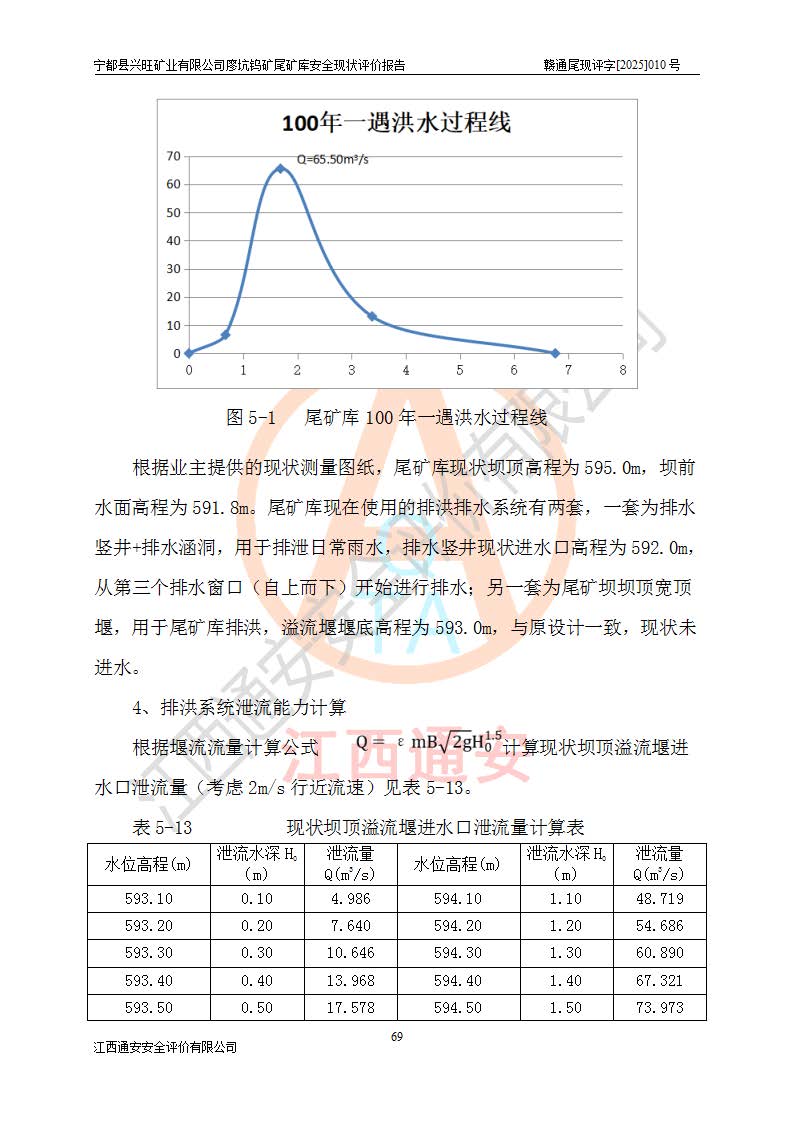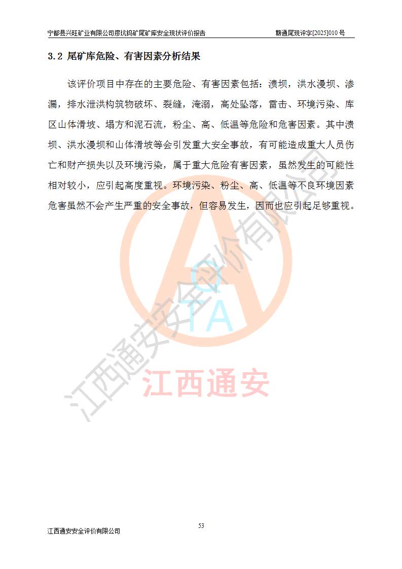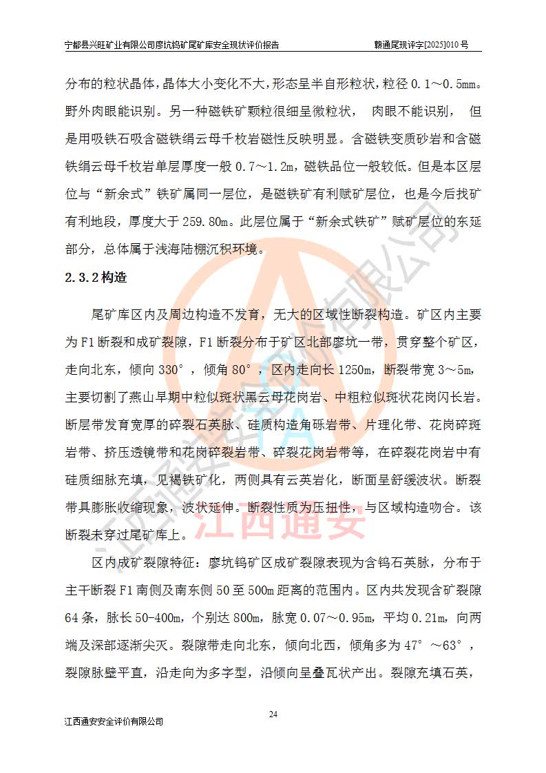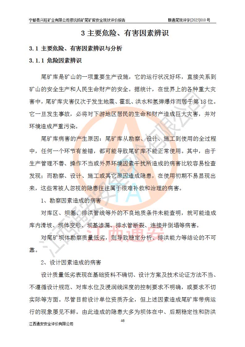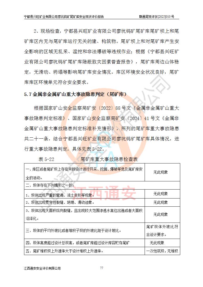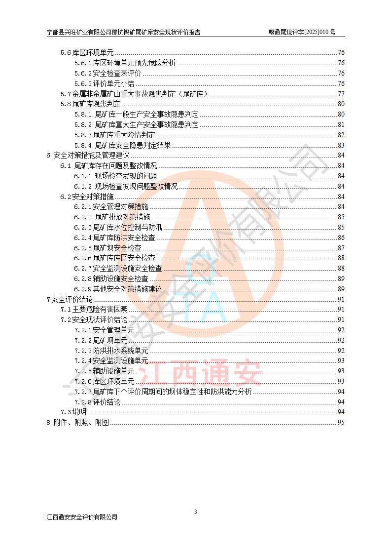 宁都县兴旺矿业有限公司廖坑钨矿位于宁都县县城北西直距约15km处的安福乡西甲村,地理坐标:东经115°50′48″;北纬26°32′1″。宁都县兴旺矿业有限公司成立于2006年03月29日,统一社会信用代码为91360730787253633E,企业类型为有限责任公司(自然人投资或控股),企业注册地位于江西省赣州市宁都县安福乡西甲村,法定**人为曾德强,注册资本为1915万元人民币,所属行业为有色金属矿采选业,经营范围包括钨砂开采及废砂石加工、销售。 廖坑钨矿尾矿库位于宁都县安福乡西甲村、选矿厂东面约1.17Km的下游沟谷中,选矿厂年生产工作日300d,尾矿堆积干容重1.60 t/m3。尾矿库汇水面积1.927km2,尾矿坝为浆砌块石重力坝,坝顶高程595.0m,清基后坝底高程为571.0m,坝高24.0m,坝顶宽度2.7m,坝顶轴线长75.0m;上游坝坡1:0,下游坝坡1:1.0。尾矿从库尾进行排放,设计总库容8.5×104m3,服务年限10.9年。尾矿库总占地面积约21.0亩。为山谷型五等库。 该尾矿库于1982年11月由宁都县水电施工队建设施工,1983年11月投产,2007年1月由江西省冶金设计院编制了《宁都县兴旺矿业有限公司廖坑钨矿尾矿库整改方案设计》,2008年4月2日取得江西省安全生产监督管理局颁发的安全生产许可证,证书编号(赣)FM安许证字[2008]M1268号。2022年江西通安安全评价有限公司编制了安全现状评价报告,2022年7月15日由赣州市行政审批局下发了安全生产许可证,证号(赣)FM安许证字[2022]B0081号,(赣市行审证(3)字[2022]第274号),**期至2025年7月14日。 依照《非煤矿矿山企业安全生产许可证延期换证工作》的通知,根据***《安全生产许可证条例》、《江西省安全生产条例》、《非煤矿山安全生产许可证实施办法》、《江西省非煤矿矿山企业安全生产许可证办法》规定及非煤矿山安全评价导则的要求,受宁都县兴旺矿业有限公司的委托,我公司承担廖坑钨矿尾矿库延期换证的安全现状评价工作。 |