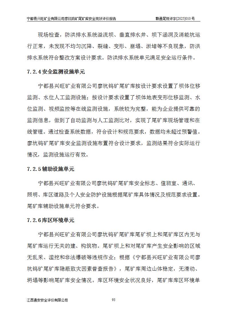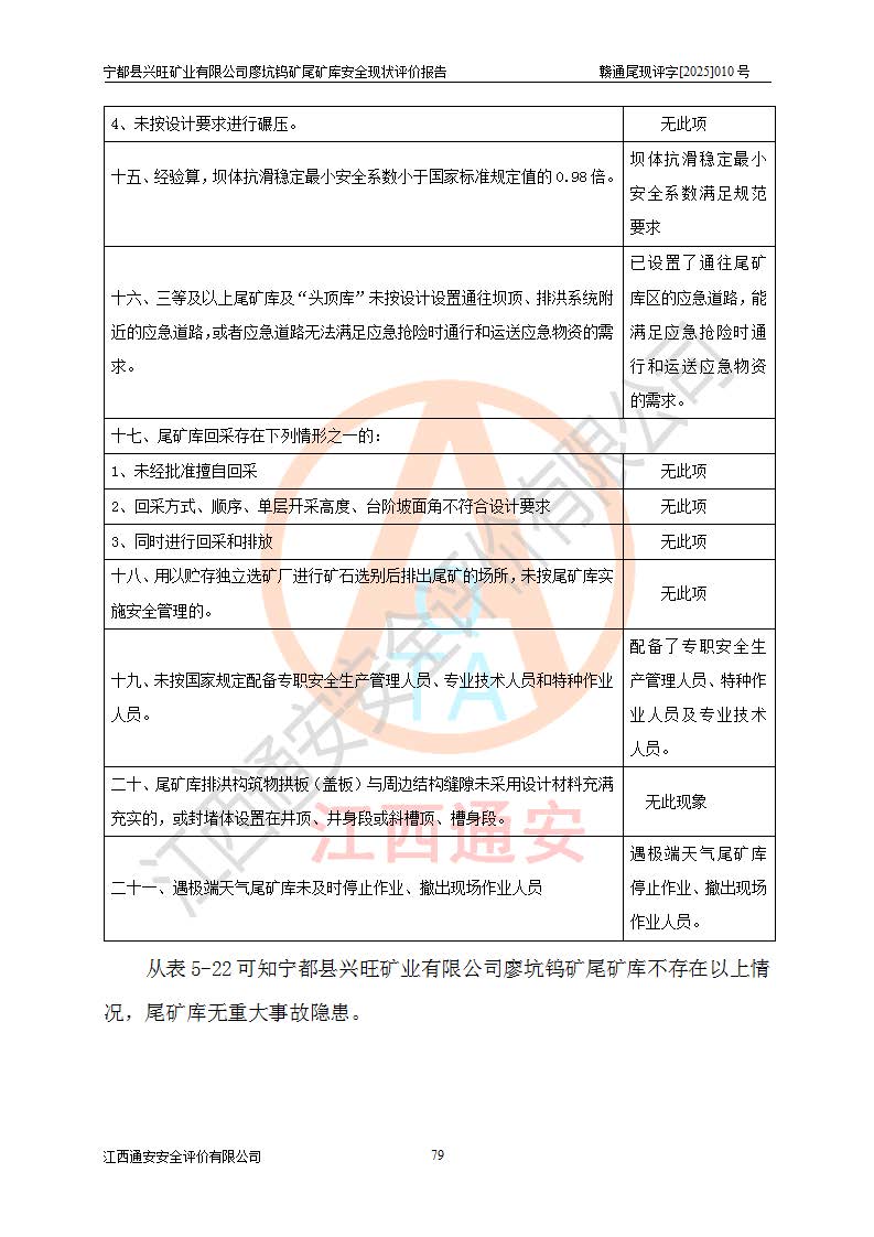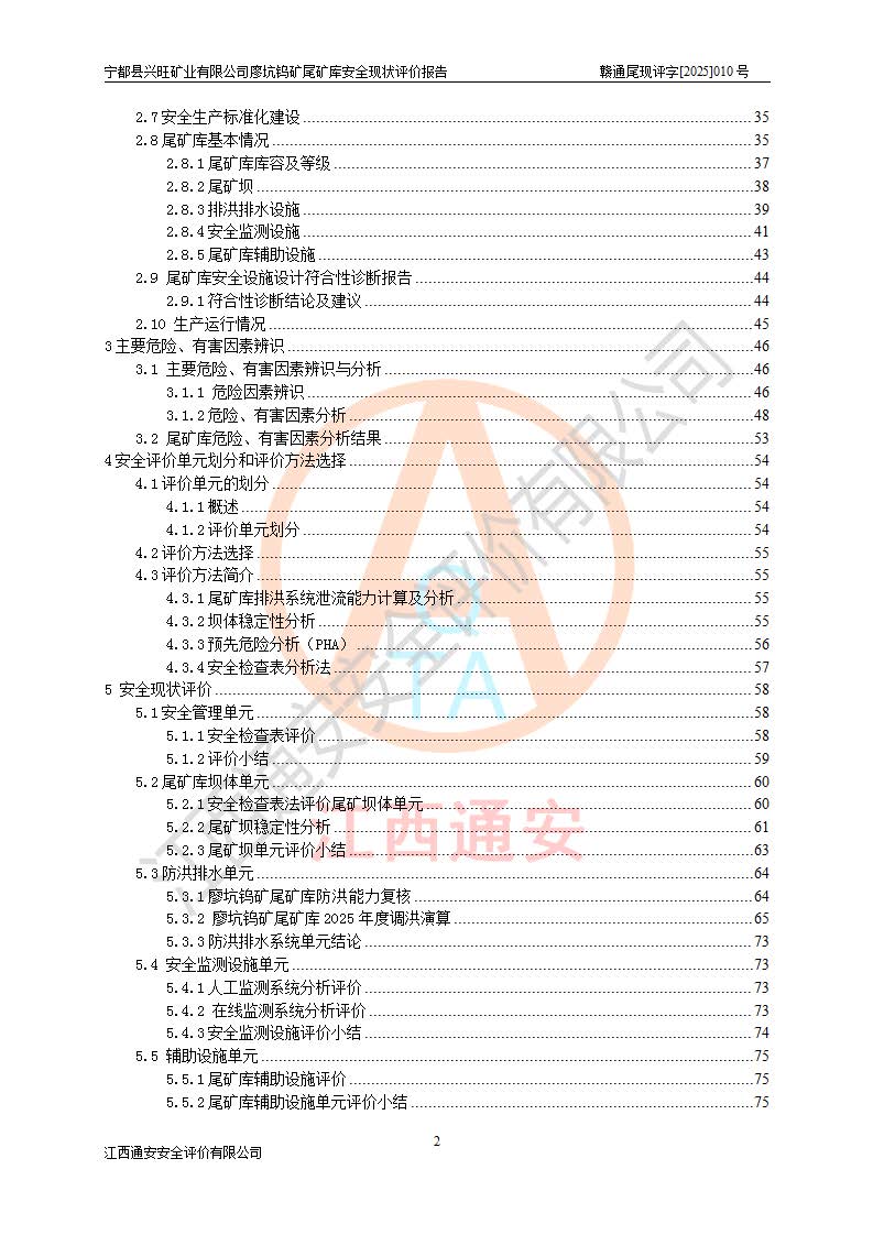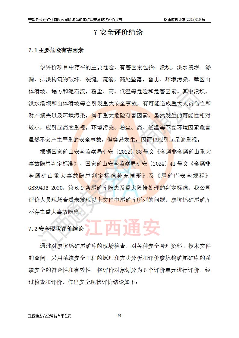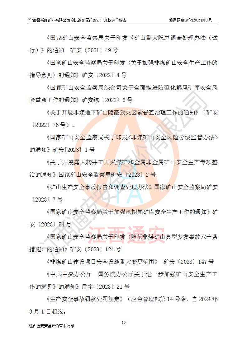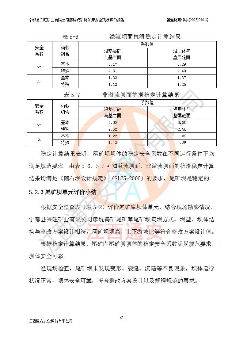 宁都县兴旺矿业有限公司廖坑钨矿位于宁都县县城北西直距约15km处的安福乡西甲村,地理坐标:东经115°50′48″;北纬26°32′1″。宁都县兴旺矿业有限公司成立于2006年03月29日,统一社会信用代码为91360730787253633E,企业类型为有限责任公司(自然人投资或控股),企业注册地位于江西省赣州市宁都县安福乡西甲村,法定**人为曾德强,注册资本为1915万元人民币,所属行业为有色金属矿采选业,经营范围包括钨砂开采及废砂石加工、销售。 廖坑钨矿尾矿库位于宁都县安福乡西甲村、选矿厂东面约1.17Km的下游沟谷中,选矿厂年生产工作日300d,尾矿堆积干容重1.60 t/m3。尾矿库汇水面积1.927km2,尾矿坝为浆砌块石重力坝,坝顶高程595.0m,清基后坝底高程为571.0m,坝高24.0m,坝顶宽度2.7m,坝顶轴线长75.0m;上游坝坡1:0,下游坝坡1:1.0。尾矿从库尾进行排放,设计总库容8.5×104m3,服务年限10.9年。尾矿库总占地面积约21.0亩。为山谷型五等库。 该尾矿库于1982年11月由宁都县水电施工队建设施工,1983年11月投产,2007年1月由江西省冶金设计院编制了《宁都县兴旺矿业有限公司廖坑钨矿尾矿库整改方案设计》,2008年4月2日取得江西省安全生产监督管理局颁发的安全生产许可证,证书编号(赣)FM安许证字[2008]M1268号。2022年江西通安安全评价有限公司编制了安全现状评价报告,2022年7月15日由赣州市行政审批局下发了安全生产许可证,证号(赣)FM安许证字[2022]B0081号,(赣市行审证(3)字[2022]第274号),**期至2025年7月14日。 依照《非煤矿矿山企业安全生产许可证延期换证工作》的通知,根据***《安全生产许可证条例》、《江西省安全生产条例》、《非煤矿山安全生产许可证实施办法》、《江西省非煤矿矿山企业安全生产许可证办法》规定及非煤矿山安全评价导则的要求,受宁都县兴旺矿业有限公司的委托,我公司承担廖坑钨矿尾矿库延期换证的安全现状评价工作。 |