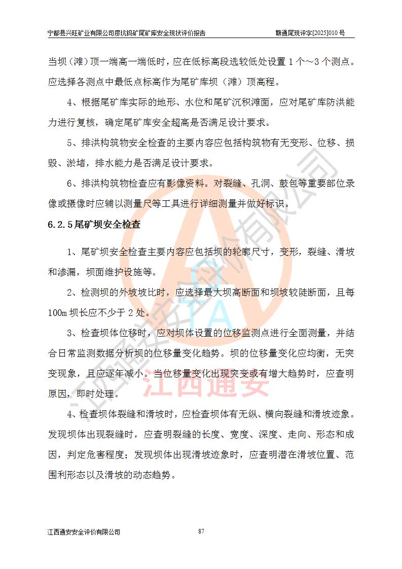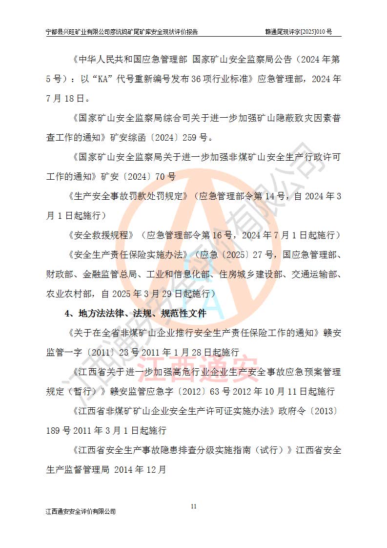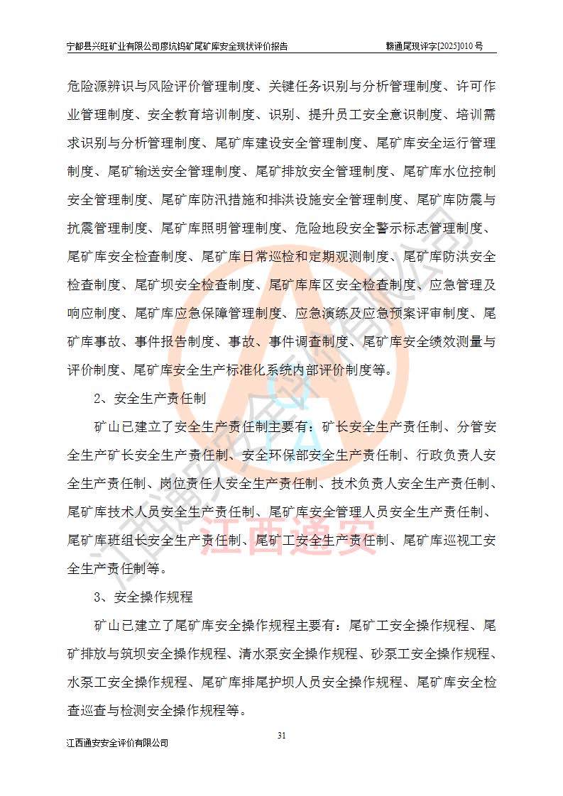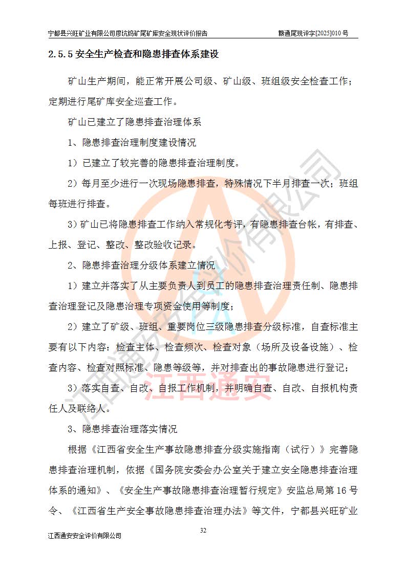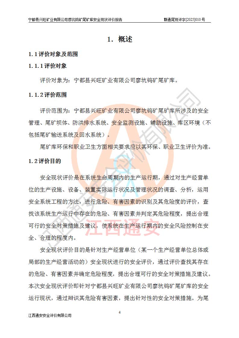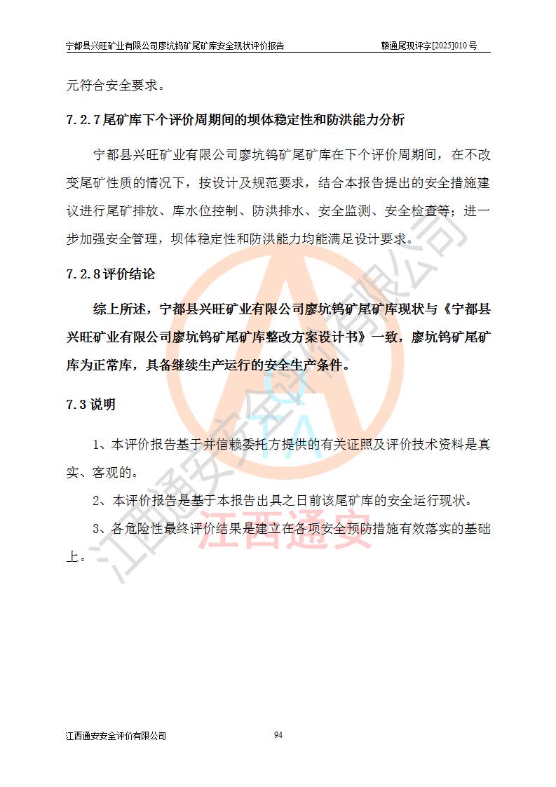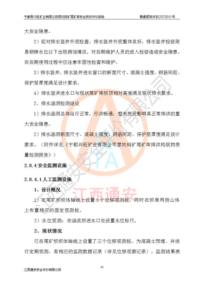 宁都县兴旺矿业有限公司廖坑钨矿位于宁都县县城北西直距约15km处的安福乡西甲村,地理坐标:东经115°50′48″;北纬26°32′1″。宁都县兴旺矿业有限公司成立于2006年03月29日,统一社会信用代码为91360730787253633E,企业类型为有限责任公司(自然人投资或控股),企业注册地位于江西省赣州市宁都县安福乡西甲村,法定**人为曾德强,注册资本为1915万元人民币,所属行业为有色金属矿采选业,经营范围包括钨砂开采及废砂石加工、销售。 廖坑钨矿尾矿库位于宁都县安福乡西甲村、选矿厂东面约1.17Km的下游沟谷中,选矿厂年生产工作日300d,尾矿堆积干容重1.60 t/m3。尾矿库汇水面积1.927km2,尾矿坝为浆砌块石重力坝,坝顶高程595.0m,清基后坝底高程为571.0m,坝高24.0m,坝顶宽度2.7m,坝顶轴线长75.0m;上游坝坡1:0,下游坝坡1:1.0。尾矿从库尾进行排放,设计总库容8.5×104m3,服务年限10.9年。尾矿库总占地面积约21.0亩。为山谷型五等库。 该尾矿库于1982年11月由宁都县水电施工队建设施工,1983年11月投产,2007年1月由江西省冶金设计院编制了《宁都县兴旺矿业有限公司廖坑钨矿尾矿库整改方案设计》,2008年4月2日取得江西省安全生产监督管理局颁发的安全生产许可证,证书编号(赣)FM安许证字[2008]M1268号。2022年江西通安安全评价有限公司编制了安全现状评价报告,2022年7月15日由赣州市行政审批局下发了安全生产许可证,证号(赣)FM安许证字[2022]B0081号,(赣市行审证(3)字[2022]第274号),**期至2025年7月14日。 依照《非煤矿矿山企业安全生产许可证延期换证工作》的通知,根据***《安全生产许可证条例》、《江西省安全生产条例》、《非煤矿山安全生产许可证实施办法》、《江西省非煤矿矿山企业安全生产许可证办法》规定及非煤矿山安全评价导则的要求,受宁都县兴旺矿业有限公司的委托,我公司承担廖坑钨矿尾矿库延期换证的安全现状评价工作。 |