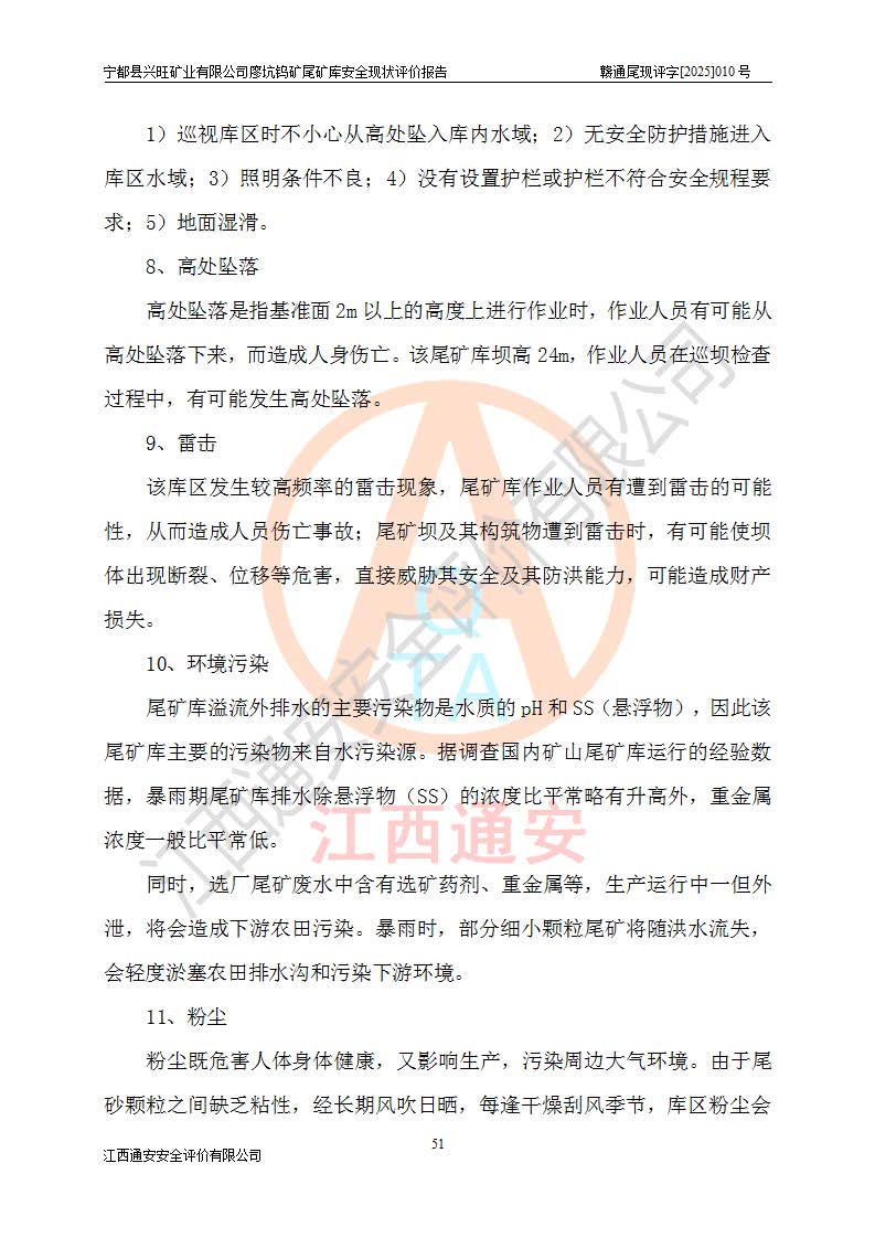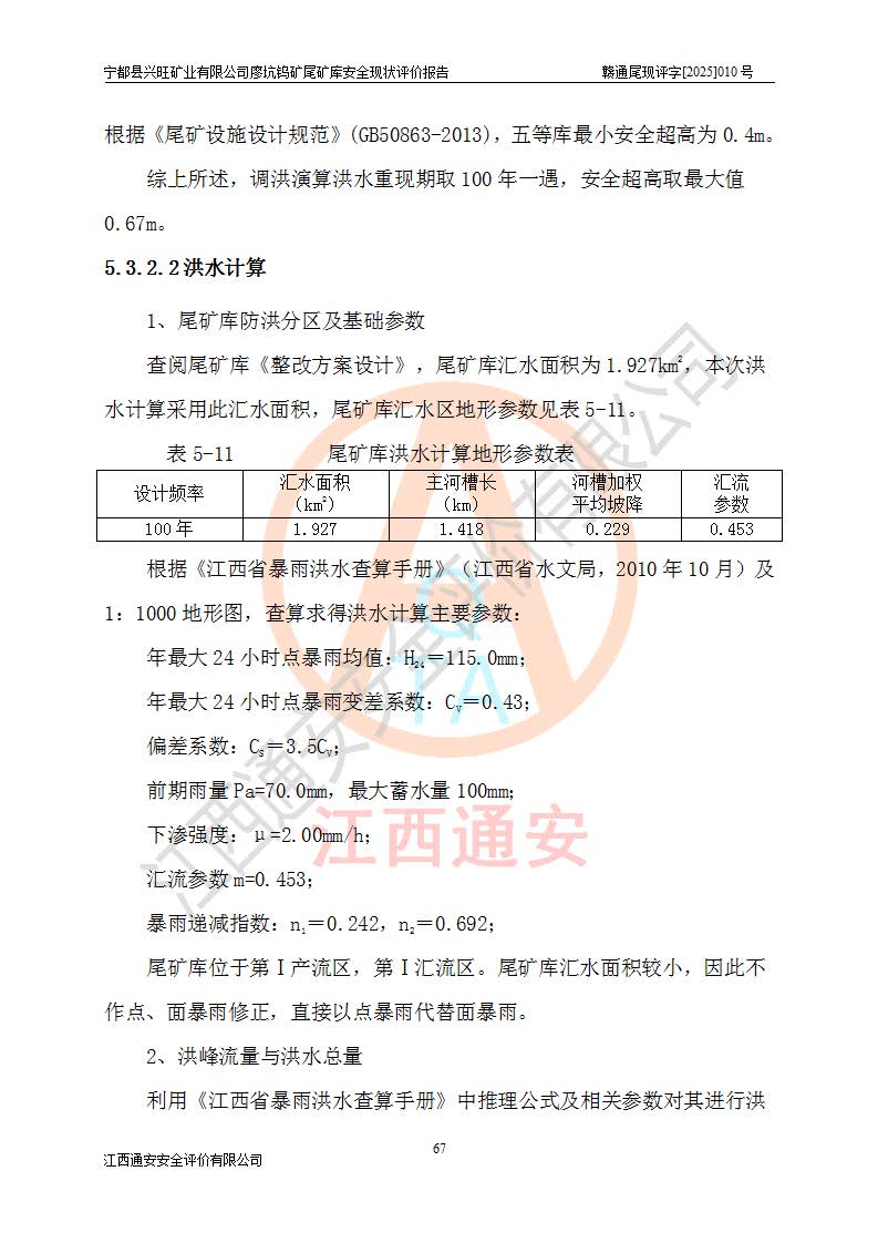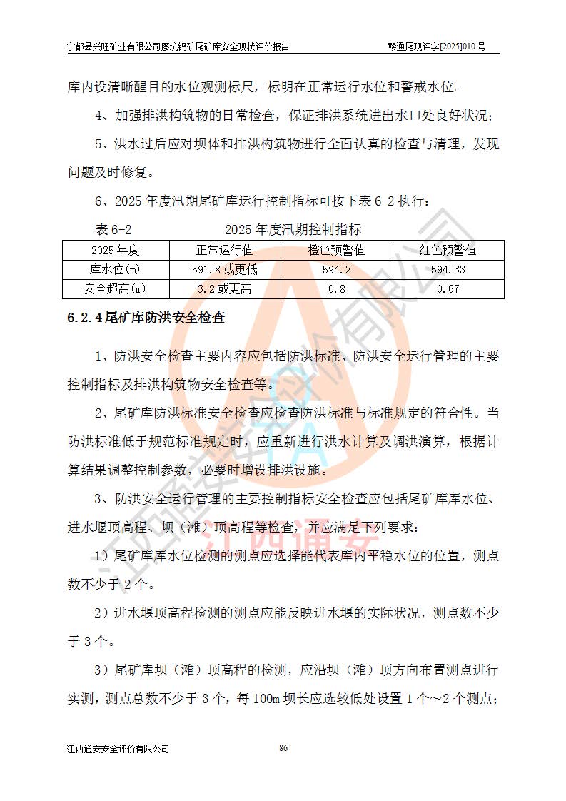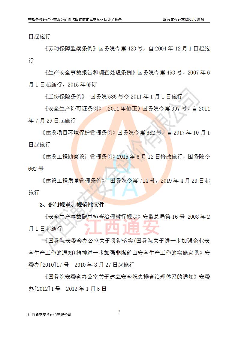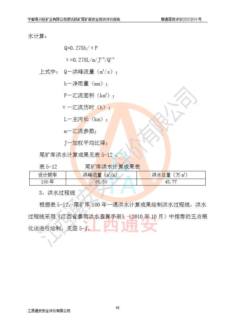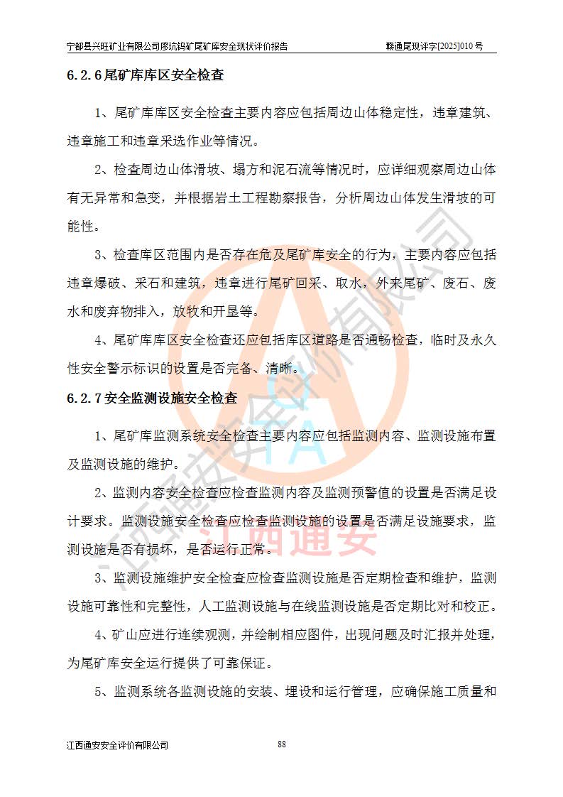 宁都县兴旺矿业有限公司廖坑钨矿位于宁都县县城北西直距约15km处的安福乡西甲村,地理坐标:东经115°50′48″;北纬26°32′1″。宁都县兴旺矿业有限公司成立于2006年03月29日,统一社会信用代码为91360730787253633E,企业类型为有限责任公司(自然人投资或控股),企业注册地位于江西省赣州市宁都县安福乡西甲村,法定**人为曾德强,注册资本为1915万元人民币,所属行业为有色金属矿采选业,经营范围包括钨砂开采及废砂石加工、销售。 廖坑钨矿尾矿库位于宁都县安福乡西甲村、选矿厂东面约1.17Km的下游沟谷中,选矿厂年生产工作日300d,尾矿堆积干容重1.60 t/m3。尾矿库汇水面积1.927km2,尾矿坝为浆砌块石重力坝,坝顶高程595.0m,清基后坝底高程为571.0m,坝高24.0m,坝顶宽度2.7m,坝顶轴线长75.0m;上游坝坡1:0,下游坝坡1:1.0。尾矿从库尾进行排放,设计总库容8.5×104m3,服务年限10.9年。尾矿库总占地面积约21.0亩。为山谷型五等库。 该尾矿库于1982年11月由宁都县水电施工队建设施工,1983年11月投产,2007年1月由江西省冶金设计院编制了《宁都县兴旺矿业有限公司廖坑钨矿尾矿库整改方案设计》,2008年4月2日取得江西省安全生产监督管理局颁发的安全生产许可证,证书编号(赣)FM安许证字[2008]M1268号。2022年江西通安安全评价有限公司编制了安全现状评价报告,2022年7月15日由赣州市行政审批局下发了安全生产许可证,证号(赣)FM安许证字[2022]B0081号,(赣市行审证(3)字[2022]第274号),**期至2025年7月14日。 依照《非煤矿矿山企业安全生产许可证延期换证工作》的通知,根据***《安全生产许可证条例》、《江西省安全生产条例》、《非煤矿山安全生产许可证实施办法》、《江西省非煤矿矿山企业安全生产许可证办法》规定及非煤矿山安全评价导则的要求,受宁都县兴旺矿业有限公司的委托,我公司承担廖坑钨矿尾矿库延期换证的安全现状评价工作。 |