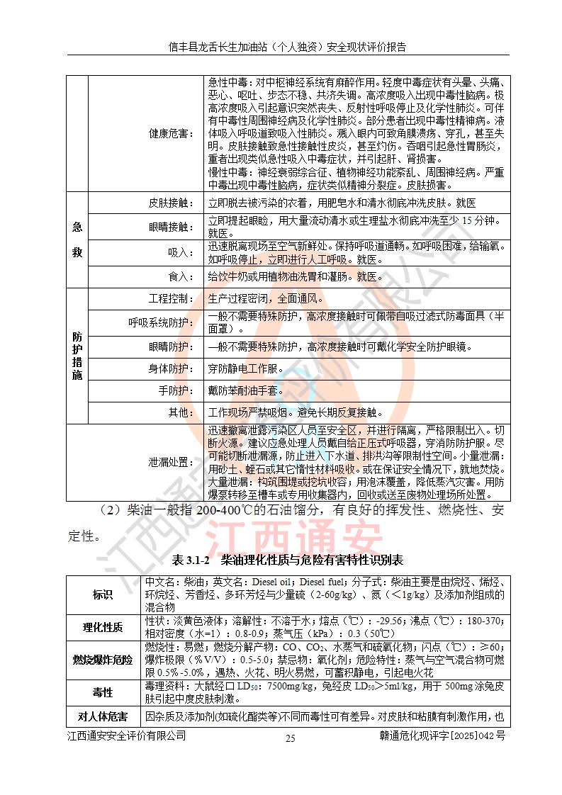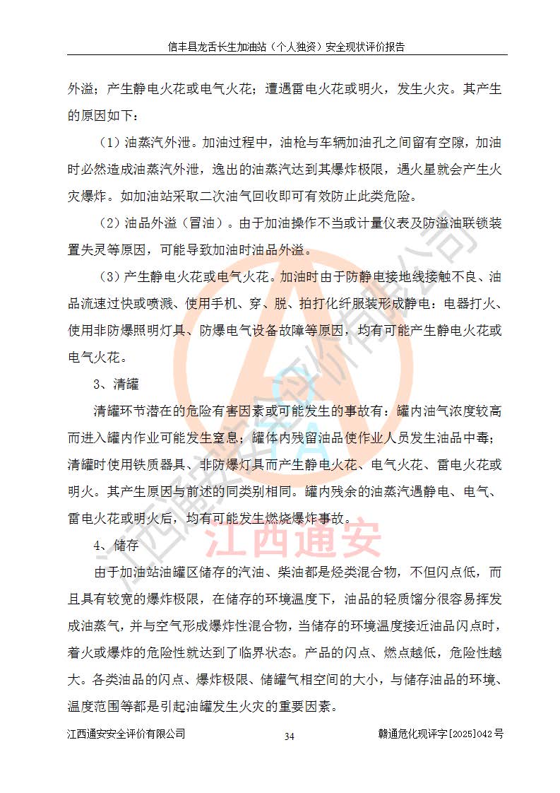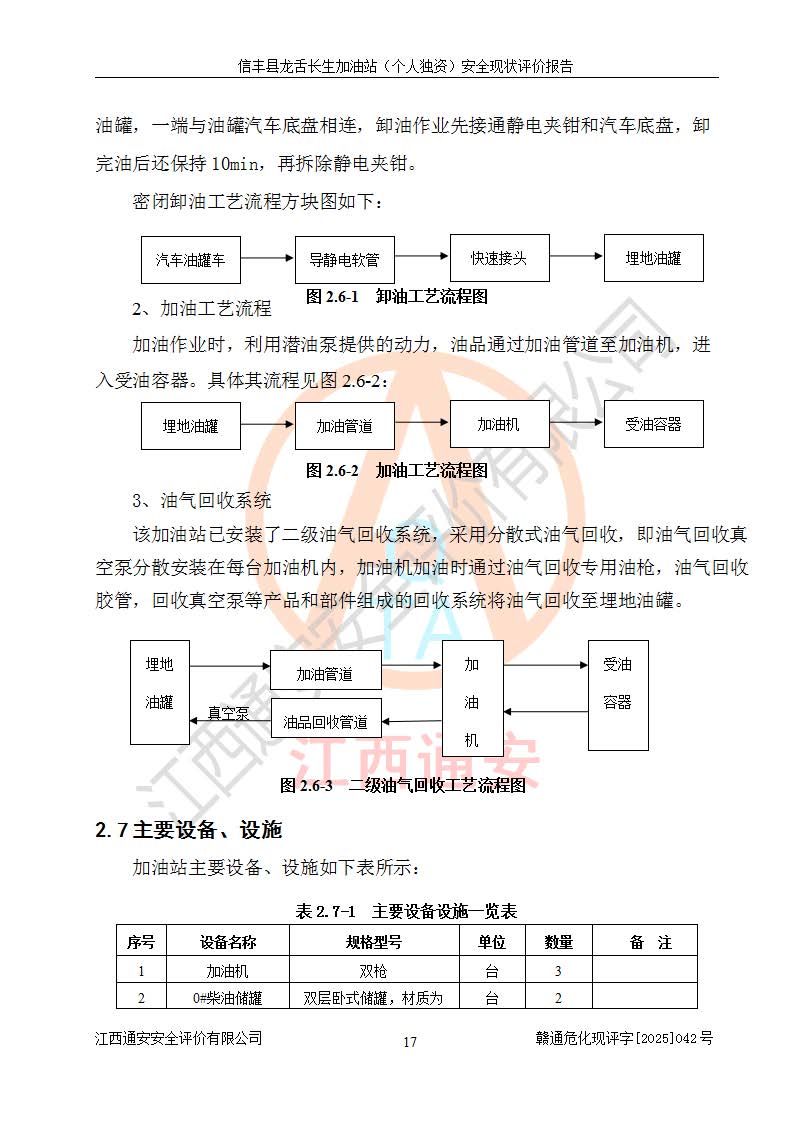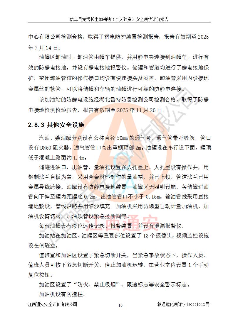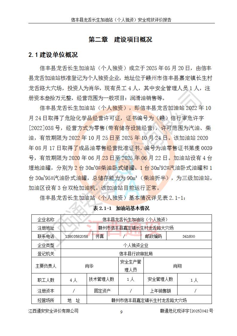 项目简介 | 信丰县龙舌长生加油站(个人独资)成立于2025年05月20日,由信丰县龙舌加油站核准登记为个人独资企业,地址位于赣州市信丰县嘉定镇长生村龙舌路大穴场,投资人为肖华,现有员工4人,其中安全管理人员1人,注册资本叁拾万元整,经营范围为一般项目:润滑油销售等。 信丰县龙舌长生加油站(个人独资),即信丰县龙舌加油站2022年10月24日取得了危险化学品经营许可证,证书编号为(赣)信行审危许字[2022]038号,经营方式为零售,许可范围为汽油、柴油,**期限为2022年10月25日至2025年10月24日。该加油站2020年08月17日取得了成品油零售经营批准证书,编号为油零售证书第虔0039号,**期限为2020年06月23日至2025年06月22日。加油站设有4台埋地油罐,分别为2台30m30#柴油卧式储罐、1台30m392#汽油卧式油罐和1台30m395#汽油卧式油罐,总储存能力为90m³(柴油折半),为三级加油站。加油区设有3台双枪加油机。该加油站目前运行正常。 | |||