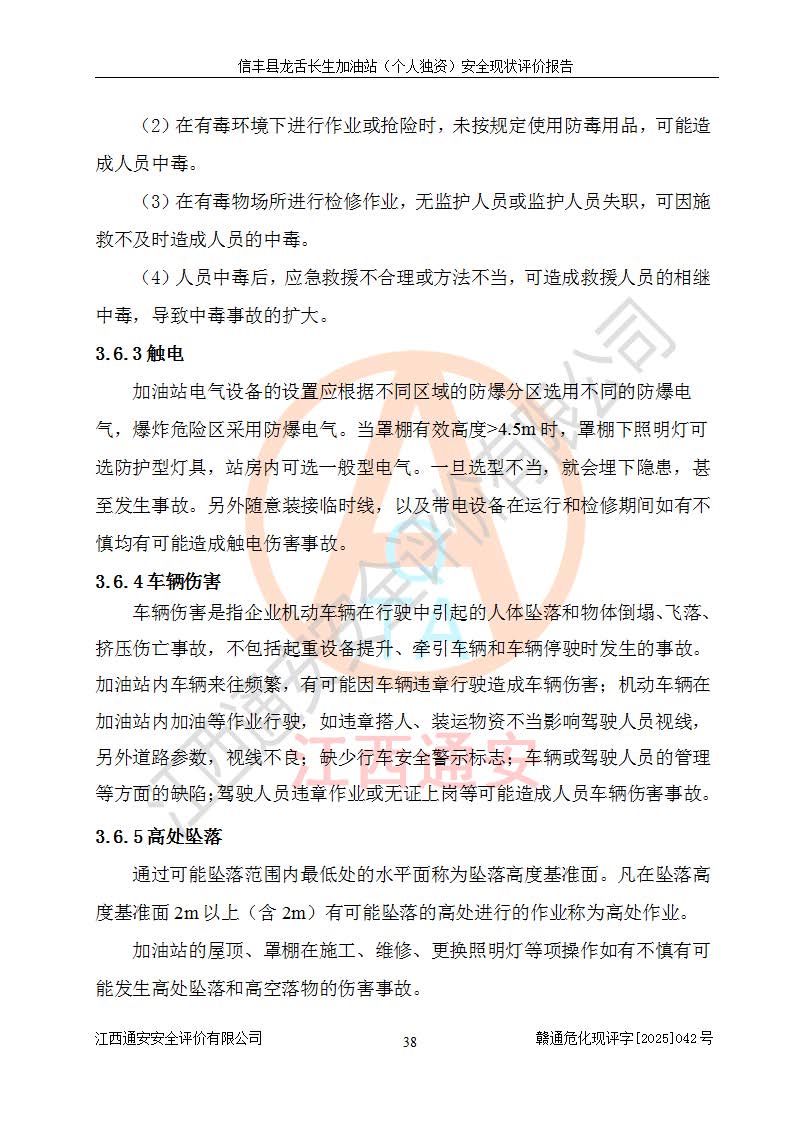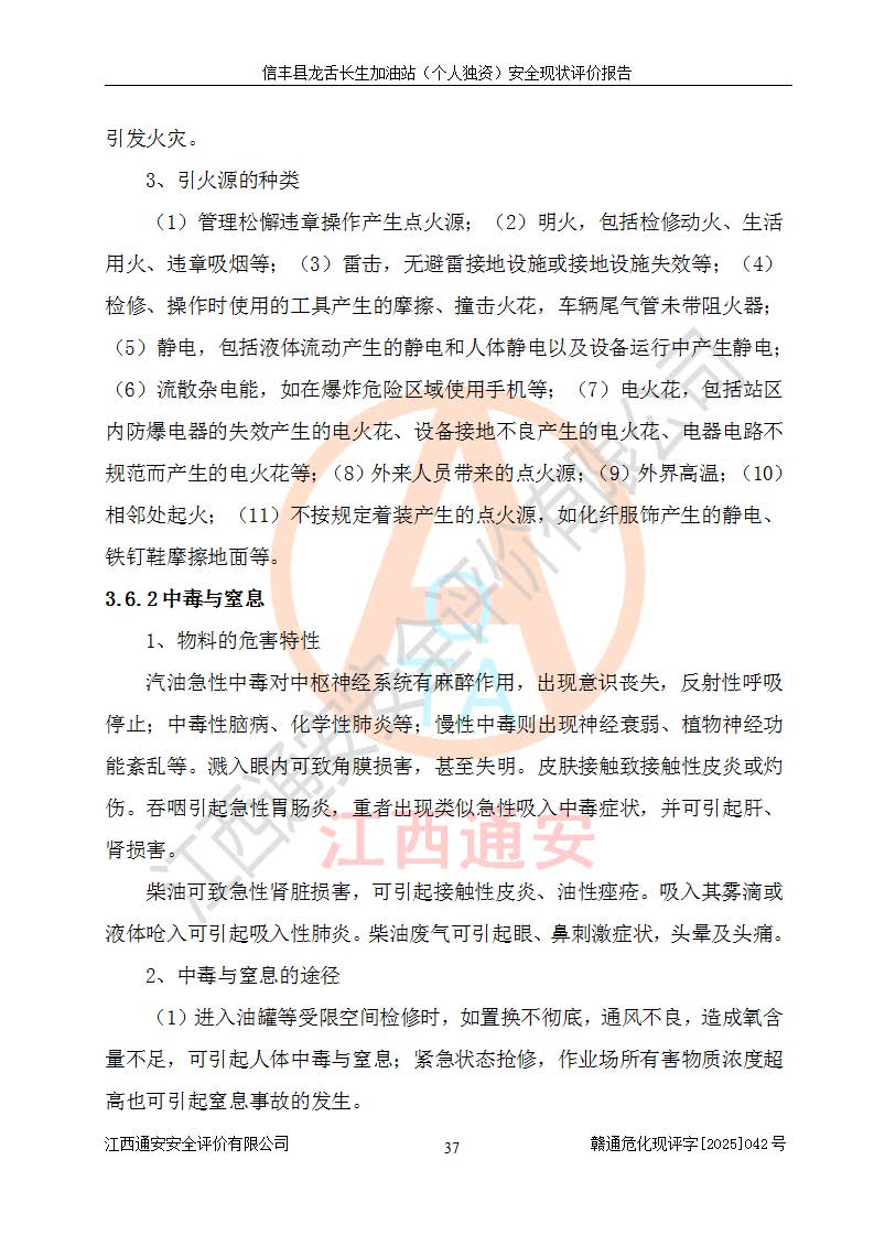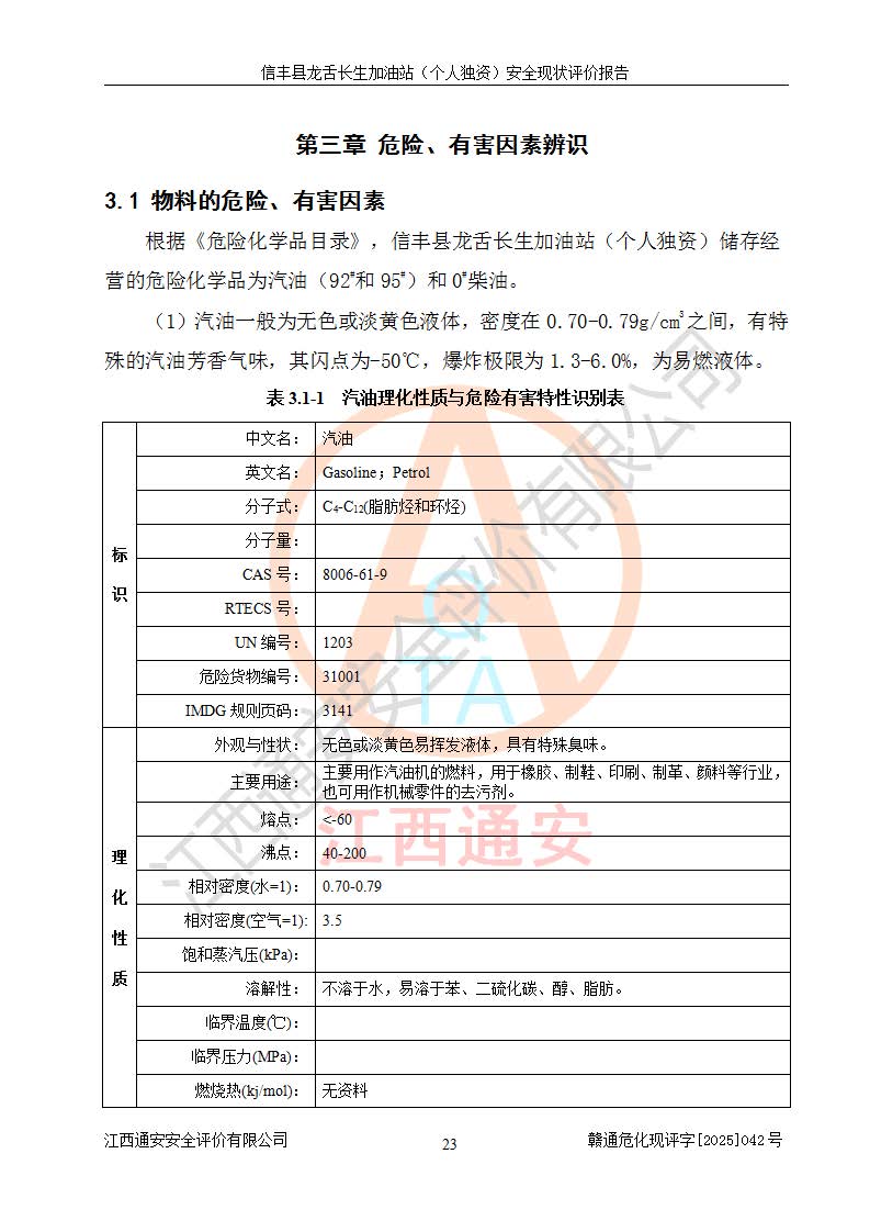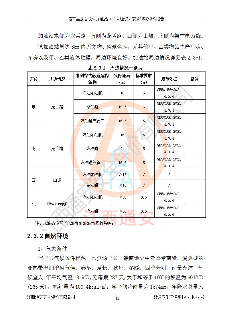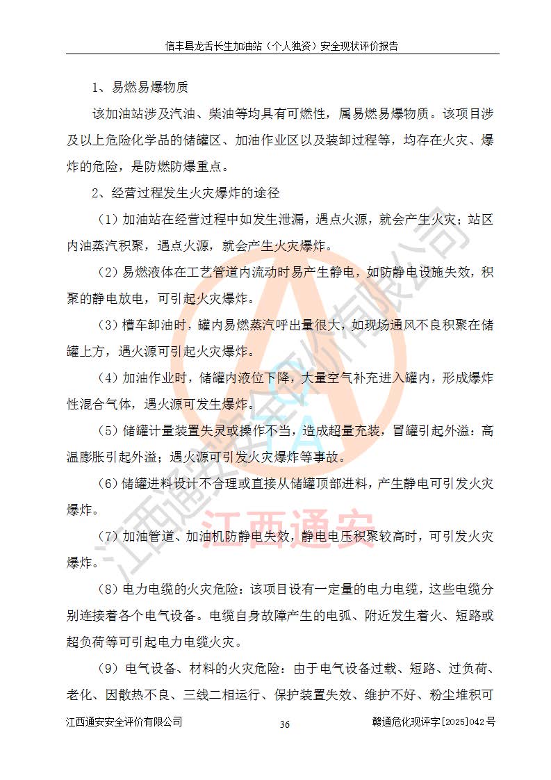 项目简介 | 信丰县龙舌长生加油站(个人独资)成立于2025年05月20日,由信丰县龙舌加油站核准登记为个人独资企业,地址位于赣州市信丰县嘉定镇长生村龙舌路大穴场,投资人为肖华,现有员工4人,其中安全管理人员1人,注册资本叁拾万元整,经营范围为一般项目:润滑油销售等。 信丰县龙舌长生加油站(个人独资),即信丰县龙舌加油站2022年10月24日取得了危险化学品经营许可证,证书编号为(赣)信行审危许字[2022]038号,经营方式为零售,许可范围为汽油、柴油,**期限为2022年10月25日至2025年10月24日。该加油站2020年08月17日取得了成品油零售经营批准证书,编号为油零售证书第虔0039号,**期限为2020年06月23日至2025年06月22日。加油站设有4台埋地油罐,分别为2台30m30#柴油卧式储罐、1台30m392#汽油卧式油罐和1台30m395#汽油卧式油罐,总储存能力为90m³(柴油折半),为三级加油站。加油区设有3台双枪加油机。该加油站目前运行正常。 | |||