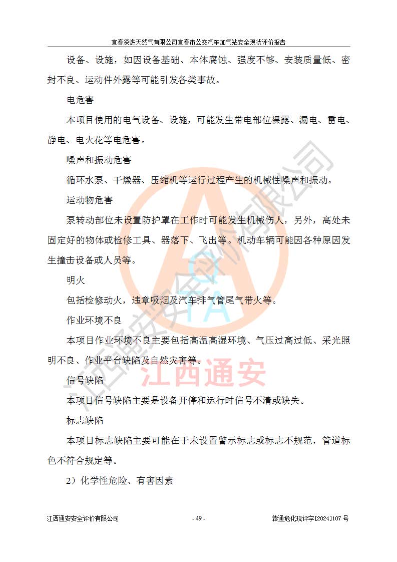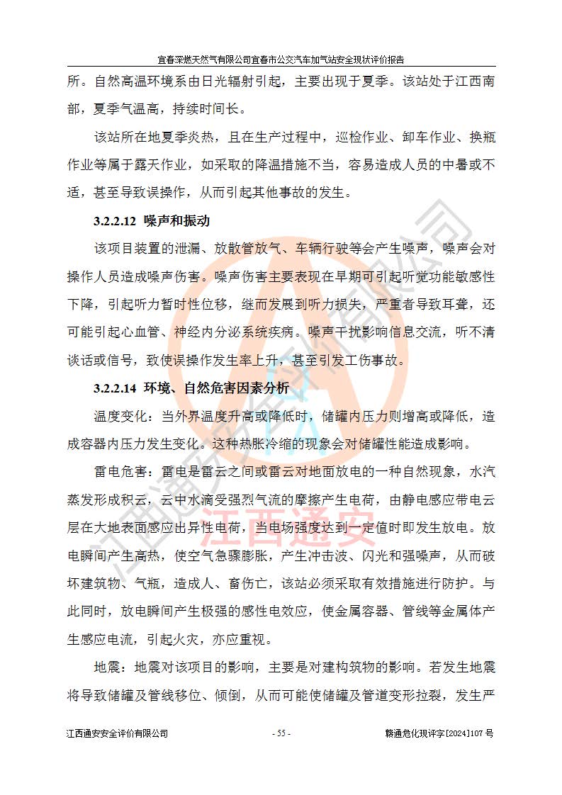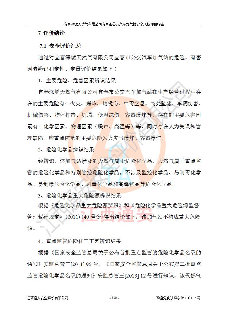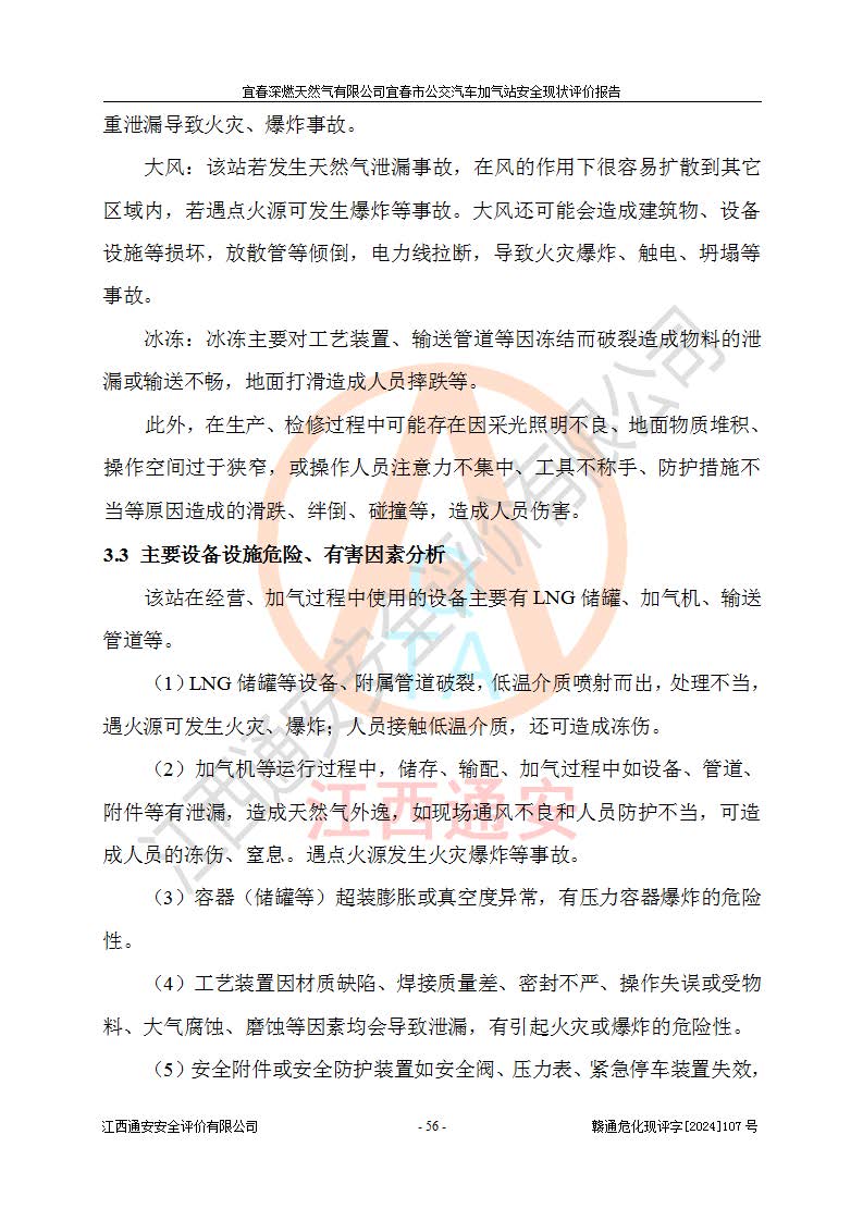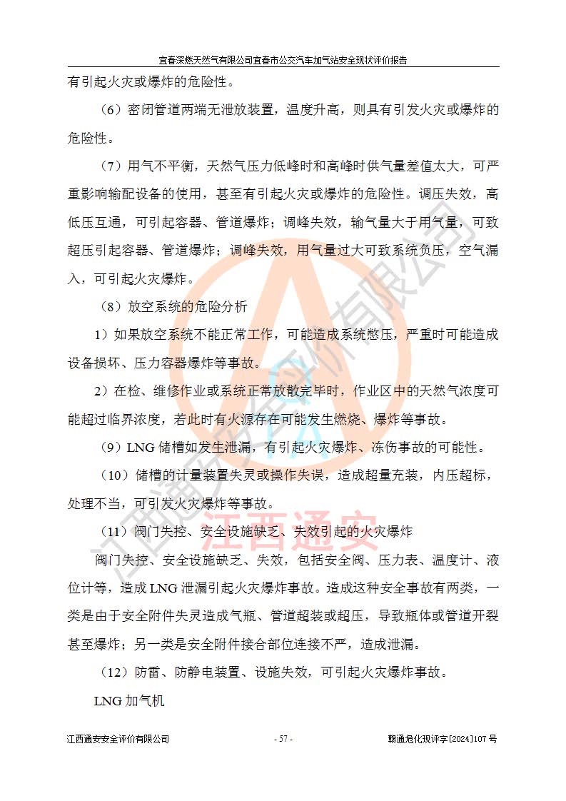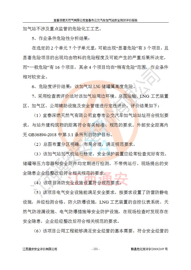 其它 | 1、主要危险、危害因素辨识结果 宜春深燃天然气有限公司宜春市公交汽车加气站在生产经营过程中存在的主要危险有:火灾、爆炸、灼烫伤、中毒窒息、高处坠落、**伤害、机械伤害、物体打击、坍塌、低温冻伤、容器爆炸等,存在的主要危害因素有:化学因素、物理因素(噪声、高温等)等,同时存在人为失误和管理缺陷。应重点防范的主要危险为火灾与爆炸、容器爆炸。 2、危险化学品辨识结果 经辨识,该加气站涉及的天然气属于危险化学品,天然气属于重点监管的危险化学品和特别管控危险化学品,不涉及监控化学品、易制毒化学品、易制爆危险化学品、剧毒化学品和高毒物品等危险化学品。 3、危险化学品重大危险源辨识结果 根据《危险化学品重大危险源辨识》和《危险化学品重大危险源监督管理暂行规定》(2011)(40号令)得出结论如下:该加气站不构成重大危险源。 4、重点监管危险化工工艺辨识结果 根据《**安全监管总局关于公布首批重点监管的危险化学品名录的通知》安监总管三[2011] 95号、《**安全监管总局关于公布第二批重点监管危险化学品名录的通知》安监总管三[2013] 12号进行辨识,该天然气加气站不涉及重点监管的危险化工工艺。 5、作业条件危险性分析结果: 在选定的2个单元7个子单元里,可能出现“显著危险”有3个项目,且显著危险项目的出现均由物料的危险程度及可能产生的严重后果所决定,而“一般危险”有16个项目,其余4个项目均在“稍有危险”范围,作业条件相对较安全。 6、危险度评价结果:该加气站LNG储罐属**危险。 7、采用检查表评价法对该加气站周边环境、总图运输、LNG工艺装置区、加气区、公用辅助设施及安全管理进行定性评价,评价结果如下: (1)宜春深燃天然气有限公司宜春市公交汽车加气站站址符合规划要求,与站外建构筑物的距离符合有关标准、规范的要求。外部安全距离内无GB36894-2018中第3.1条所列的防护目标。 (2)总图布置分区明确,布局合理,满足规范要求。 (3)该加气站加气机运行稳定,安全保护装置应经常检查完好**。储罐等压力容器和安全附件均定期进行检测,不带病运行。现场提出的安全隐患企业经整改后符合相关规范的要求。 (4)该项目消防安全设施设置符合规范要求。 (5)该项目电气安全设施能满足安全要求,按要求设置了防雷防静电设施,并经检测合格。防火防爆设施,LNG工艺装置的自控仪表系统、天然气防泄漏设施、电气防爆措施等安全防护设施,在现场检查时发现存在安全隐患,企业经经整改后符合相关规范的要求。 (6)该项目公用工程能够满足安全经营的基本需要,符合安全经营的条件。 评价结论:综合结论:宜春深燃天然气有限公司宜春市公交汽车加气站的安全设施及安全管理符合法律、法规、标准的要求,安全风险是受控制的,其风险程度是可以接受的,满足燃气经营的安全条件。