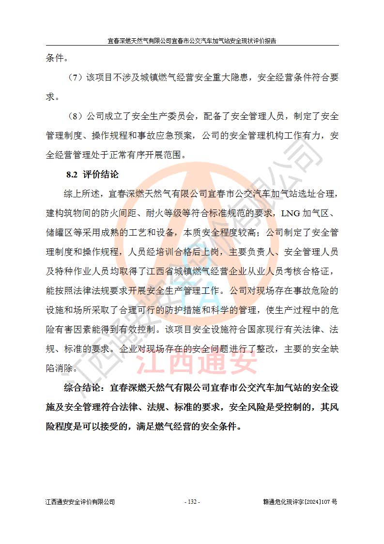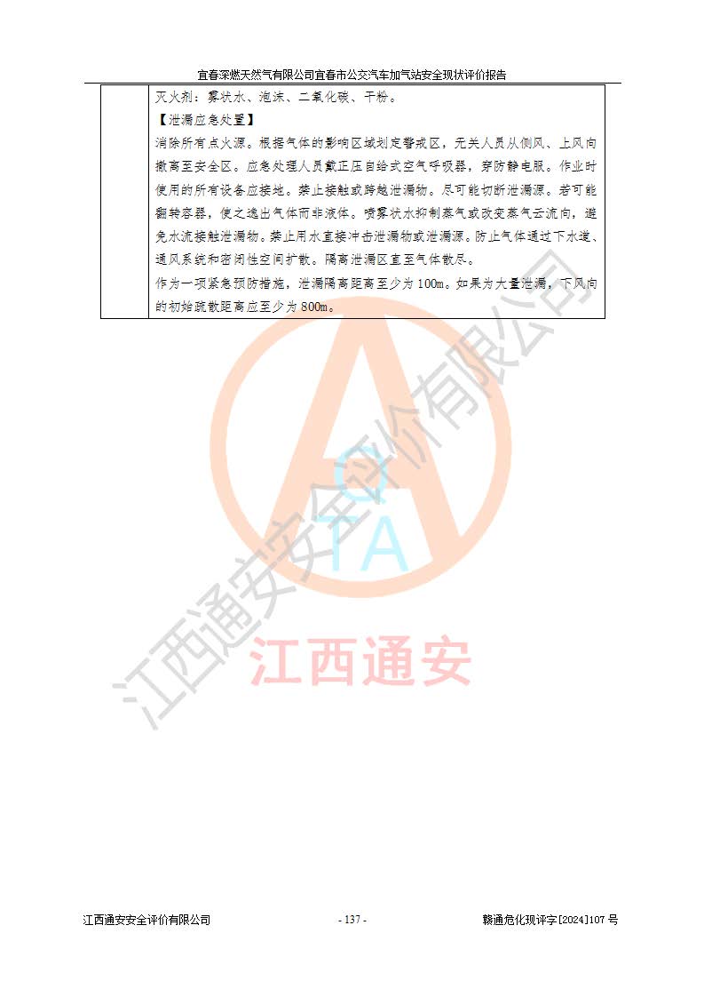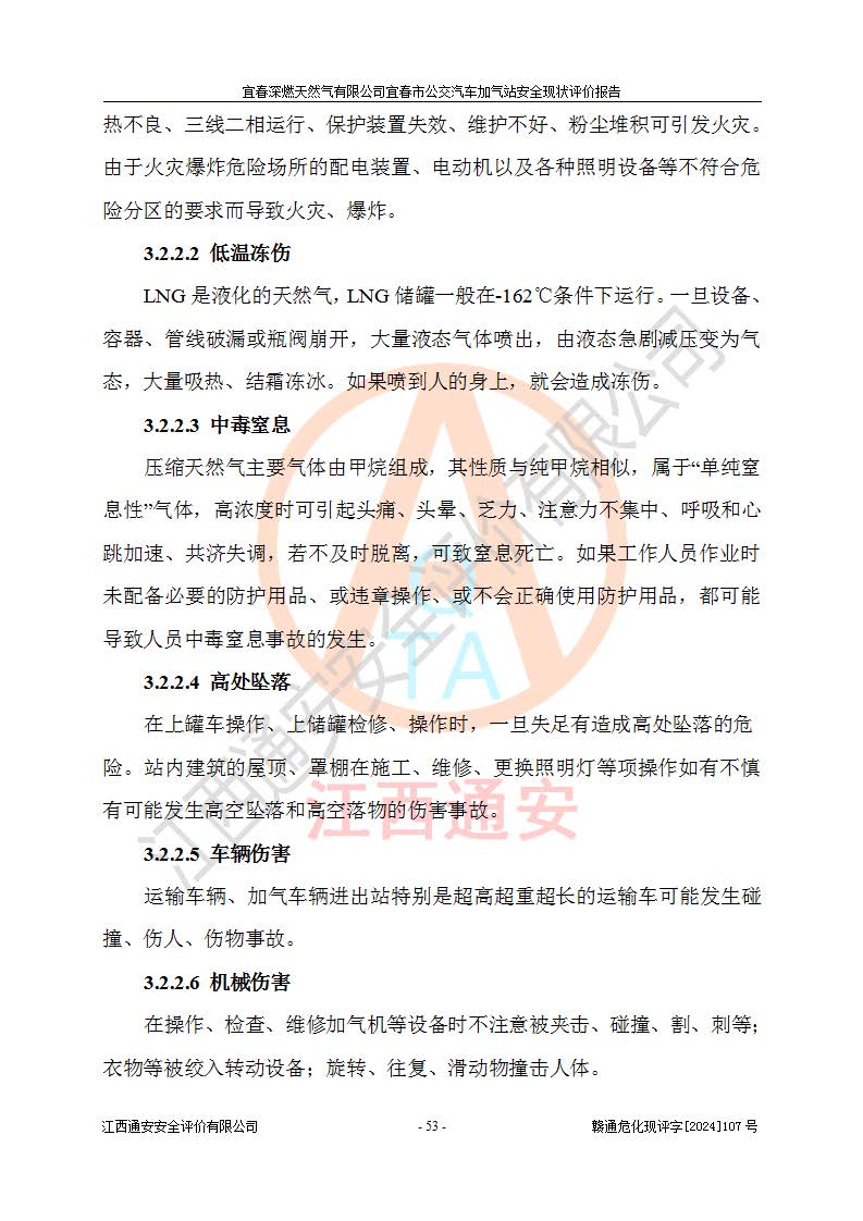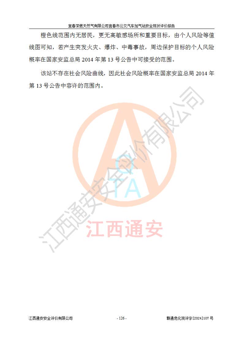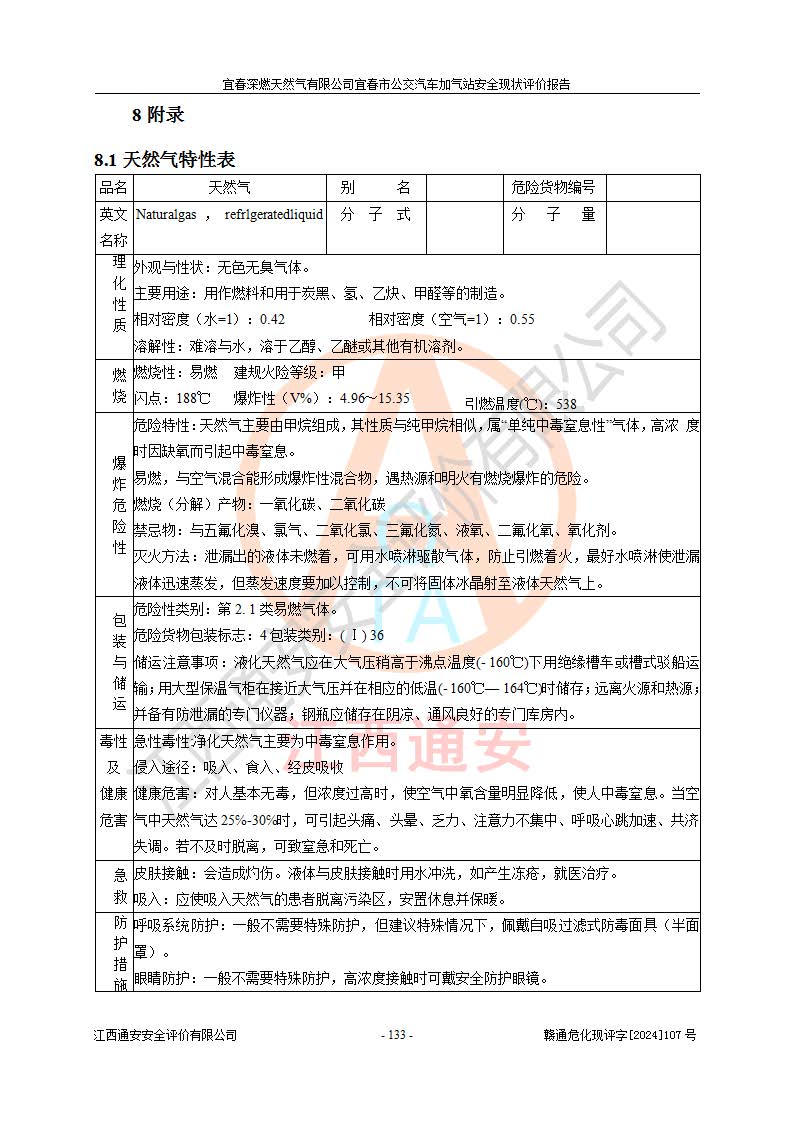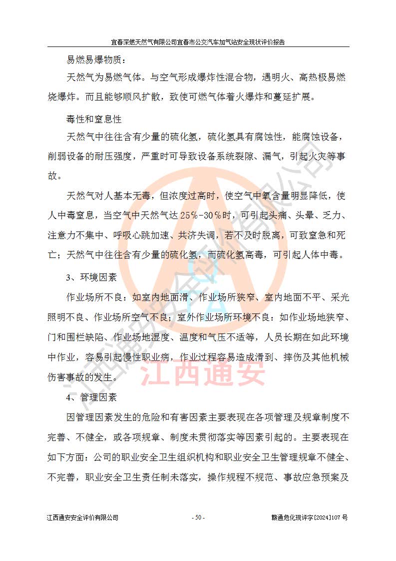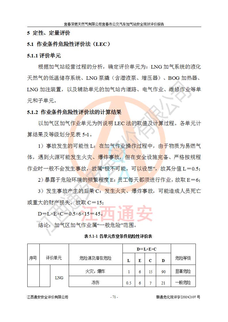 其它 | 1、主要危险、危害因素辨识结果 宜春深燃天然气有限公司宜春市公交汽车加气站在生产经营过程中存在的主要危险有:火灾、爆炸、灼烫伤、中毒窒息、高处坠落、**伤害、机械伤害、物体打击、坍塌、低温冻伤、容器爆炸等,存在的主要危害因素有:化学因素、物理因素(噪声、高温等)等,同时存在人为失误和管理缺陷。应重点防范的主要危险为火灾与爆炸、容器爆炸。 2、危险化学品辨识结果 经辨识,该加气站涉及的天然气属于危险化学品,天然气属于重点监管的危险化学品和特别管控危险化学品,不涉及监控化学品、易制毒化学品、易制爆危险化学品、剧毒化学品和高毒物品等危险化学品。 3、危险化学品重大危险源辨识结果 根据《危险化学品重大危险源辨识》和《危险化学品重大危险源监督管理暂行规定》(2011)(40号令)得出结论如下:该加气站不构成重大危险源。 4、重点监管危险化工工艺辨识结果 根据《**安全监管总局关于公布首批重点监管的危险化学品名录的通知》安监总管三[2011] 95号、《**安全监管总局关于公布第二批重点监管危险化学品名录的通知》安监总管三[2013] 12号进行辨识,该天然气加气站不涉及重点监管的危险化工工艺。 5、作业条件危险性分析结果: 在选定的2个单元7个子单元里,可能出现“显著危险”有3个项目,且显著危险项目的出现均由物料的危险程度及可能产生的严重后果所决定,而“一般危险”有16个项目,其余4个项目均在“稍有危险”范围,作业条件相对较安全。 6、危险度评价结果:该加气站LNG储罐属**危险。 7、采用检查表评价法对该加气站周边环境、总图运输、LNG工艺装置区、加气区、公用辅助设施及安全管理进行定性评价,评价结果如下: (1)宜春深燃天然气有限公司宜春市公交汽车加气站站址符合规划要求,与站外建构筑物的距离符合有关标准、规范的要求。外部安全距离内无GB36894-2018中第3.1条所列的防护目标。 (2)总图布置分区明确,布局合理,满足规范要求。 (3)该加气站加气机运行稳定,安全保护装置应经常检查完好**。储罐等压力容器和安全附件均定期进行检测,不带病运行。现场提出的安全隐患企业经整改后符合相关规范的要求。 (4)该项目消防安全设施设置符合规范要求。 (5)该项目电气安全设施能满足安全要求,按要求设置了防雷防静电设施,并经检测合格。防火防爆设施,LNG工艺装置的自控仪表系统、天然气防泄漏设施、电气防爆措施等安全防护设施,在现场检查时发现存在安全隐患,企业经经整改后符合相关规范的要求。 (6)该项目公用工程能够满足安全经营的基本需要,符合安全经营的条件。 评价结论:综合结论:宜春深燃天然气有限公司宜春市公交汽车加气站的安全设施及安全管理符合法律、法规、标准的要求,安全风险是受控制的,其风险程度是可以接受的,满足燃气经营的安全条件。