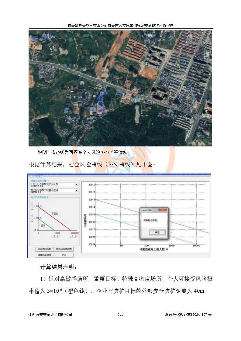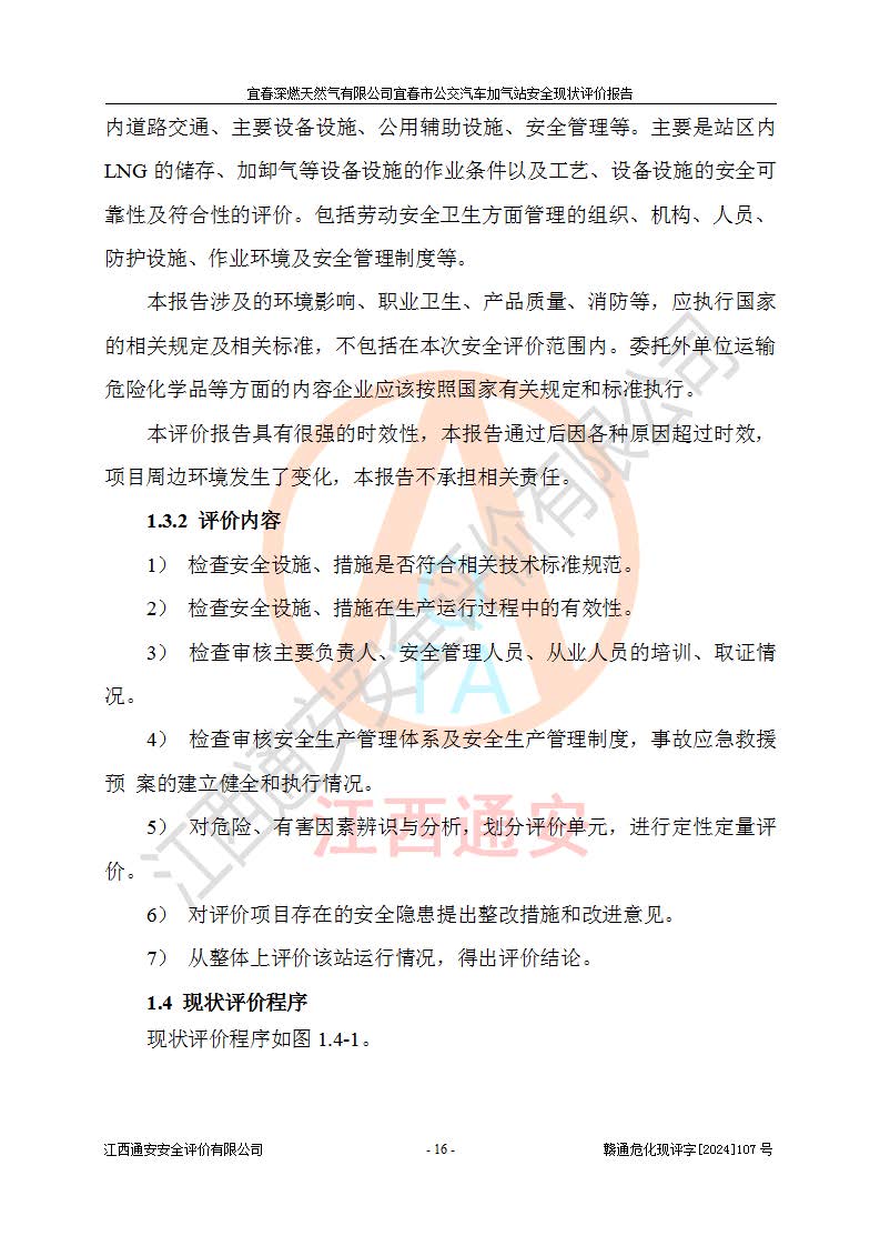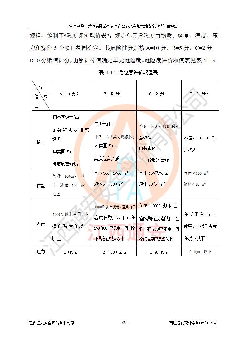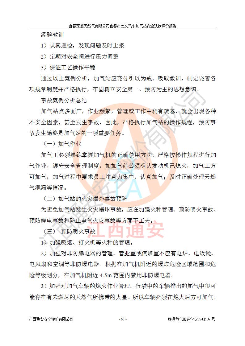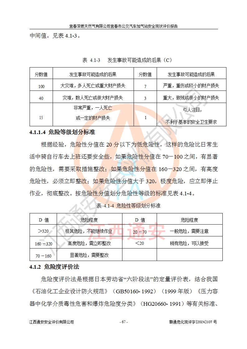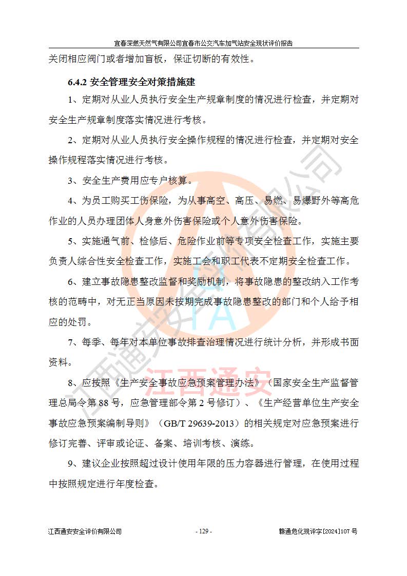 其它 | 1、主要危险、危害因素辨识结果 宜春深燃天然气有限公司宜春市公交汽车加气站在生产经营过程中存在的主要危险有:火灾、爆炸、灼烫伤、中毒窒息、高处坠落、**伤害、机械伤害、物体打击、坍塌、低温冻伤、容器爆炸等,存在的主要危害因素有:化学因素、物理因素(噪声、高温等)等,同时存在人为失误和管理缺陷。应重点防范的主要危险为火灾与爆炸、容器爆炸。 2、危险化学品辨识结果 经辨识,该加气站涉及的天然气属于危险化学品,天然气属于重点监管的危险化学品和特别管控危险化学品,不涉及监控化学品、易制毒化学品、易制爆危险化学品、剧毒化学品和高毒物品等危险化学品。 3、危险化学品重大危险源辨识结果 根据《危险化学品重大危险源辨识》和《危险化学品重大危险源监督管理暂行规定》(2011)(40号令)得出结论如下:该加气站不构成重大危险源。 4、重点监管危险化工工艺辨识结果 根据《**安全监管总局关于公布首批重点监管的危险化学品名录的通知》安监总管三[2011] 95号、《**安全监管总局关于公布第二批重点监管危险化学品名录的通知》安监总管三[2013] 12号进行辨识,该天然气加气站不涉及重点监管的危险化工工艺。 5、作业条件危险性分析结果: 在选定的2个单元7个子单元里,可能出现“显著危险”有3个项目,且显著危险项目的出现均由物料的危险程度及可能产生的严重后果所决定,而“一般危险”有16个项目,其余4个项目均在“稍有危险”范围,作业条件相对较安全。 6、危险度评价结果:该加气站LNG储罐属**危险。 7、采用检查表评价法对该加气站周边环境、总图运输、LNG工艺装置区、加气区、公用辅助设施及安全管理进行定性评价,评价结果如下: (1)宜春深燃天然气有限公司宜春市公交汽车加气站站址符合规划要求,与站外建构筑物的距离符合有关标准、规范的要求。外部安全距离内无GB36894-2018中第3.1条所列的防护目标。 (2)总图布置分区明确,布局合理,满足规范要求。 (3)该加气站加气机运行稳定,安全保护装置应经常检查完好**。储罐等压力容器和安全附件均定期进行检测,不带病运行。现场提出的安全隐患企业经整改后符合相关规范的要求。 (4)该项目消防安全设施设置符合规范要求。 (5)该项目电气安全设施能满足安全要求,按要求设置了防雷防静电设施,并经检测合格。防火防爆设施,LNG工艺装置的自控仪表系统、天然气防泄漏设施、电气防爆措施等安全防护设施,在现场检查时发现存在安全隐患,企业经经整改后符合相关规范的要求。 (6)该项目公用工程能够满足安全经营的基本需要,符合安全经营的条件。 评价结论:综合结论:宜春深燃天然气有限公司宜春市公交汽车加气站的安全设施及安全管理符合法律、法规、标准的要求,安全风险是受控制的,其风险程度是可以接受的,满足燃气经营的安全条件。