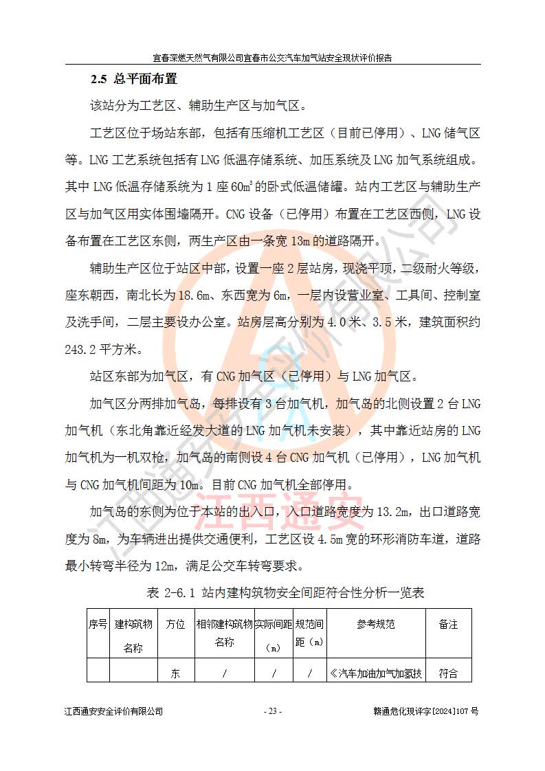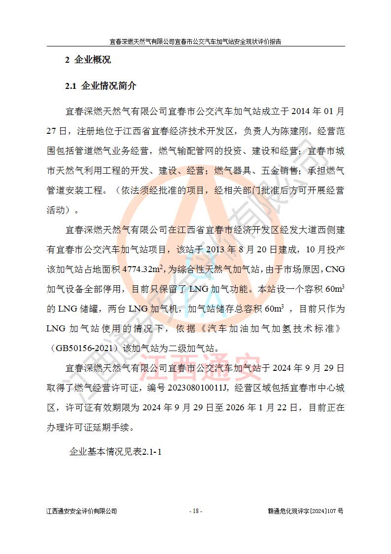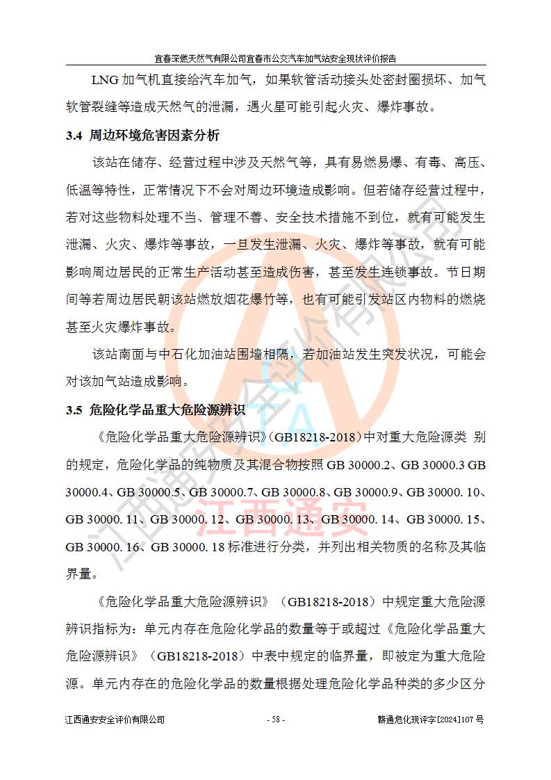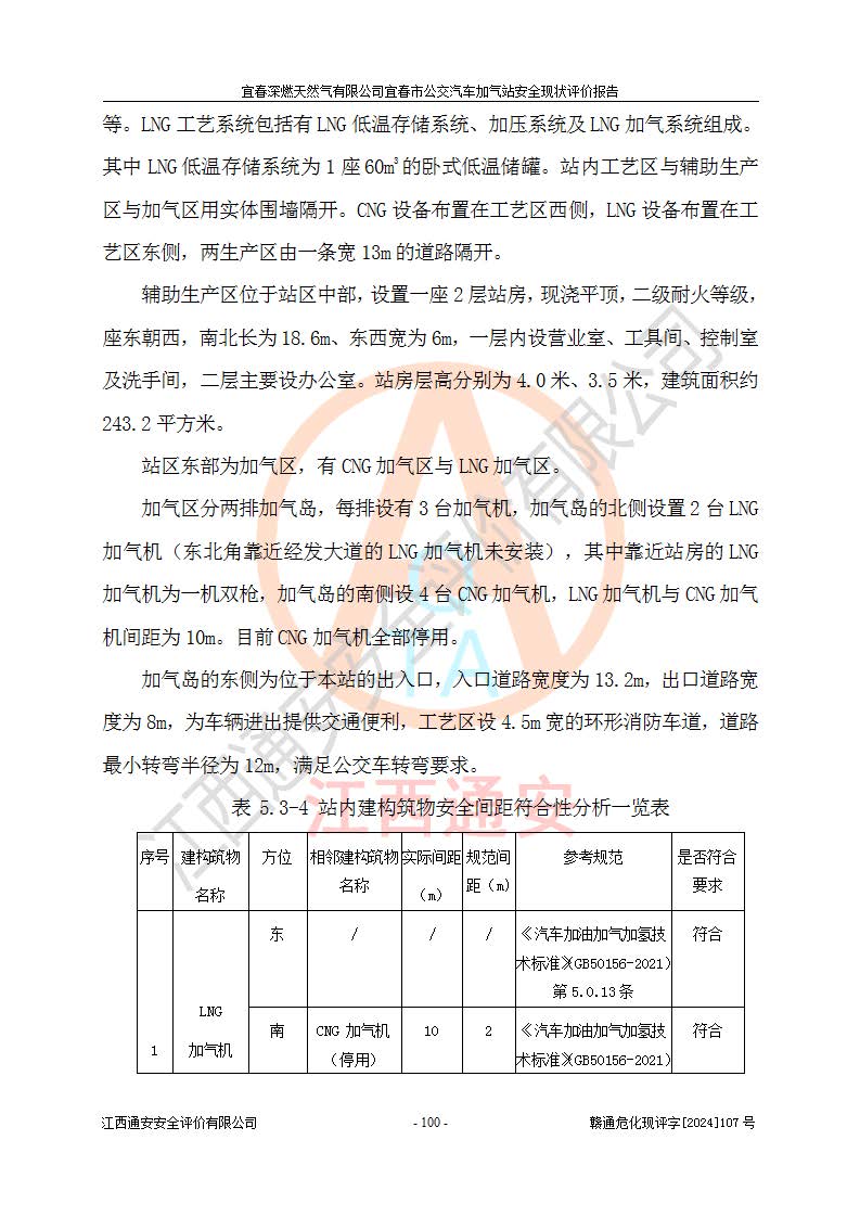 项目简介 | 宜春深燃天然气有限公司宜春市公交汽车加气站成立于2014年01月27日,注册地位于江西省宜春经济技术开发区,负责人为陈建刚。经营范围包括管道燃气业务经营,燃气输配管网的投资、建设和经营;宜春市城市天然气利用工程的开发、建设、经营;燃气器具、五金销售;承担燃气管道安装工程。(依法须经批准的项目,经相关部门批准后方可开展经营活动)。 宜春深燃天然气有限公司在江西省宜春市经济开发区经发大道西侧建有宜春市公交汽车加气站项目,该站于2013年8月20日建成,10月投产该加气站占地面积4774.32m2,为综合性天然气加气站,由于市场原因,CNG加气设备**停用,系统管道已**切断,目前只保留了LNG加气功能。本站设一个容积60m3的LNG储罐,两台LNG加气机,加气站储存总容积60m3 ,目前只作为LNG加气站使用的情况下,依据《汽车加油加气加氢技术标准》(GB50156-2021)该加气站为二级加气站。 宜春深燃天然气有限公司宜春市公交汽车加气站于2024年9月29日取得了燃气经营许可证,编号202308010011J,经营区域包括宜春市中心城区,许可证**期限为2024年9月29日至2026年1月22日,目前正在办理许可证延期手续。 根据《危险化学品目录》(2015年版)、应急管理部办公厅关于修改《危险化学品目录(2015年版)实施指南(试行)》涉及柴油部分内容的通知(应急厅函[2022]300号)和应急管理部 工业和信息化部 公安部 生态环境部 交通运输部 农业农村部 卫生健康委 市场监管总局 铁路局 民航局公告2022年第8号《决定调整《危险化学品目录(2015版)》,将“1674柴油[闭杯闪点≤60℃]”调整为“1674柴油”》的文件规定,该项目涉及危险化学品天然气(74-82-8),其中天然气属于重点监管的危险化学品。 根据《**安全监管总局关于公布首批重点监管的危险化工工艺目录的通知》(安监总管三【2009】116号)、《**安全监管总局关于公布第二批重点监管危险化工工艺目录和调整首批重点监管危险化工工艺中部分典型工艺的通知》(安监总管三【2013】3号)文件要求:该项目不涉及重点监管的危险化工工艺。 根据《危险化学品重大危险源辨识》(GB 18218-2018)进行辨识,该项目生产单元和储存设施单元不构成危险化学品重大危险源。