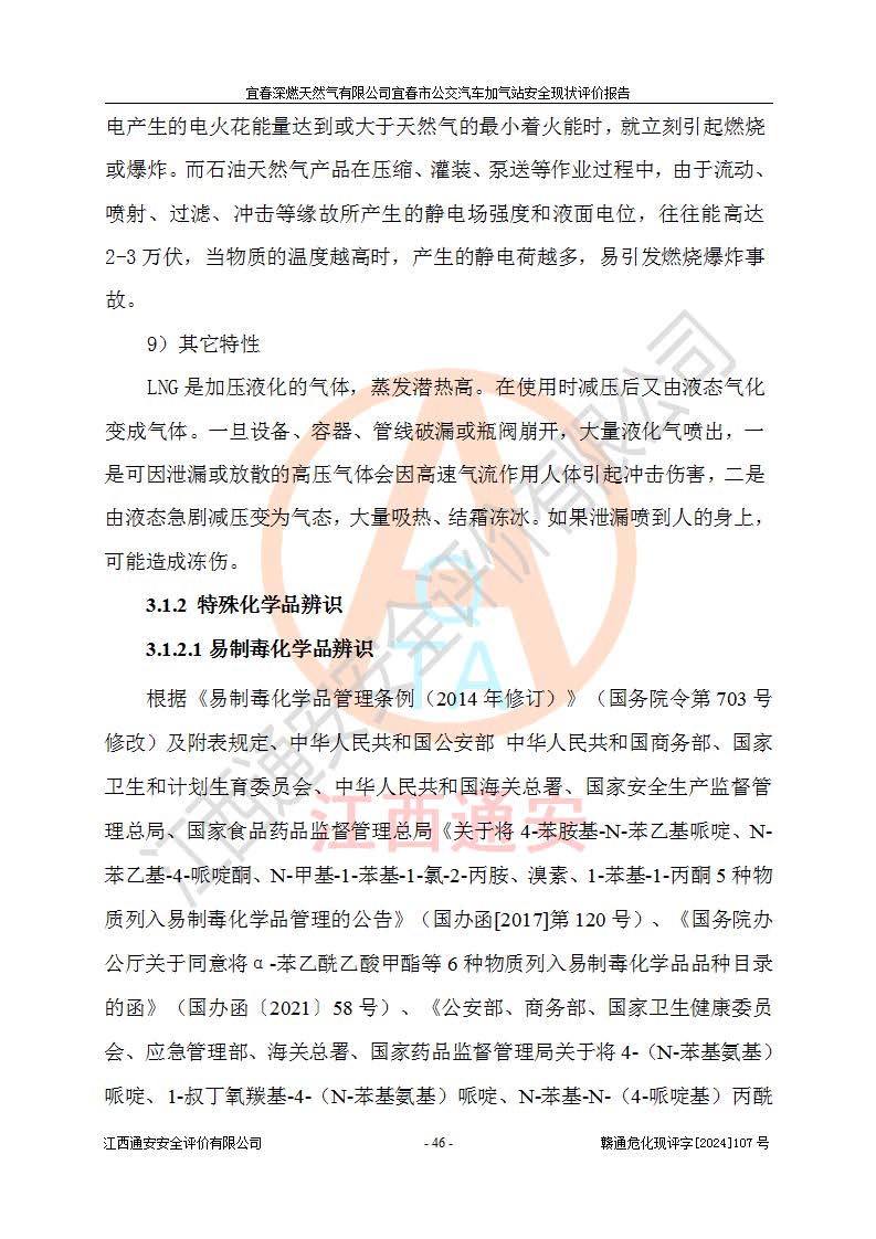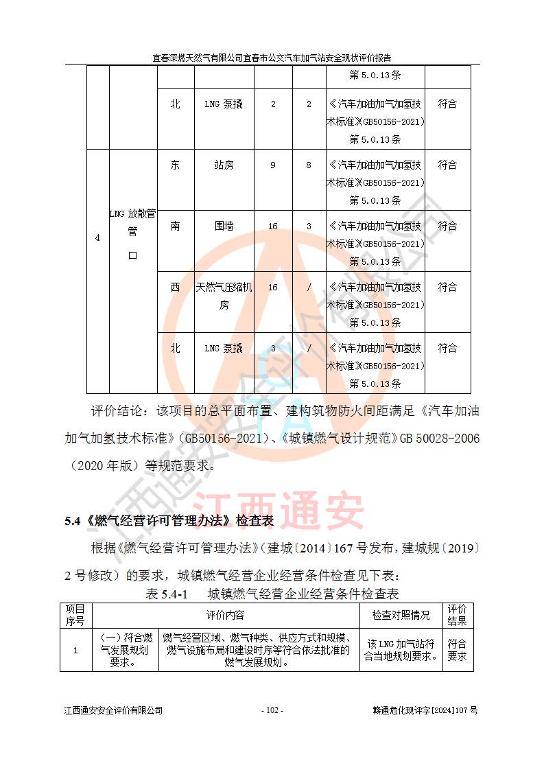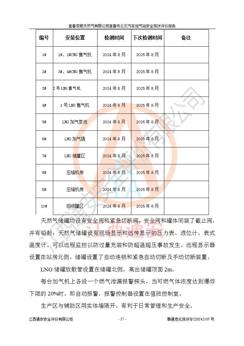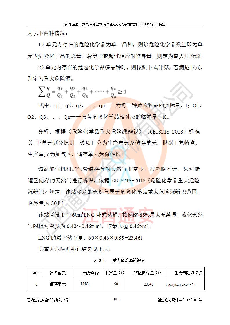 项目简介 | 宜春深燃天然气有限公司宜春市公交汽车加气站成立于2014年01月27日,注册地位于江西省宜春经济技术开发区,负责人为陈建刚。经营范围包括管道燃气业务经营,燃气输配管网的投资、建设和经营;宜春市城市天然气利用工程的开发、建设、经营;燃气器具、五金销售;承担燃气管道安装工程。(依法须经批准的项目,经相关部门批准后方可开展经营活动)。 宜春深燃天然气有限公司在江西省宜春市经济开发区经发大道西侧建有宜春市公交汽车加气站项目,该站于2013年8月20日建成,10月投产该加气站占地面积4774.32m2,为综合性天然气加气站,由于市场原因,CNG加气设备**停用,系统管道已**切断,目前只保留了LNG加气功能。本站设一个容积60m3的LNG储罐,两台LNG加气机,加气站储存总容积60m3 ,目前只作为LNG加气站使用的情况下,依据《汽车加油加气加氢技术标准》(GB50156-2021)该加气站为二级加气站。 宜春深燃天然气有限公司宜春市公交汽车加气站于2024年9月29日取得了燃气经营许可证,编号202308010011J,经营区域包括宜春市中心城区,许可证**期限为2024年9月29日至2026年1月22日,目前正在办理许可证延期手续。 根据《危险化学品目录》(2015年版)、应急管理部办公厅关于修改《危险化学品目录(2015年版)实施指南(试行)》涉及柴油部分内容的通知(应急厅函[2022]300号)和应急管理部 工业和信息化部 公安部 生态环境部 交通运输部 农业农村部 卫生健康委 市场监管总局 铁路局 民航局公告2022年第8号《决定调整《危险化学品目录(2015版)》,将“1674柴油[闭杯闪点≤60℃]”调整为“1674柴油”》的文件规定,该项目涉及危险化学品天然气(74-82-8),其中天然气属于重点监管的危险化学品。 根据《**安全监管总局关于公布首批重点监管的危险化工工艺目录的通知》(安监总管三【2009】116号)、《**安全监管总局关于公布第二批重点监管危险化工工艺目录和调整首批重点监管危险化工工艺中部分典型工艺的通知》(安监总管三【2013】3号)文件要求:该项目不涉及重点监管的危险化工工艺。 根据《危险化学品重大危险源辨识》(GB 18218-2018)进行辨识,该项目生产单元和储存设施单元不构成危险化学品重大危险源。
