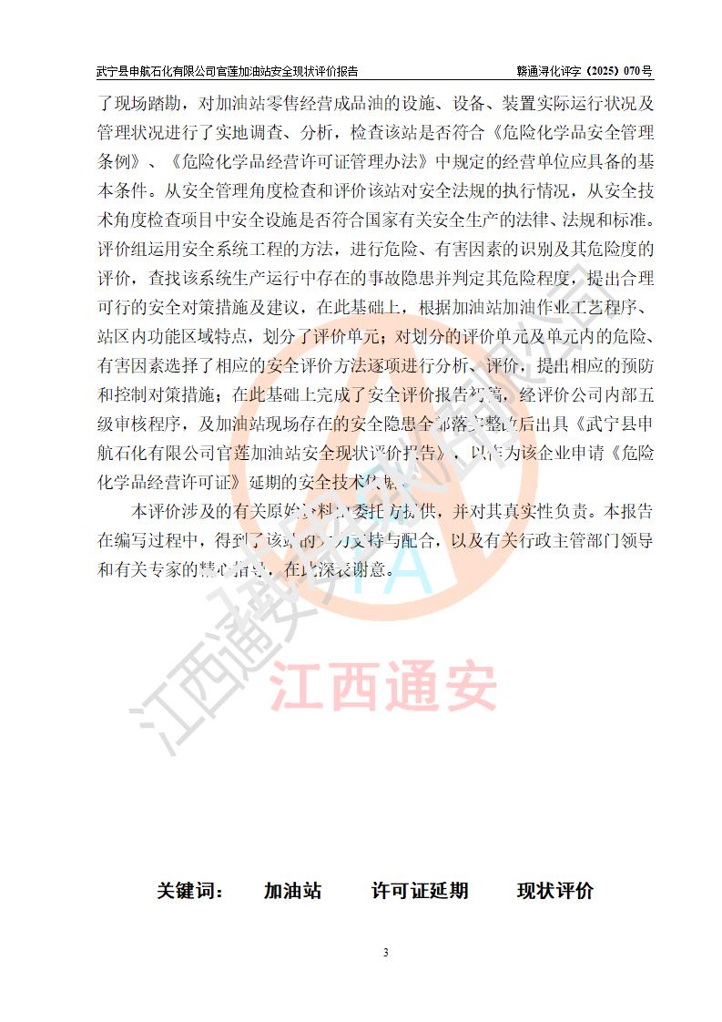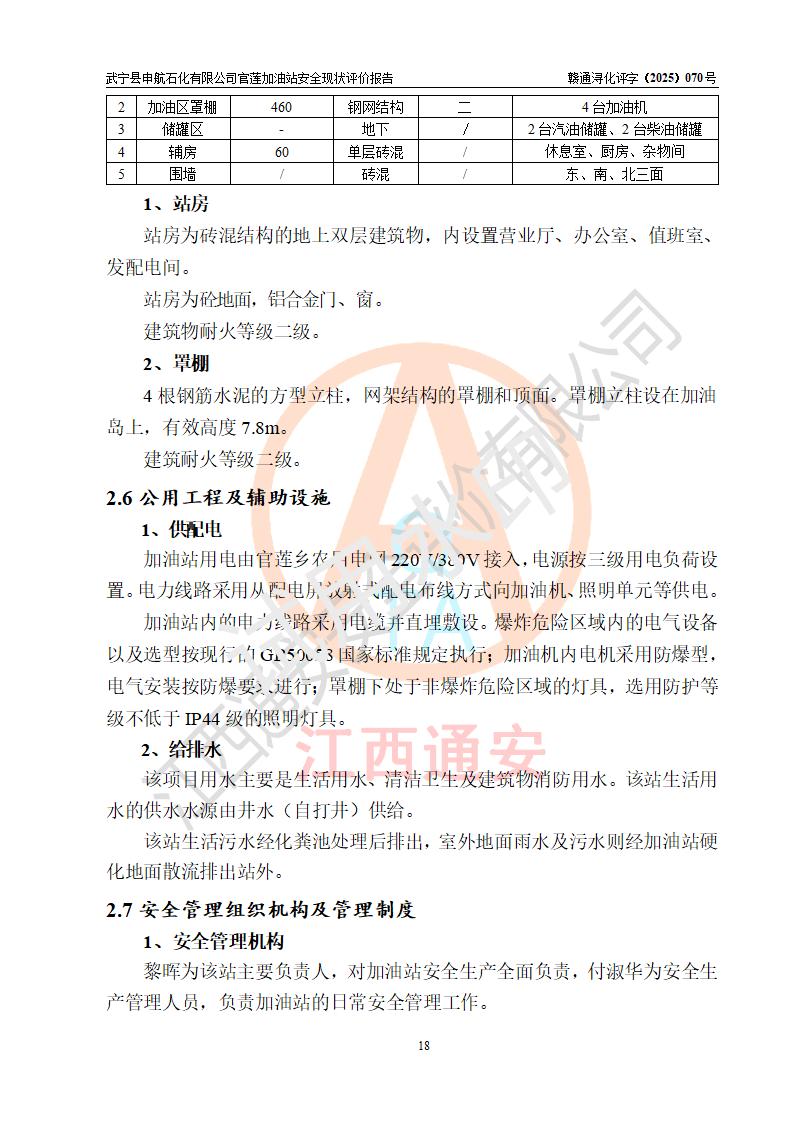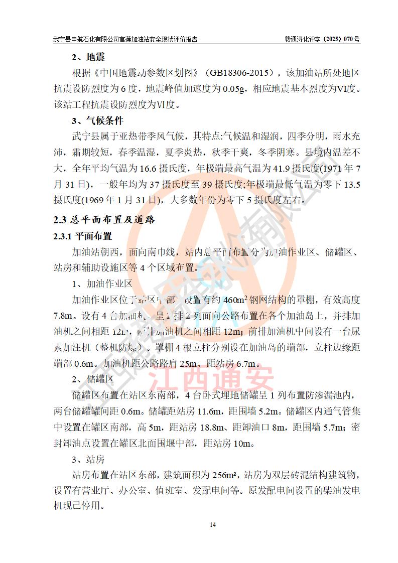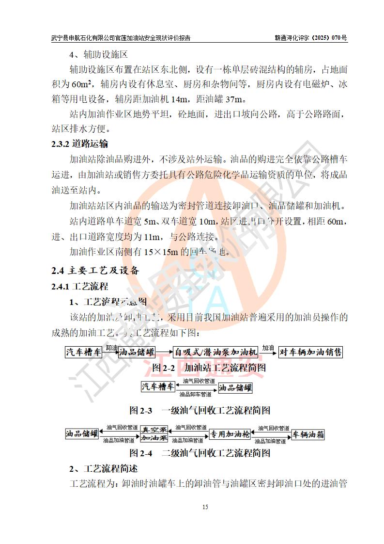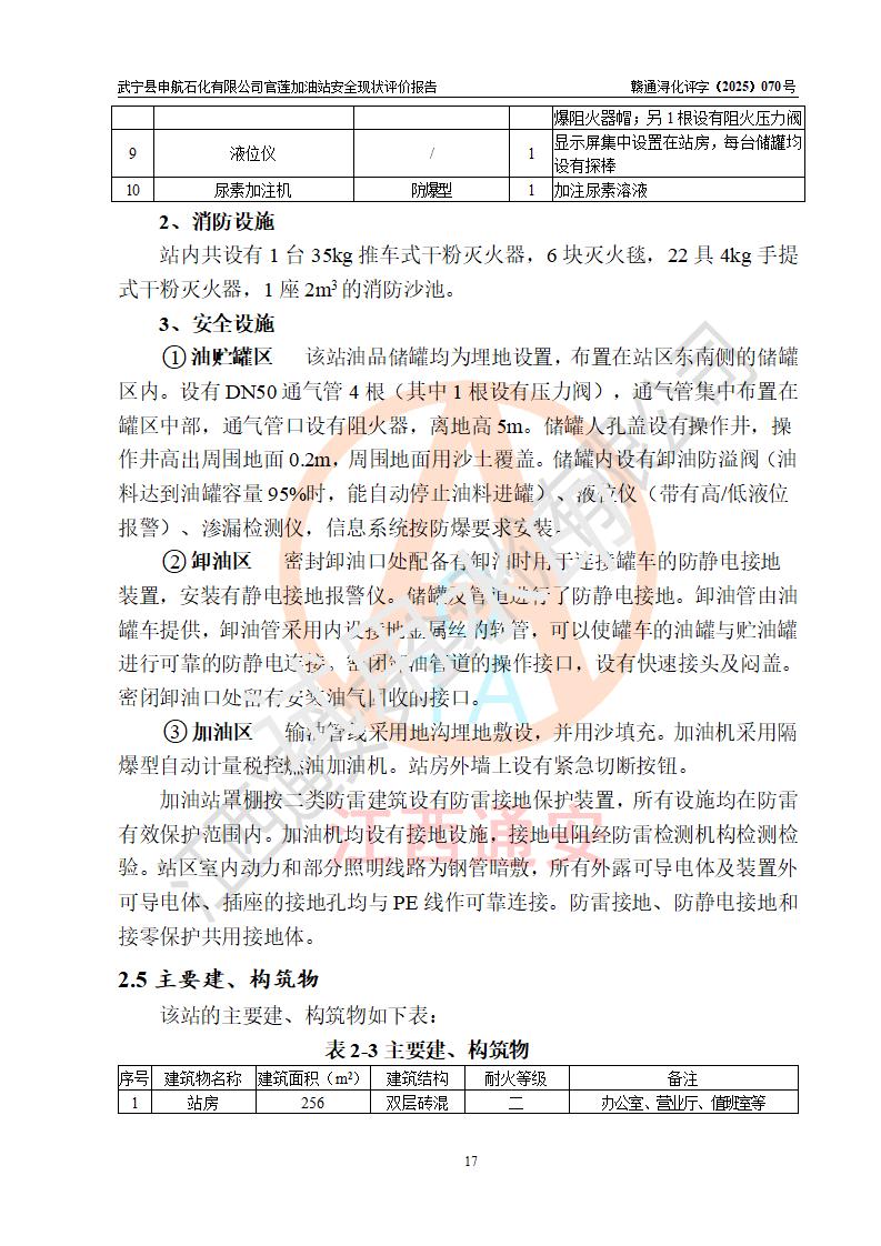 项目简介 | 武宁县申航石化有限公司官莲加油站是一家专门从事成品油零售经营的有限责任公司分公司,经营场所位于江西省九江市武宁县官莲乡集镇。现有从业人员9名,其中安全管理人员1人,加油站负责人黎晖。 该加油站占地面积约2280m2,站区内设置有4台双枪程控燃油加油机及配套的工艺管线、设有单层储罐4台(设有防渗罐池),其中40m3的0#柴油储罐2台、40m3的92#汽油储罐1台,40m3的95#汽油储罐1台,油品储罐总容积为160m3(折算成汽油为120m3),按现行《汽车加油加气加氢站技术标准》对加油站的等级划分原则,属二级加油站。 该站由九江市行政审批局换发《危险化学品经营许可证》(证号:36040013202500003),**期限2022年12月19日至2025年12月18日。 | |||