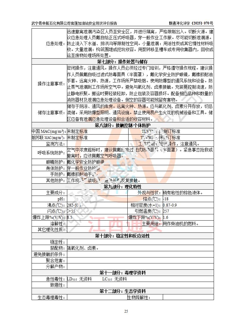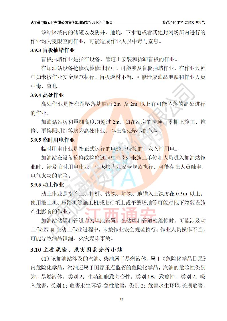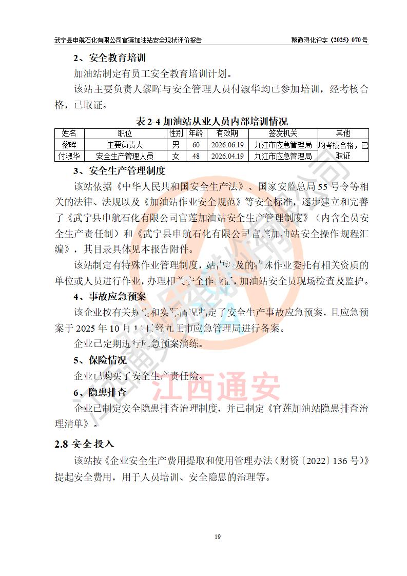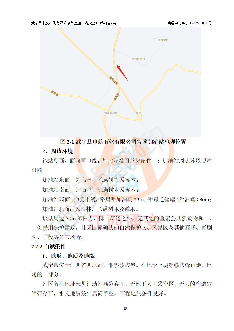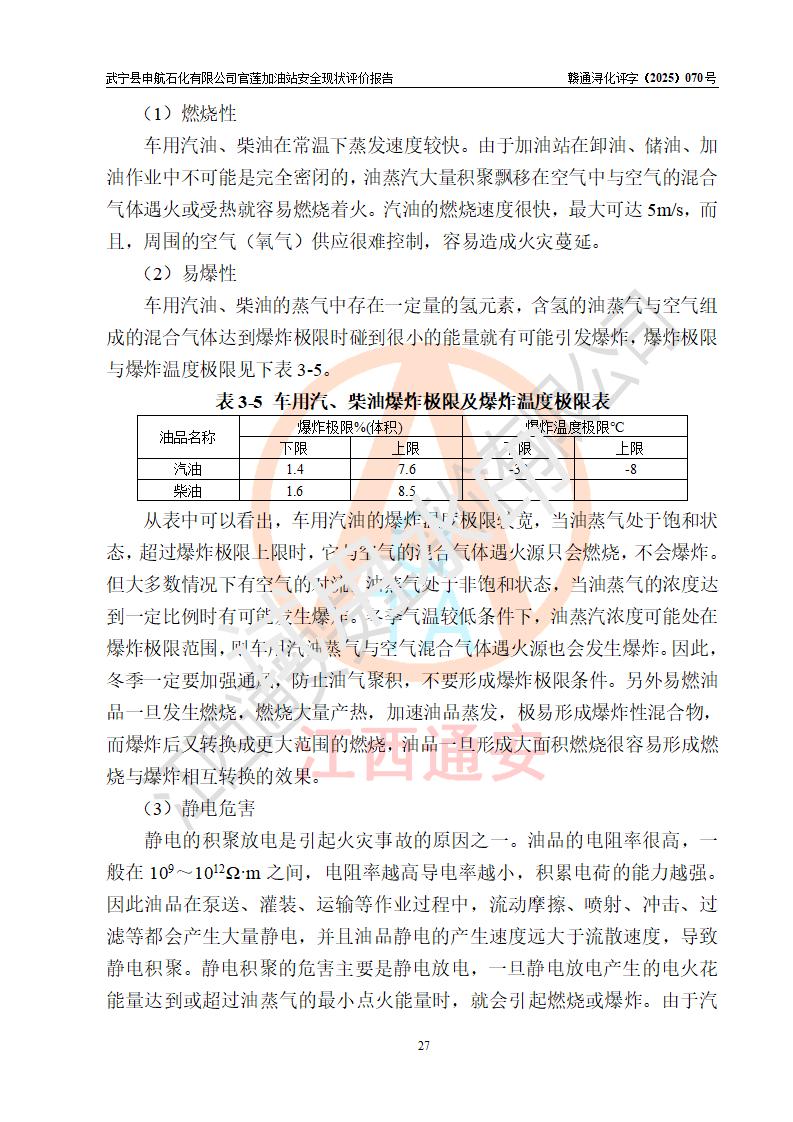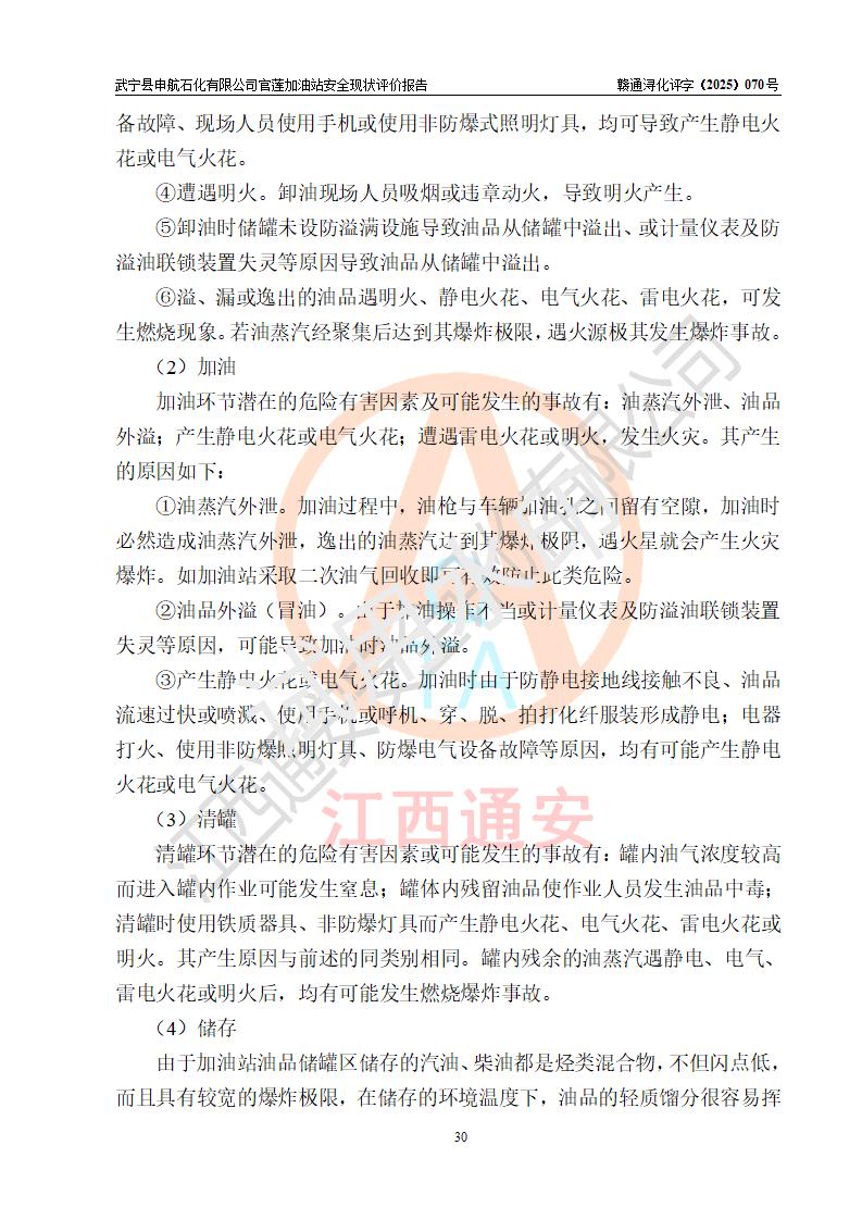 项目简介 | 武宁县申航石化有限公司官莲加油站是一家专门从事成品油零售经营的有限责任公司分公司,经营场所位于江西省九江市武宁县官莲乡集镇。现有从业人员9名,其中安全管理人员1人,加油站负责人黎晖。 该加油站占地面积约2280m2,站区内设置有4台双枪程控燃油加油机及配套的工艺管线、设有单层储罐4台(设有防渗罐池),其中40m3的0#柴油储罐2台、40m3的92#汽油储罐1台,40m3的95#汽油储罐1台,油品储罐总容积为160m3(折算成汽油为120m3),按现行《汽车加油加气加氢站技术标准》对加油站的等级划分原则,属二级加油站。 该站由九江市行政审批局换发《危险化学品经营许可证》(证号:36040013202500003),**期限2022年12月19日至2025年12月18日。 | |||