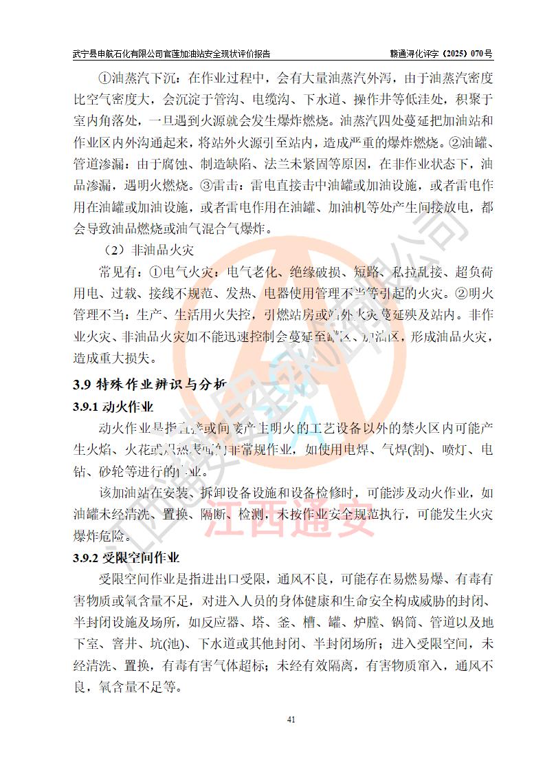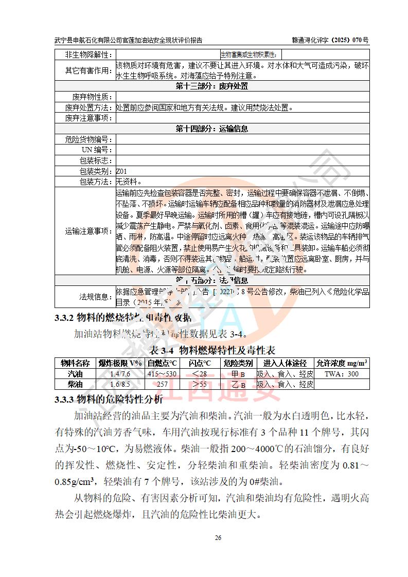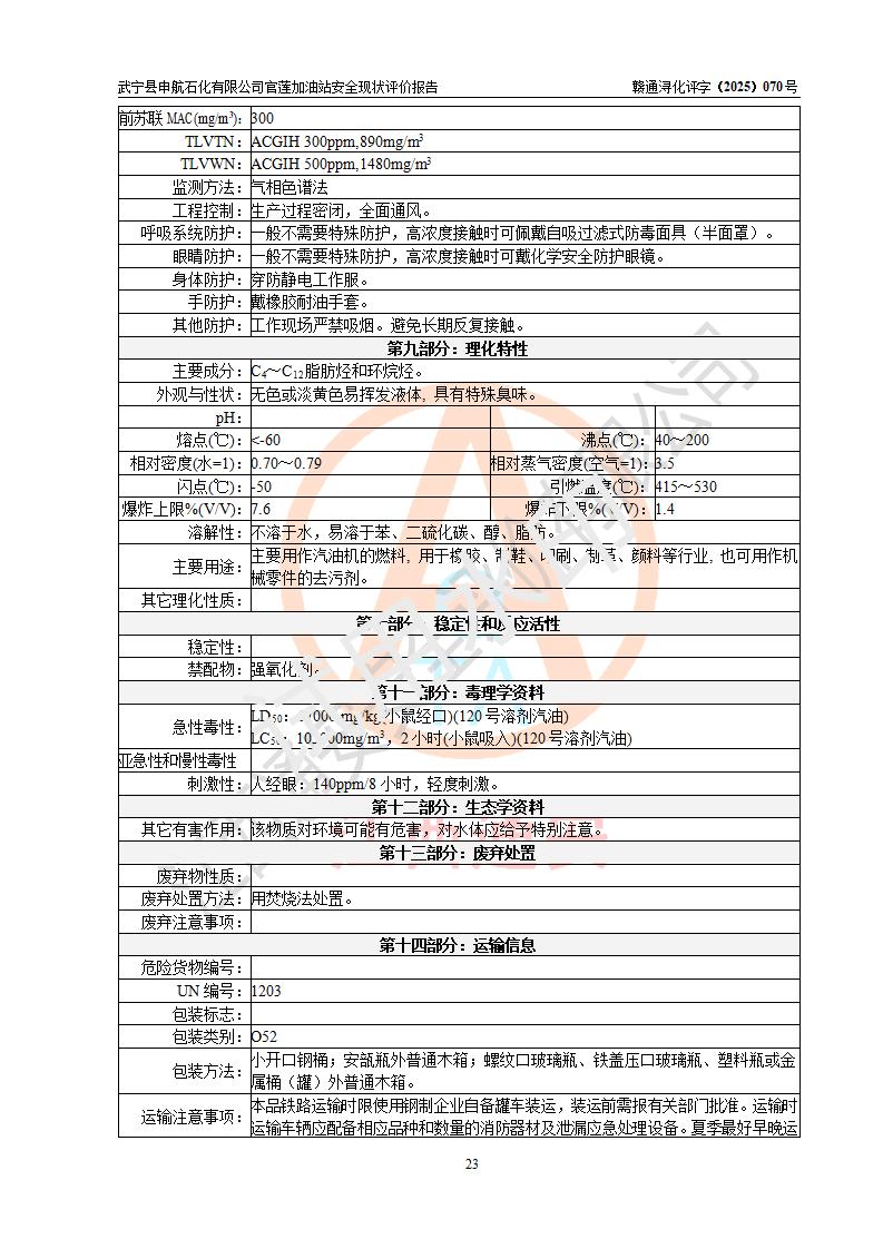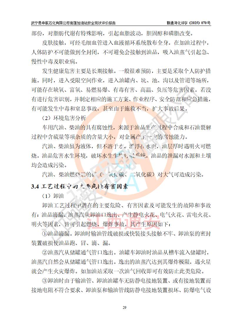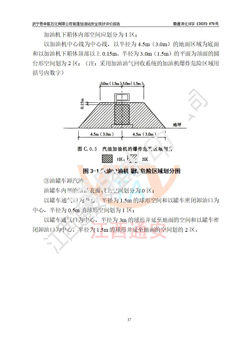 项目简介 | 武宁县申航石化有限公司官莲加油站是一家专门从事成品油零售经营的有限责任公司分公司,经营场所位于江西省九江市武宁县官莲乡集镇。现有从业人员9名,其中安全管理人员1人,加油站负责人黎晖。 该加油站占地面积约2280m2,站区内设置有4台双枪程控燃油加油机及配套的工艺管线、设有单层储罐4台(设有防渗罐池),其中40m3的0#柴油储罐2台、40m3的92#汽油储罐1台,40m3的95#汽油储罐1台,油品储罐总容积为160m3(折算成汽油为120m3),按现行《汽车加油加气加氢站技术标准》对加油站的等级划分原则,属二级加油站。 该站由九江市行政审批局换发《危险化学品经营许可证》(证号:36040013202500003),**期限2022年12月19日至2025年12月18日。 | |||