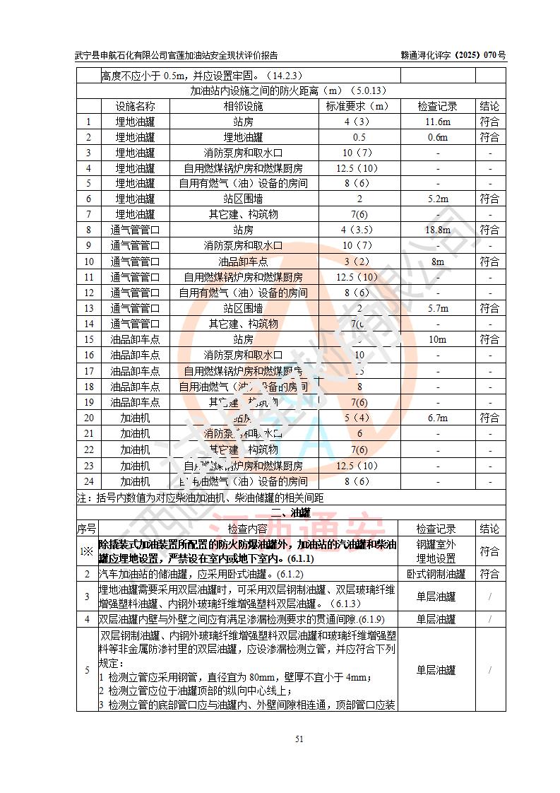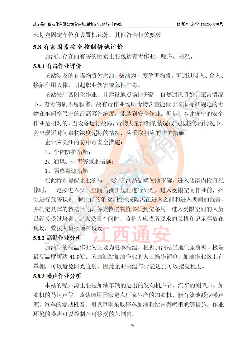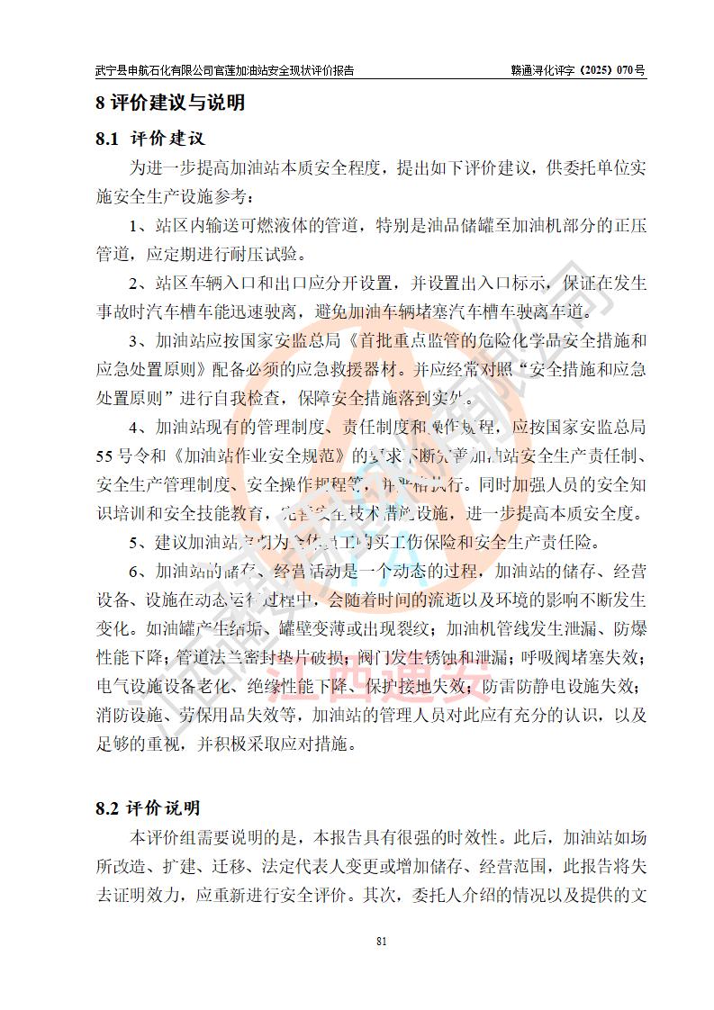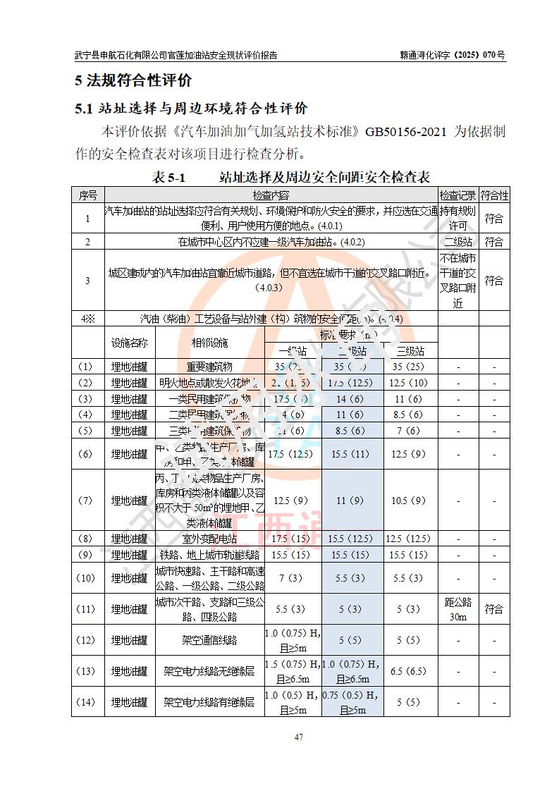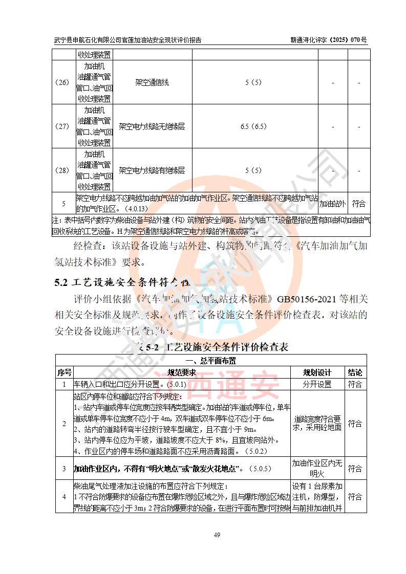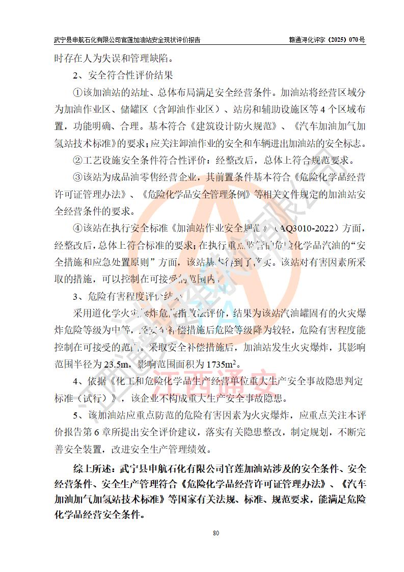 评价结论 | 武宁县申航石化有限公司官莲加油站涉及的安全条件、安全经营条件、安全生产管理符合《危险化学品经营许可证管理办法》、《汽车加油加气加氢站技术标准》等**有关法规、标准、规范要求,能满足危险化学品经营安全条件。 | |||
