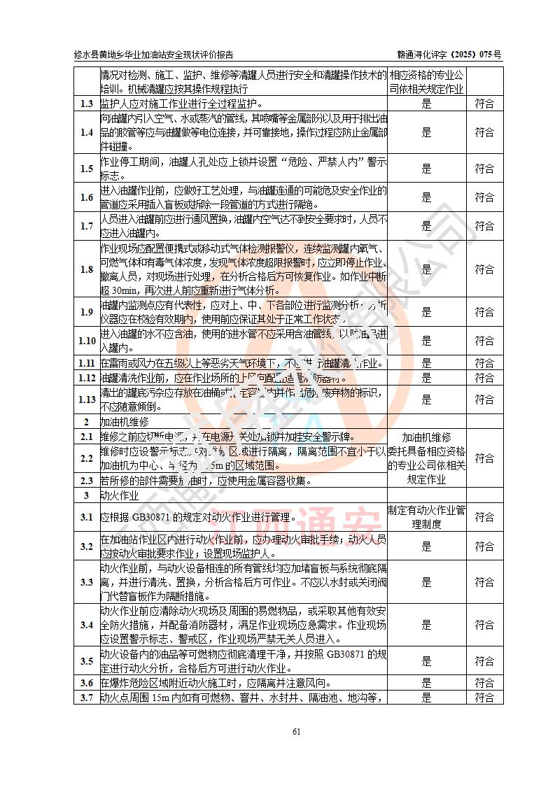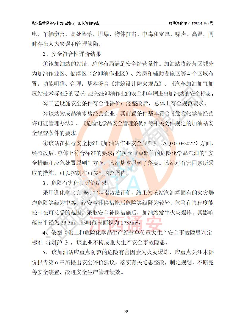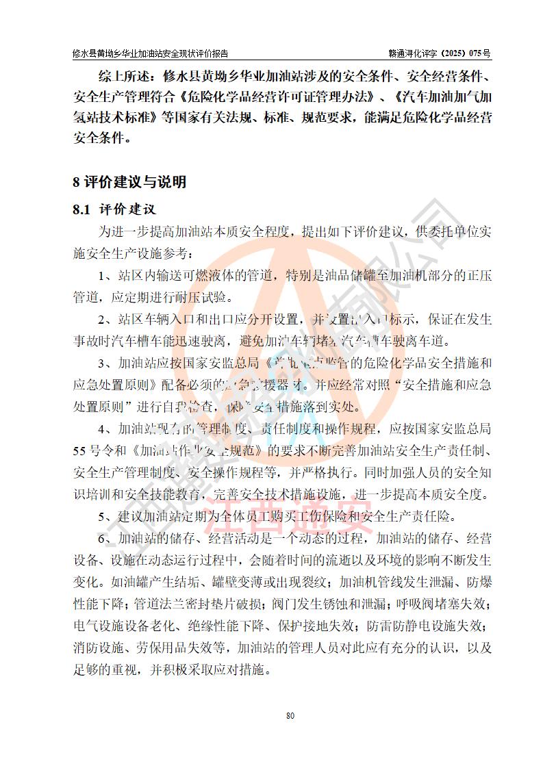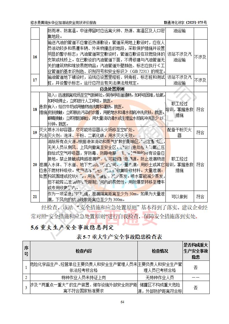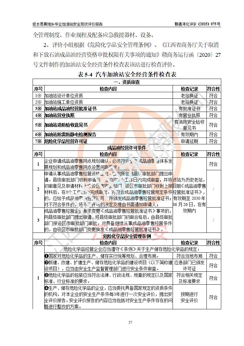 评价结论 | 修水县黄坳乡华业加油站涉及的安全条件、安全经营条件、安全生产管理符合《危险化学品经营许可证管理办法》、《汽车加油加气加氢站技术标准》等**有关法规、标准、规范要求,能满足危险化学品经营安全条件。 | |||