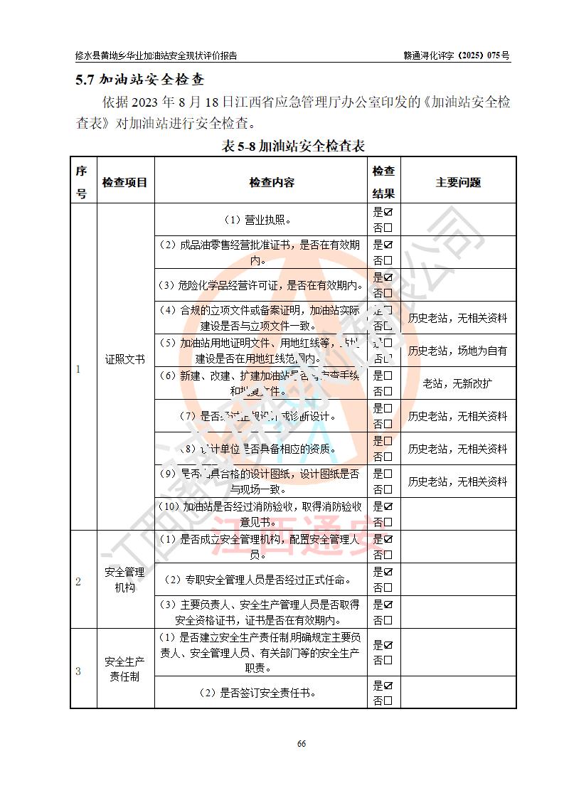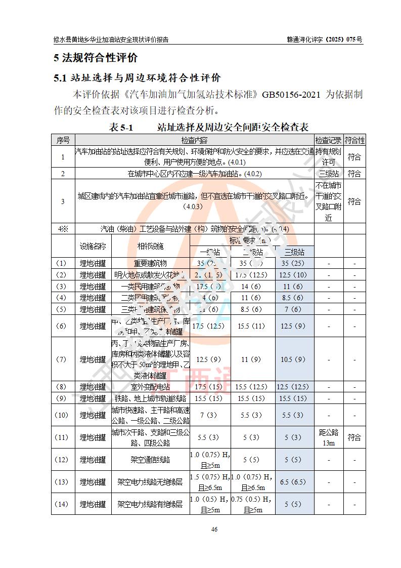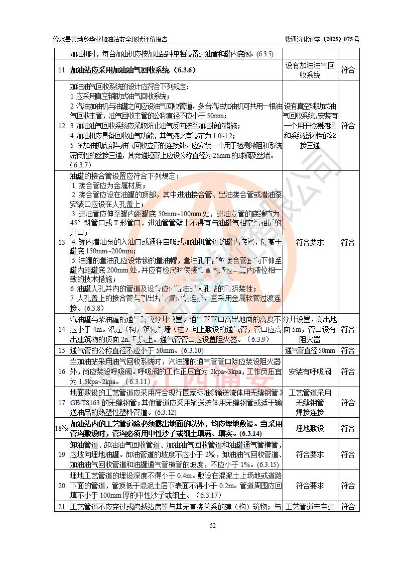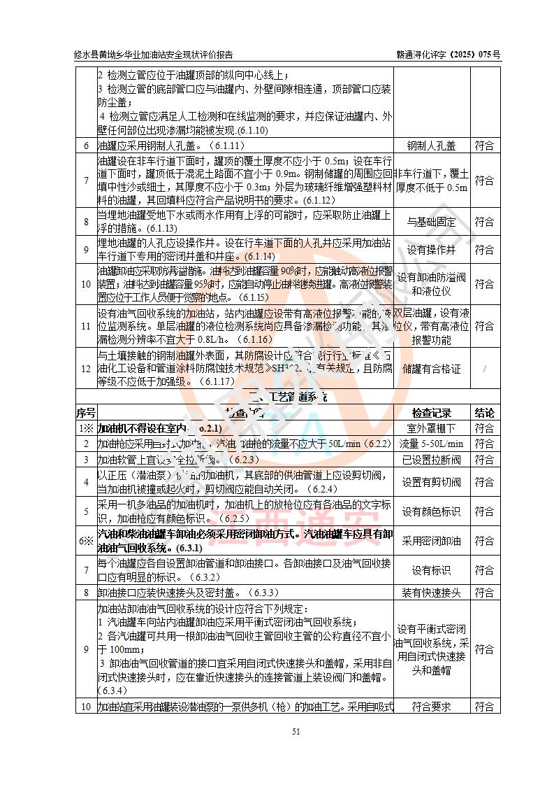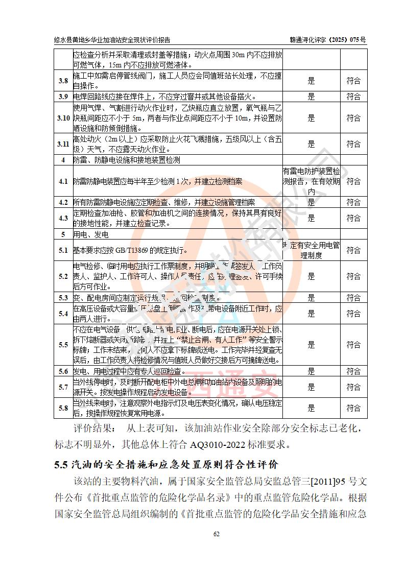 评价结论 | 修水县黄坳乡华业加油站涉及的安全条件、安全经营条件、安全生产管理符合《危险化学品经营许可证管理办法》、《汽车加油加气加氢站技术标准》等**有关法规、标准、规范要求,能满足危险化学品经营安全条件。 | |||