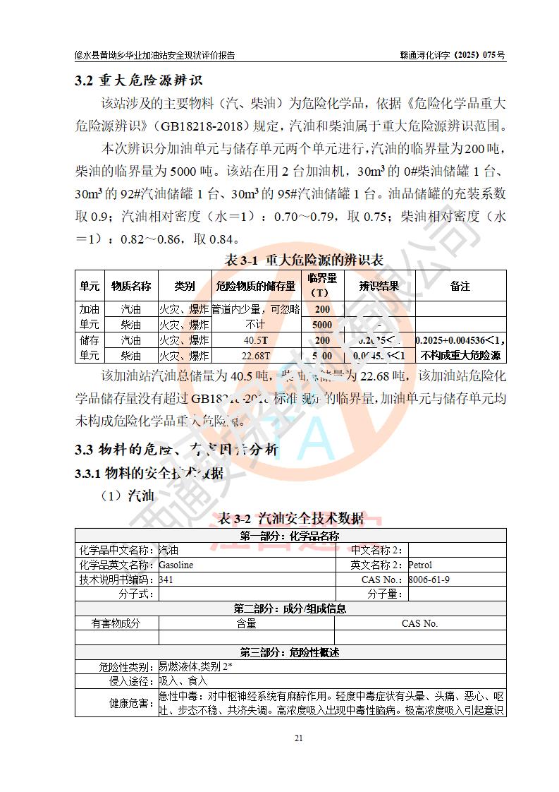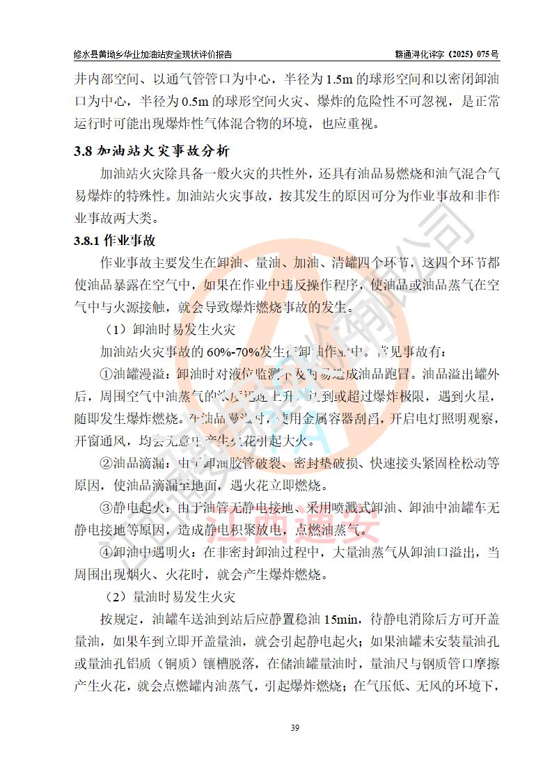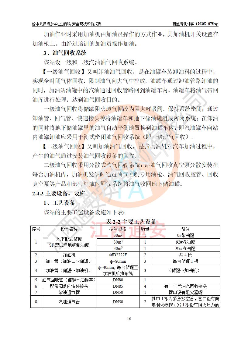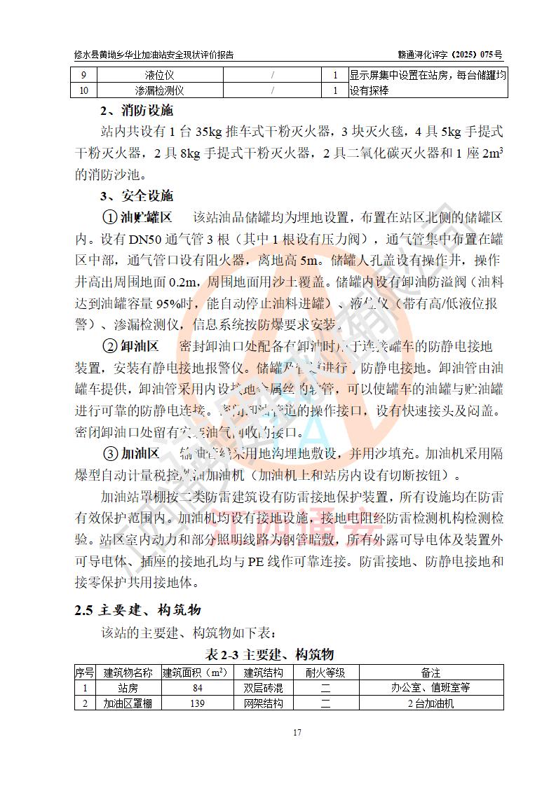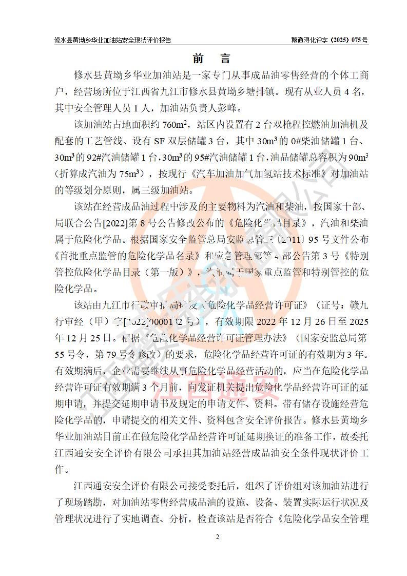项目简介 | 修水县黄坳乡华业加油站是一家专门从事成品油零售经营的个体工商户,经营场所位于江西省九江市修水县黄坳乡塘排镇。现有从业人员4名,其中安全管理人员1人,加油站负责人彭峰。 该加油站占地面积约760m2,站区内设置有2台双枪程控燃油加油机及配套的工艺管线、设有SF双层储罐3台,其中30m3的0#柴油储罐1台、30m3的92#汽油储罐1台,30m3的95#汽油储罐1台,油品储罐总容积为90m3(折算成汽油为75m3),按现行《汽车加油加气加氢站技术标准》对加油站的等级划分原则,属三级加油站。 该站由九江市行政审批局换发《危险化学品经营许可证》(证号:赣九行审经(甲)字[2022]0000182号),**期限2022年12月26日至2025年12月25日。 | |||