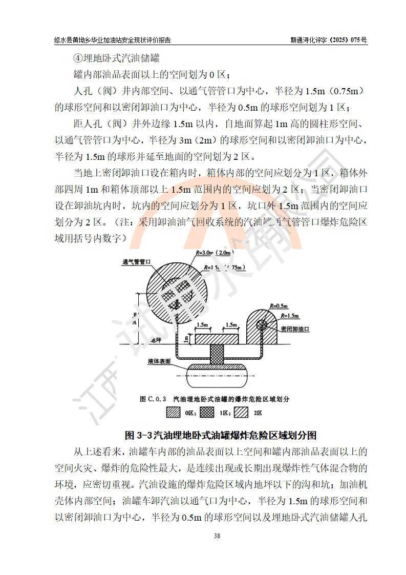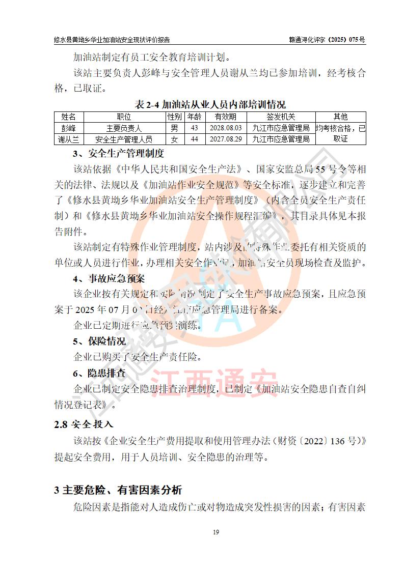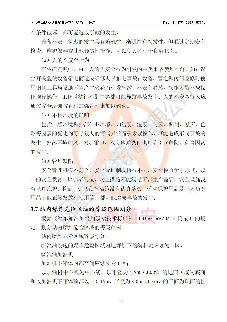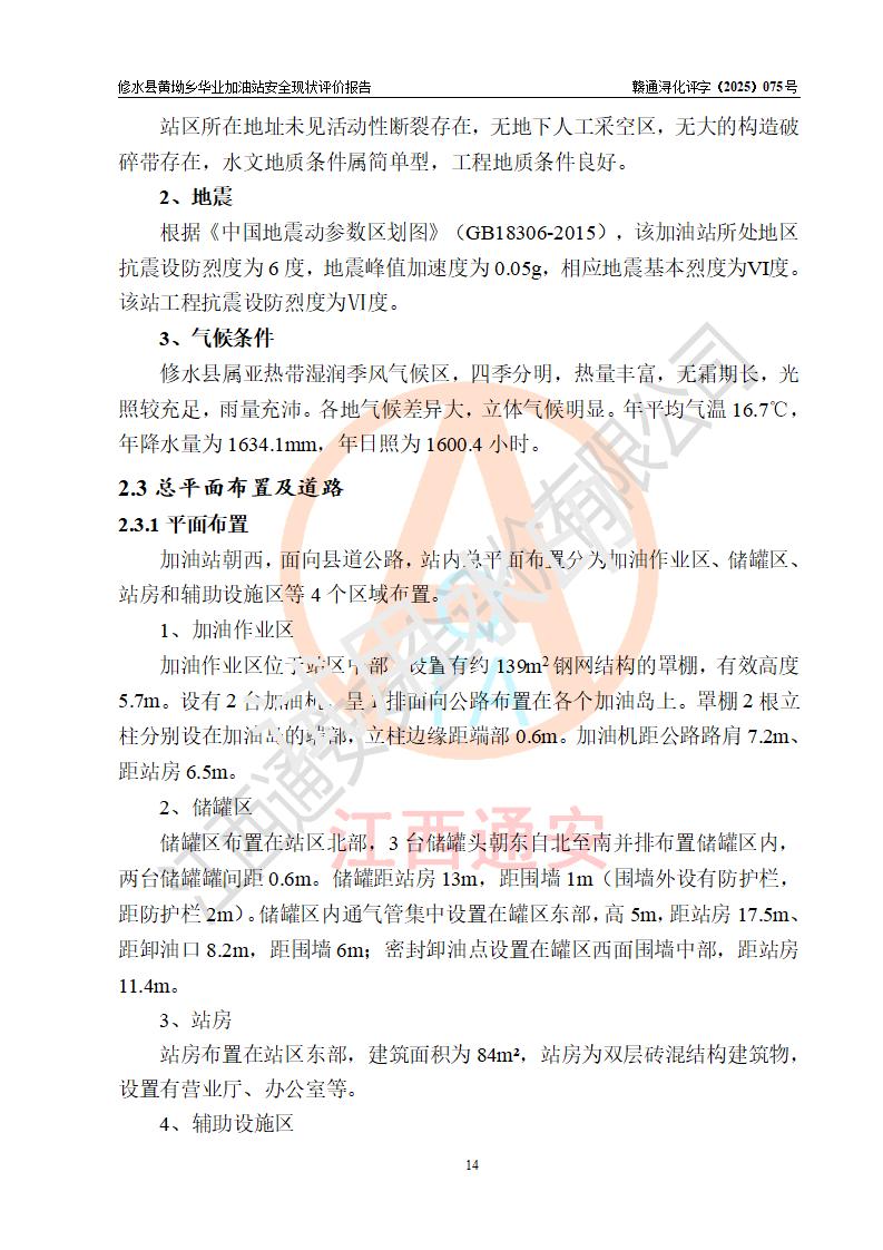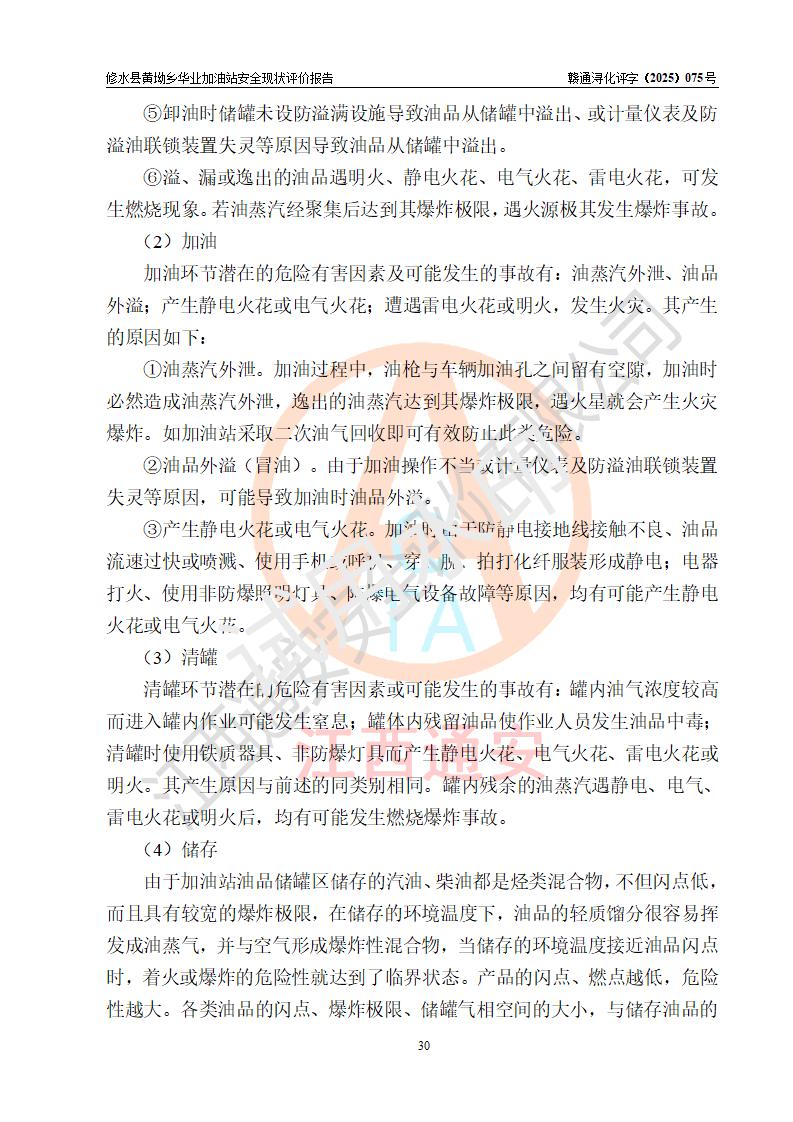 项目简介 | 修水县黄坳乡华业加油站是一家专门从事成品油零售经营的个体工商户,经营场所位于江西省九江市修水县黄坳乡塘排镇。现有从业人员4名,其中安全管理人员1人,加油站负责人彭峰。 该加油站占地面积约760m2,站区内设置有2台双枪程控燃油加油机及配套的工艺管线、设有SF双层储罐3台,其中30m3的0#柴油储罐1台、30m3的92#汽油储罐1台,30m3的95#汽油储罐1台,油品储罐总容积为90m3(折算成汽油为75m3),按现行《汽车加油加气加氢站技术标准》对加油站的等级划分原则,属三级加油站。 该站由九江市行政审批局换发《危险化学品经营许可证》(证号:赣九行审经(甲)字[2022]0000182号),**期限2022年12月26日至2025年12月25日。 | |||