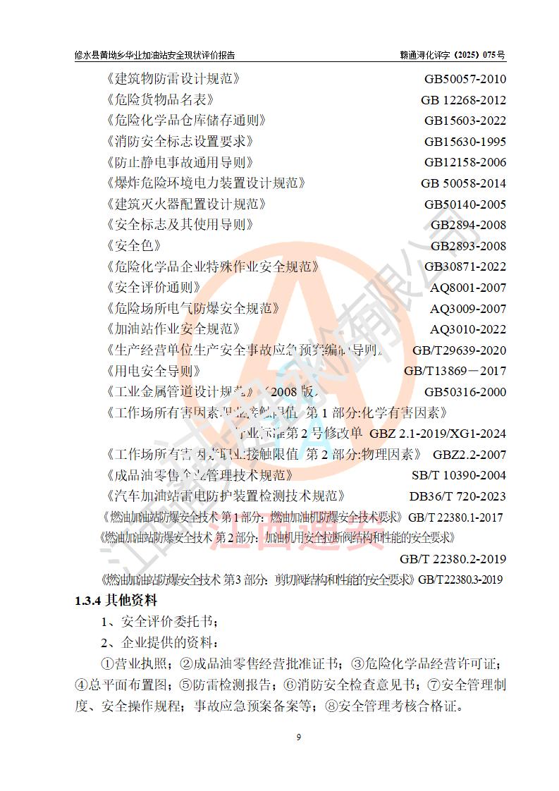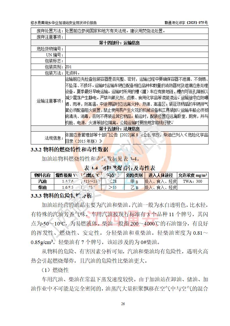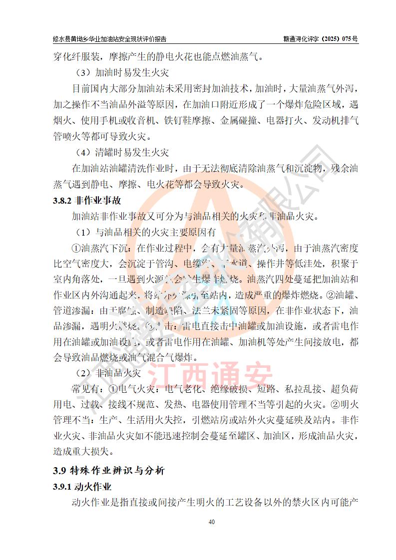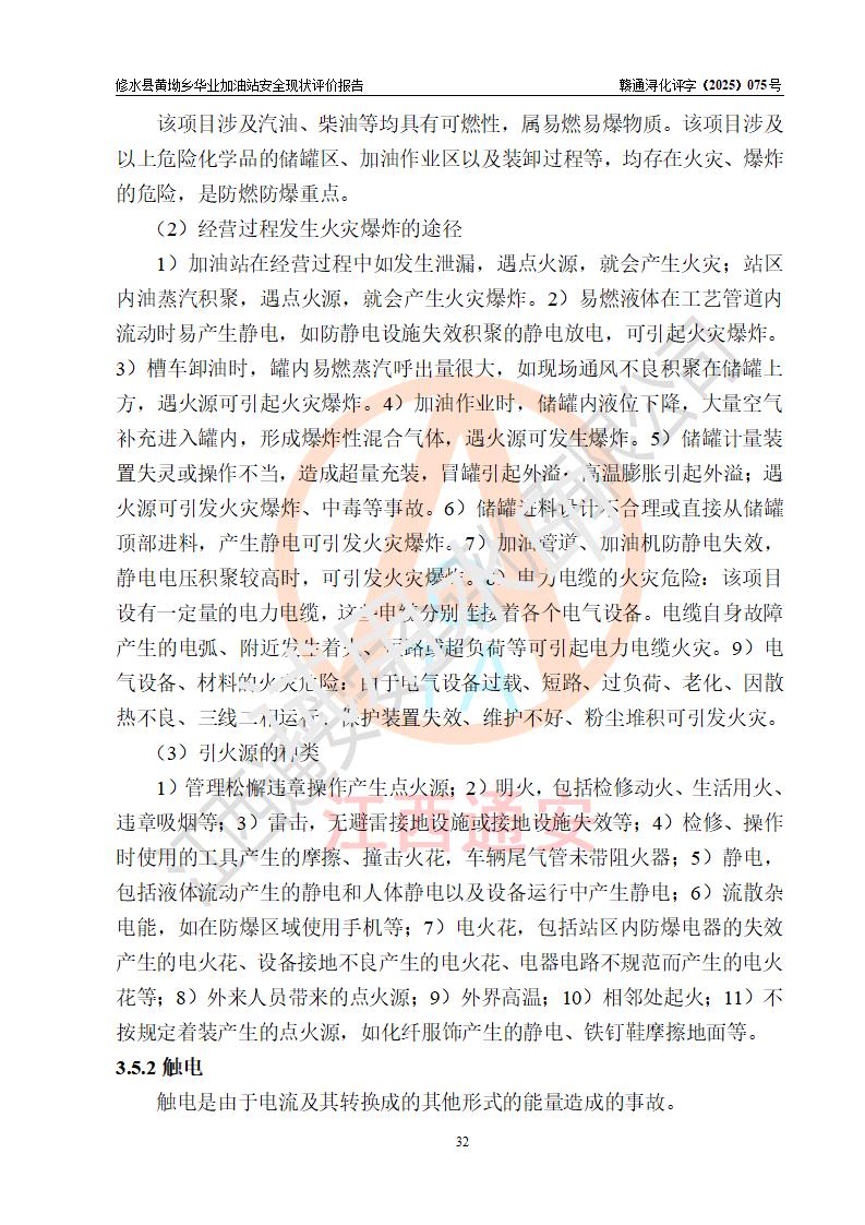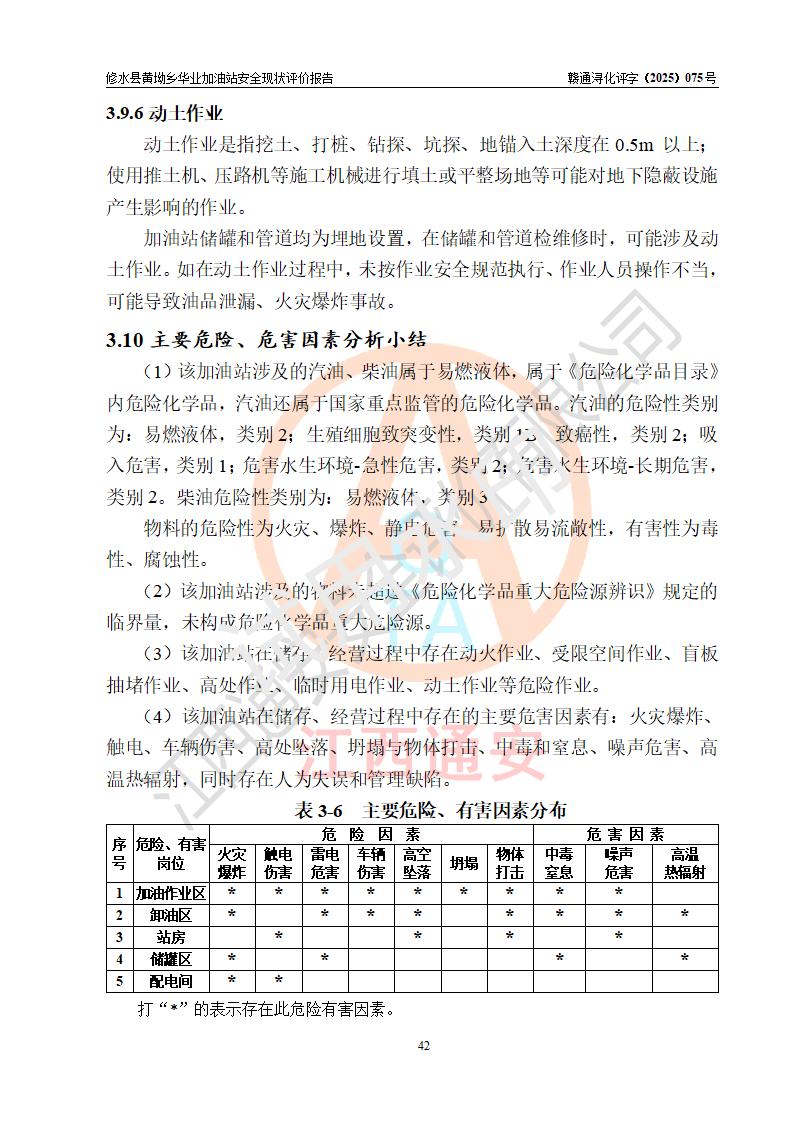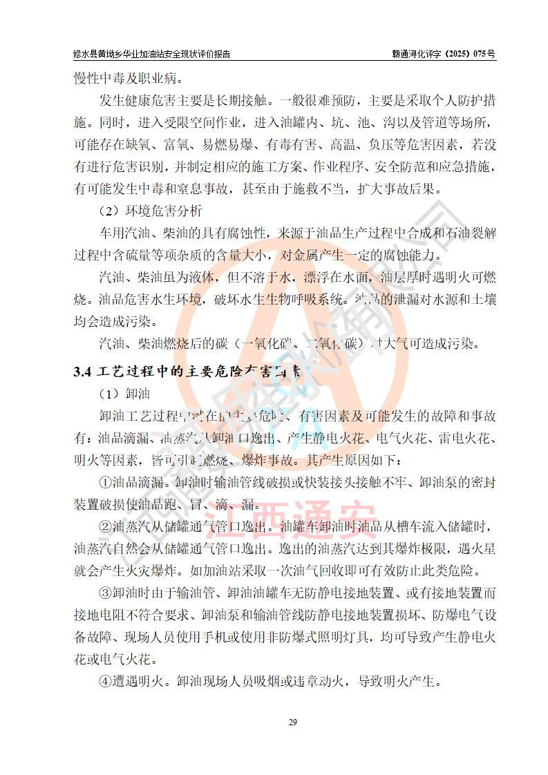 项目简介 | 修水县黄坳乡华业加油站是一家专门从事成品油零售经营的个体工商户,经营场所位于江西省九江市修水县黄坳乡塘排镇。现有从业人员4名,其中安全管理人员1人,加油站负责人彭峰。 该加油站占地面积约760m2,站区内设置有2台双枪程控燃油加油机及配套的工艺管线、设有SF双层储罐3台,其中30m3的0#柴油储罐1台、30m3的92#汽油储罐1台,30m3的95#汽油储罐1台,油品储罐总容积为90m3(折算成汽油为75m3),按现行《汽车加油加气加氢站技术标准》对加油站的等级划分原则,属三级加油站。 该站由九江市行政审批局换发《危险化学品经营许可证》(证号:赣九行审经(甲)字[2022]0000182号),**期限2022年12月26日至2025年12月25日。 | |||
