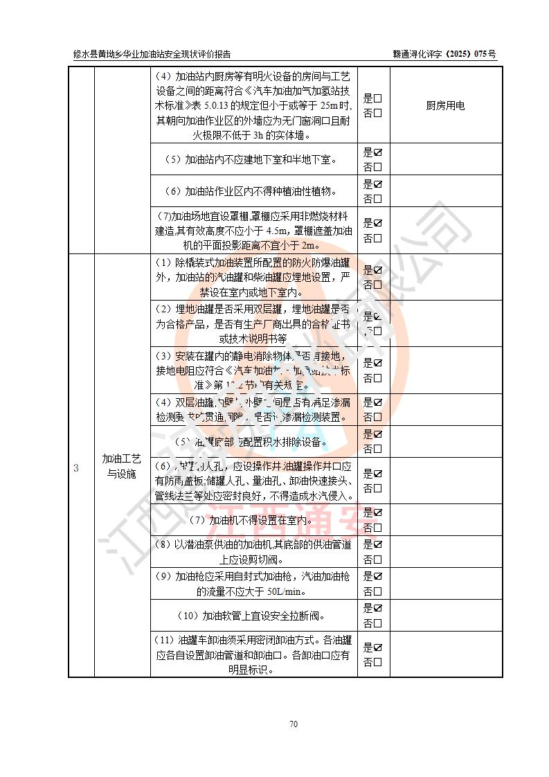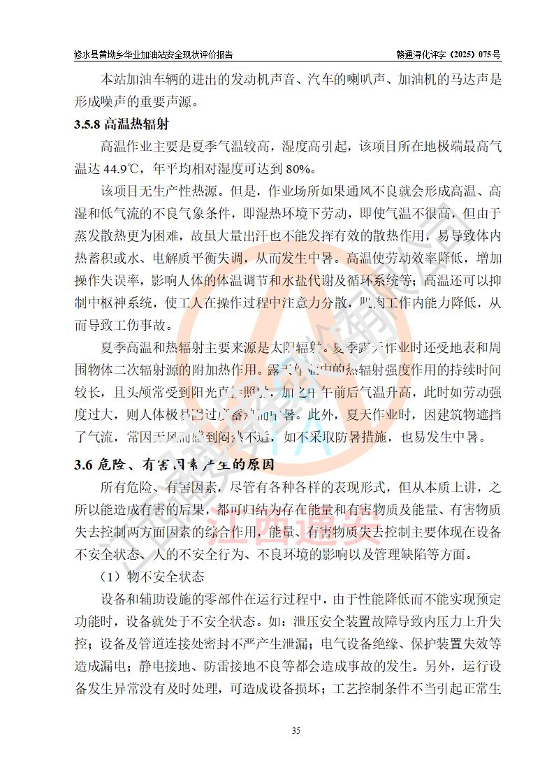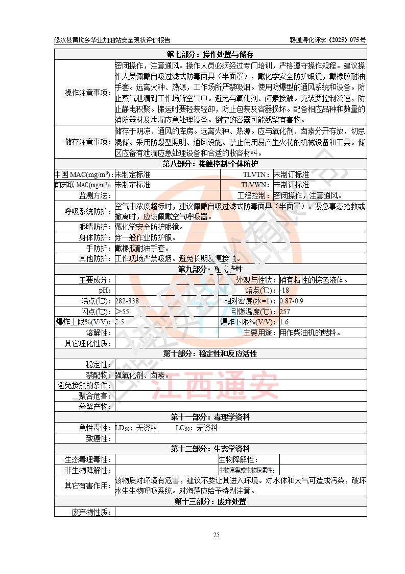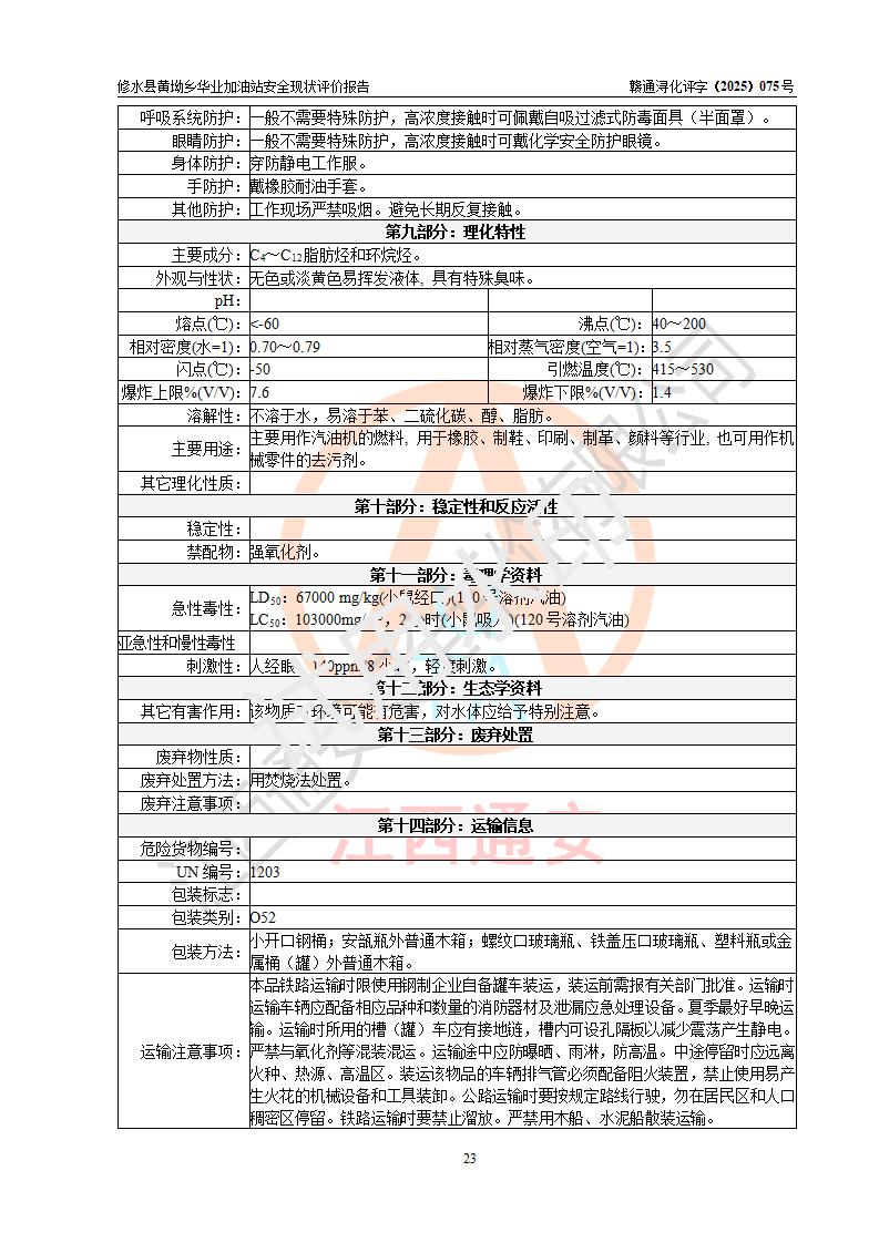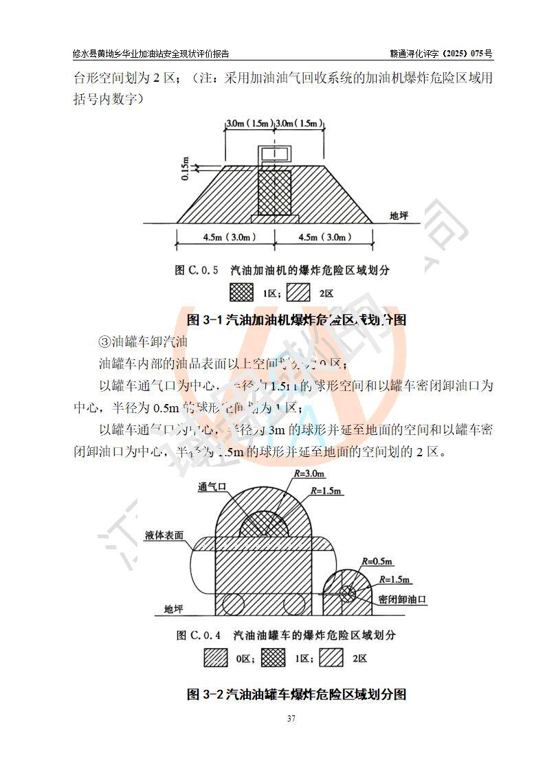 项目简介 | 修水县黄坳乡华业加油站是一家专门从事成品油零售经营的个体工商户,经营场所位于江西省九江市修水县黄坳乡塘排镇。现有从业人员4名,其中安全管理人员1人,加油站负责人彭峰。 该加油站占地面积约760m2,站区内设置有2台双枪程控燃油加油机及配套的工艺管线、设有SF双层储罐3台,其中30m3的0#柴油储罐1台、30m3的92#汽油储罐1台,30m3的95#汽油储罐1台,油品储罐总容积为90m3(折算成汽油为75m3),按现行《汽车加油加气加氢站技术标准》对加油站的等级划分原则,属三级加油站。 该站由九江市行政审批局换发《危险化学品经营许可证》(证号:赣九行审经(甲)字[2022]0000182号),**期限2022年12月26日至2025年12月25日。 | |||