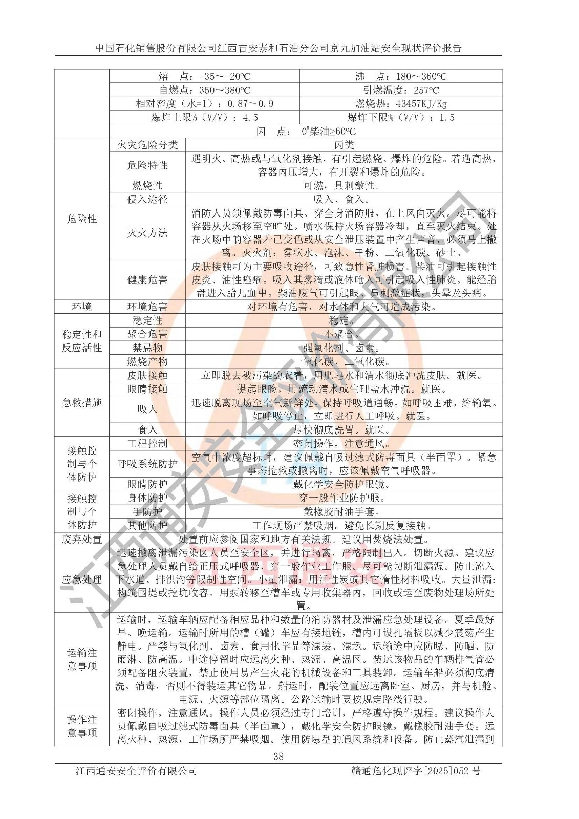 其它 | 在对该项目危险、有害因素辨识分析的基础上,运用安全检查表、预作业条件危险性分析法、危险度评价、重大事故后果分析结果等评价方法对该项目进行了分析评价,评价结果如下: 1、该项目位于江西省吉安市泰和县文田开发区,符合当地规划,与周边环境的距离符合有关标准、规范的要求。 2、总图布置分区明确,布局合理,各建构筑物的防火间距满足规范要求。 3、该项目无**明令淘汰的工艺,设备、设施与工艺条件、内部介质相适应,特种设备及设施较齐全,按规定设置防雷、防静电接地,爆炸危险环境加油机按要求采用防爆型,符合相关标准规范要求。 5、企业设置了安全生产管理机构,配备了专职安全生产管理人员,建立了安全生产责任制和安全生产管理制度,编制了岗位操作规程,编制了生产安全事故应急预案,人员经过相应的培训,企业的安全生产管理正常。 6、作业条件危险性评价结果:在选定的评价单元中,作业危险程度均为“一般危险,需要注意”,作业条件相对安全。 7、危险度评价结果:汽油储罐的危险程度为**危险。油罐采用双层罐埋地设置,按要求设置了通气管,并装设了阻火器;设置了液位监测报警系统和紧急切断系统,设置加油双层管道及双层管道渗漏检测系统,其安全风险可控。 评价结论: 中国石化销售股份有限公司江西吉安泰和石油分公司京九加油站工艺设备和安全设施运行正常,安全管理机制运行正常,安全设施、措施达到设计要求和预期结果,可以满足建设项目安全生产的要求,安全生产管理**,项目具备危险化学品经营单位安全经营条件的要求。 | ||||
