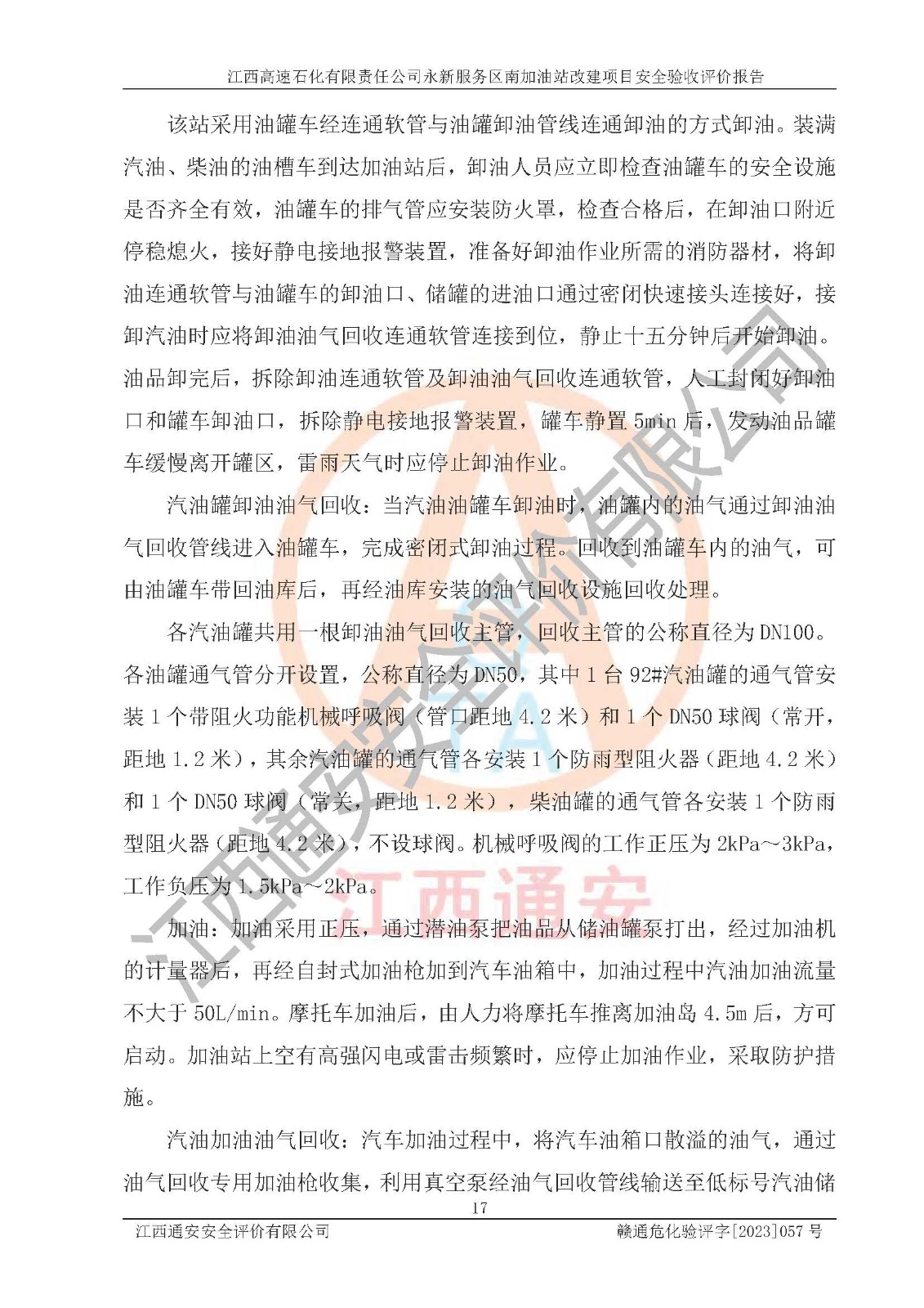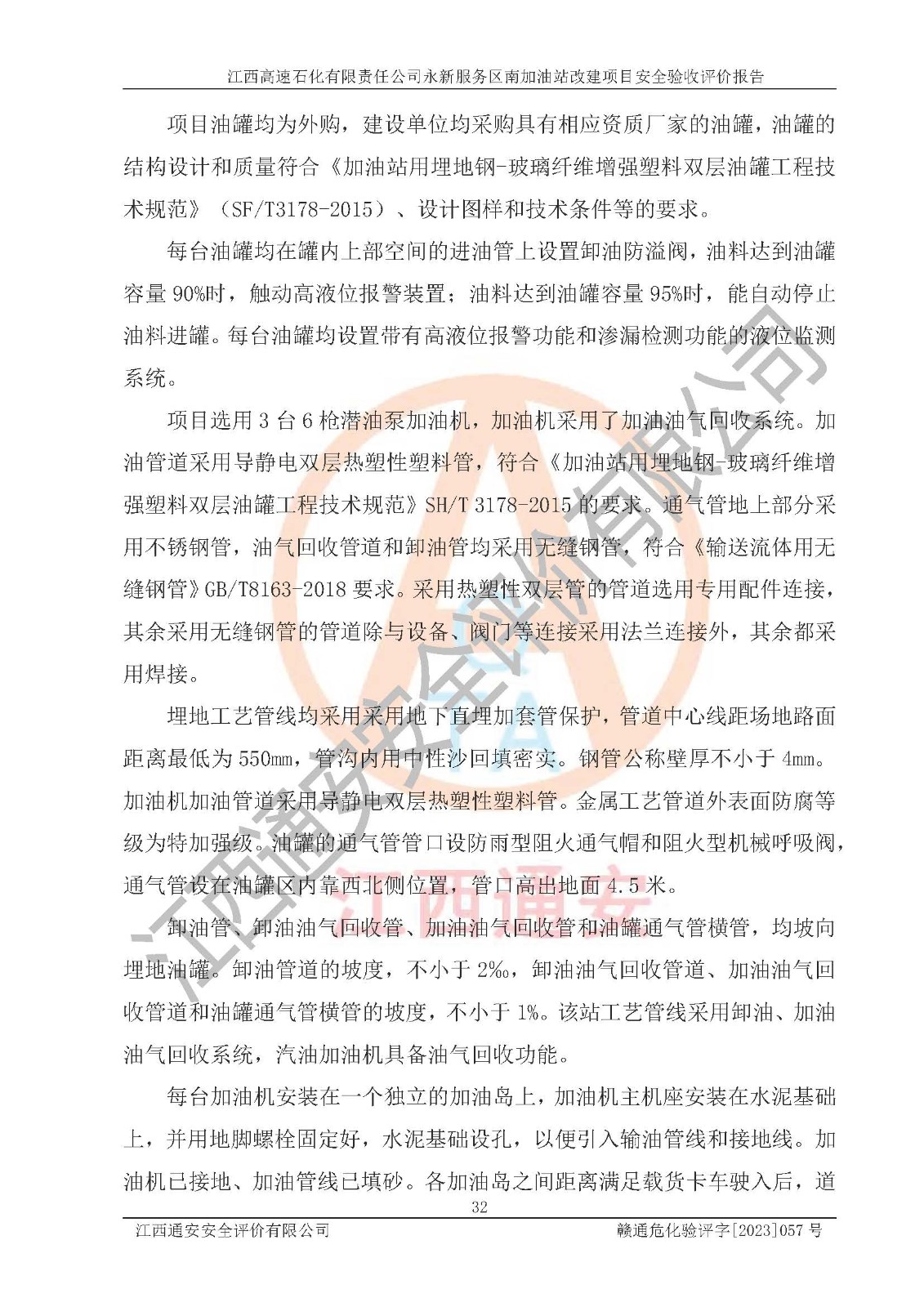 项目简介 | 江西高速石化有限责任公司永新服务区南加油站成立于2019年2月2日,类型:其他有限责任公司分公司;负责人:陈志斌;经营场所为江西省吉安市永新县吉莲高速永新服务区南。该公司营业执照经营范围:石油、石油化工、化纤及其他化工产品的销售;光伏、充电桩、日用百货便利店经营:汽车清洗服务:广告位出租:房屋租赁:食品、计生用品、零售卷烟、雪茄烟:委托代理收取水电费:销售润滑油、燃油料。(依法须经批准的项目,经相关部门批准后方可开展经营活动)。 该加油站于2023年12月4日经吉安市商务局核准变更换发成品油零售经营批准证书,证书编号:油零售证书第吉0299号。**期由2023年12月4日至2028年12月3日。于2023年11月16日由吉安市应急管理局变更发放危险化学品经营许可证,证书编号:赣吉危化经字【2022】360800000010。**期由2022年1月31日至2025年1月30日。 为提升优化加油站的整体布局,更好满足运营服务的需求,同时迎合吉莲高速日益增长的**,江西高速石化有限责任公司永新服务区南加油站决定在原址基础上进行改建,并于2023年3月17日获得永新县工业和信息化局盖章的《江西省工业企业技术改造项目备案通知书》,同意该站在原址上改建。 江西高速石化有限责任公司永新服务区南加油站改建项目位于江西省吉安市永新县吉莲高速永新服务区南,加油站用地面积约2000m2。 该加油站改建前设有4个SF双层埋地储罐,分别为:1台50m³92#汽油双层埋地储罐,1台50m³95#汽油双层埋地储罐;2 台50m³0#柴油双层埋地储罐;柴油折半后总容积为 150 m³,属二级加油站。设有3个六枪3油品潜油泵加油机,分别为:1台0#柴油/92#汽油/95#汽油/0#柴油/92#汽油/95#汽油6枪加油机,1台0#柴油/92#汽油/95#汽油/0#柴油/92#汽油/95#汽油6枪加油机,1台0#柴油/92#汽油/95#汽油/0#柴油/92#汽油/95#汽油6枪加油机。 改建后情况如下:在原有罐区位置上将1台50m³0#柴油双层埋地储罐改造为1台50m³92#汽油双层埋地储罐,更换后设置4台SF双层埋地储罐,其中包括:2台50m³92#汽油双层埋地储罐;1台50m³95#汽油双层埋地储罐;1台50m³0#柴油双层埋地储罐;改建后*大总储量为200m³,柴油折半后总容积为175m³,加油站等级由原来的二级变为一级,设有1台0#柴油/92#汽油/95#汽油/92#汽油/92#汽油/95#汽油6枪3油品加油机,1台0#柴油/92#汽油/95#汽油/0#柴油/92#汽油/95#汽油6枪3油品加油机,1台92#汽油/92#汽油/95#汽油/92#汽油/92#汽油/95#汽油6枪双油品加油机,设有1个尿素加注机(防爆,按柴油加油机确认),加油站内其他设施利旧。 江西高速石化有限责任公司永新服务区南加油站2022年12月委托江西省赣华安全生产科学技术咨询服务中心编制《江西高速石化有限责任公司永新服务区南加油站改建项目安全预评价报告》,并于2023年4月12日取得《危险化学品建设项目安全条件备案告知意见书》(吉市危化项目安条审字[2023]2号)。 江西高速石化有限责任公司永新服务区南加油站2023年4月委托哈尔滨天源石化工程设计有限责任公司编制《江西高速石化有限责任公司永新服务区南加油站改建项目安全设施设计》,并于2023年5月19日取得《危险化学品建设项目安全设施设计审查意见书》(吉市危化项目安设审字〔2023〕10号)。