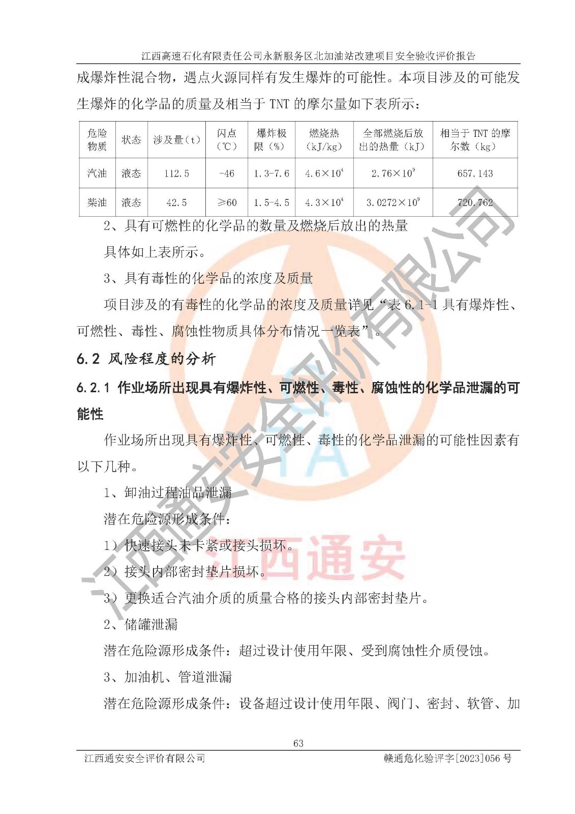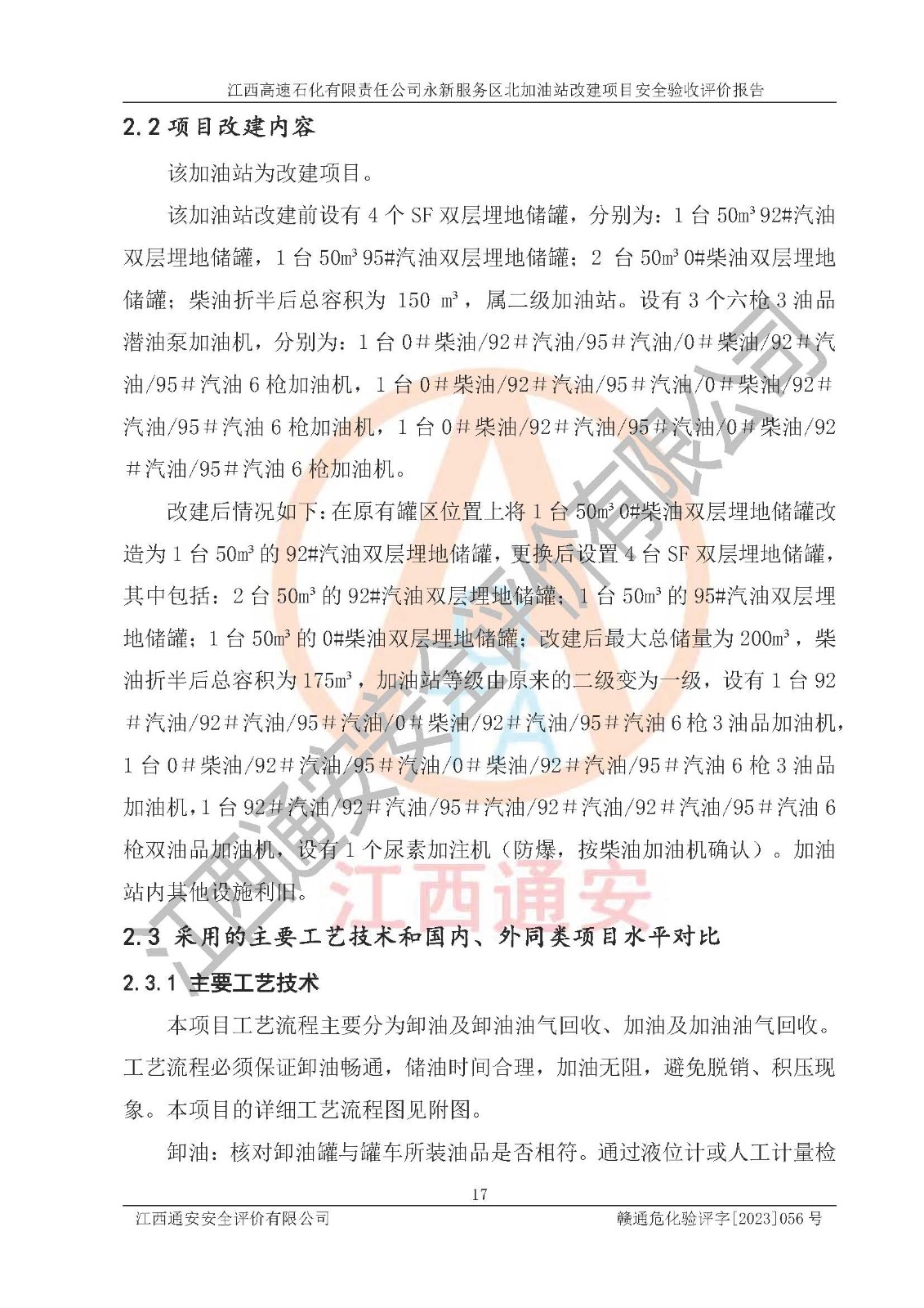项目简介 | 江西高速石化有限责任公司永新服务区北加油站成立于2019年2月2日,类型:其他有限责任公司分公司;负责人:陈志斌;经营场所为江西省吉安市永新县吉莲高速永新服务区北。该公司营业执照经营范围:石油、石油化工、化纤及其他化工产品的销售;光伏、充电桩、日用百货便利店经营:汽车清洗服务:广告位出租:房屋租赁:食品、计生用品、零售卷烟、雪茄烟:委托代理收取水电费:销售润滑油、燃油料。(依法须经批准的项目,经相关部门批准后方可开展经营活动)。 该加油站于2023年12月4日经吉安市商务局核准变更换发成品油零售经营批准证书,证书编号:油零售证书第吉0300号。**期由2023年12月4日至2028年12月3日。于2023年11月16日由吉安市应急管理局变更发放危险化学品经营许可证,证书编号:赣吉危化经字【2022】360800000011。**期由2022年1月31日至2025年1月30日。 为提升优化加油站的整体布局,更好满足运营服务的需求,同时迎合吉莲高速日益增长的**,江西高速石化有限责任公司永新服务区北加油站决定在原址基础上进行改建,并于2023年3月17日获得永新县工业和信息化局盖章的《江西省工业企业技术改造项目备案通知书》,同意该站在原址上改建。 江西高速石化有限责任公司永新服务区北加油站改建项目位于江西省吉安市永新县吉莲高速永新服务区北,加油站用地面积约2000m2。 该加油站改建前设有4个SF双层埋地储罐,分别为:1台50m³92#汽油双层埋地储罐,1台50m³的95#汽油双层埋地储罐;2 台50m³的0#柴油双层埋地储罐;柴油折半后总容积为 150 m³,属二级加油站。设有3个六枪3油品潜油泵加油机,分别为:1台0#柴油/92#汽油/95#汽油/0#柴油/92#汽油/95#汽油6枪加油机,1台0#柴油/92#汽油/95#汽油/0#柴油/92#汽油/95#汽油6枪加油机,1台0#柴油/92#汽油/95#汽油/0#柴油/92#汽油/95#汽油6枪加油机。 改建后情况如下:在原有罐区位置上将1台50m³0#柴油双层埋地储罐改造为1台50m³的92#汽油双层埋地储罐,更换后设置4台SF双层埋地储罐,其中包括:2台50m³的92#汽油双层埋地储罐;1台50m³的95#汽油双层埋地储罐;1台50m³的0#柴油双层埋地储罐;改建后*大总储量为200m³,柴油折半后总容积为175m³,加油站等级由原来的二级变为一级,设有1台92#汽油/92#汽油/95#汽油/0#柴油/92#汽油/95#汽油6枪3油品加油机,1台0#柴油/92#汽油/95#汽油/0#柴油/92#汽油/95#汽油6枪3油品加油机,1台92#汽油/92#汽油/95#汽油/92#汽油/92#汽油/95#汽油6枪双油品加油机,设有1个尿素加注机(防爆,按柴油加油机确认)。加油站内其他设施利旧。 江西高速石化有限责任公司永新服务区北加油站2022年12月委托江西赣安安全生产科学技术咨询服务中心编制《江西高速石化有限责任公司永新服务区北加油站改建项目安全预评价报告》,并于2023年4月12日取得《危险化学品建设项目安全条件备案告知意见书》(吉市危化项目安条审字[2023]3号)。 江西高速石化有限责任公司永新服务区北加油站2023年4月委托哈尔滨天源石化工程设计有限责任公司编制《江西高速石化有限责任公司永新服务区北加油站改建项目安全设施设计》,并于2023年5月19日取得《危险化学品建设项目安全设施设计审查意见书》(吉市危化项目安设审字〔2023〕11号)。