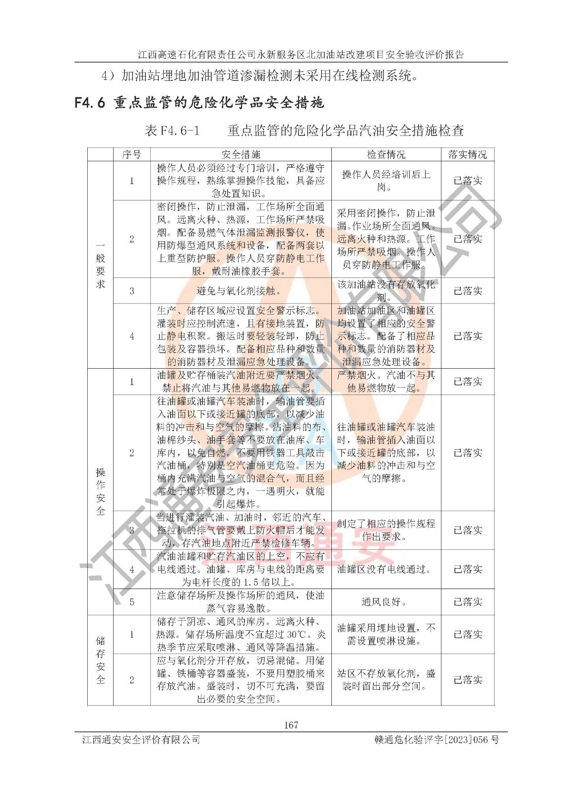 其它 | 在对该项目危险、有害因素辨识分析的基础上,运用安全检查表、预作业条件危险性分析法、危险度评价、重大事故后果分析结果等评价方法对该项目进行了分析评价,评价结果如下: 1、该项目位于江西省吉安市永新县吉莲高速永新服务区北,符合当地规划,与周边环境的距离符合有关标准、规范的要求。 2、总图布置分区明确,布局合理,各建构筑物的防火间距满足规范要求。 3、该项目无**明令淘汰的工艺,设备、设施与工艺条件、内部介质相适应,特种设备及设施较齐全,按规定设置防雷、防静电接地,爆炸危险环境加油机按要求采用防爆型,符合相关标准规范要求。 5、企业设置了安全生产管理机构,配备了专职安全生产管理人员,建立了安全生产责任制和安全生产管理制度,编制了岗位操作规程,编制了生产安全事故应急预案,人员经过相应的培训,企业的安全生产管理正常。 6、作业条件危险性评价结果:在选定的评价单元中,作业危险程度均为“一般危险,需要注意”,作业条件相对安全。 7、危险度评价结果:汽油储罐的危险程度为**危险。其设置了储油罐安装高液位报警功能的液位监测系统,当油料达到油罐容量90%时,触动高液位报警装置,油料达到油罐容量95%时,自动停止油料继续进罐。同时,也采取了防止油品渗漏的保护措施,如采用双层油罐,埋地加油管道采用双层管道,渗漏检测在线检测系统等,可以满足安全生产条件要求。 评价结论: 江西高速石化有限责任公司永新服务区北加油站工艺设备和安全设施运行正常,安全管理机制运行正常,安全设施、措施达到设计要求和预期结果,可以满足建设项目安全生产的要求,安全生产管理**,项目具备危险化学品经营单位安全经营条件的要求。 | ||||