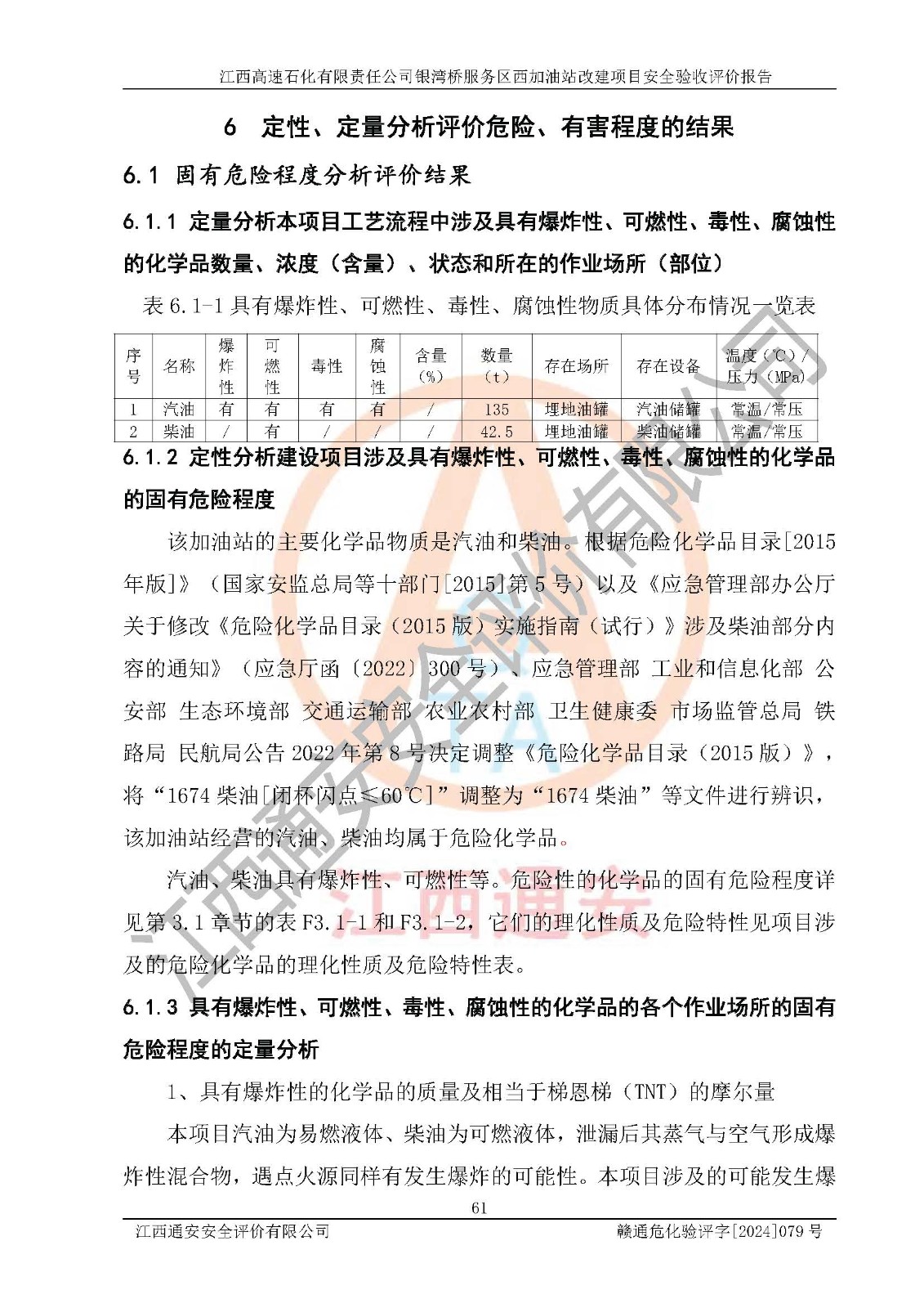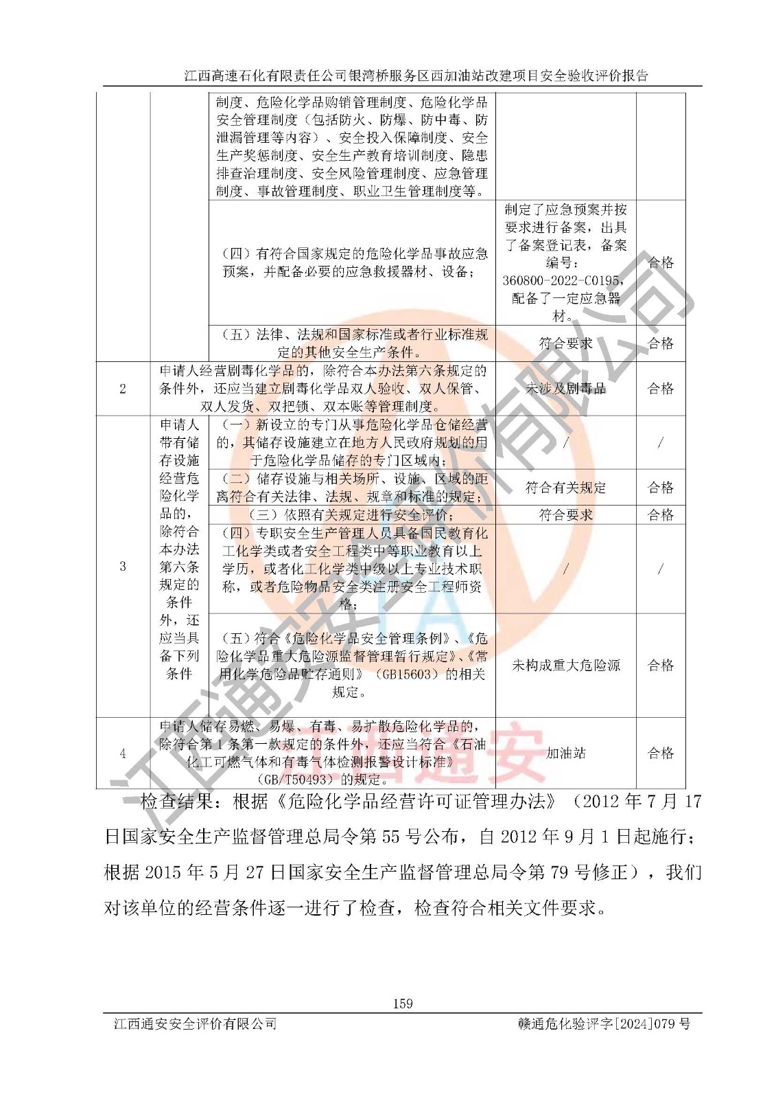 其它 | 在对该项目危险、有害因素辨识分析的基础上,运用安全检查表、预作业条件危险性分析法、危险度评价、重大事故后果分析结果等评价方法对该项目进行了分析评价,评价结果如下: 1、该项目位于吉安县固江镇武吉高速银湾桥服务区,符合当地规划,与周边环境的距离符合有关标准、规范的要求。 2、总图布置分区明确,布局合理,各建构筑物的防火间距满足规范要求。 3、该项目无**明令淘汰的工艺,设备、设施与工艺条件、内部介质相适应,特种设备及设施较齐全,按规定设置防雷、防静电接地,爆炸危险环境加油机按要求采用防爆型,符合相关标准规范要求。 5、企业设置了安全生产管理机构,配备了专职安全生产管理人员,建立了安全生产责任制和安全生产管理制度,编制了岗位操作规程,编制了生产安全事故应急预案,人员经过相应的培训,企业的安全生产管理正常。 6、作业条件危险性评价结果:在选定的评价单元中,作业危险程度均为“一般危险,需要注意”,作业条件相对安全。 7、危险度评价结果:汽油储罐的危险程度为**危险。其设置了当油料达到油罐容量90%时,触动高液位报警装置,油料达到油罐容量95%时,自动停止油料继续进罐。同时,也采取了防止油品渗漏的保护措施,如采用双层油罐,渗漏检测在线检测系统,埋地加油管道采用双层管道等,可以满足安全生产条件要求。 评价结论: 江西高速石化有限责任公司银湾桥服务区西加油站工艺设备和安全设施运行正常,安全管理机制运行正常,安全设施、措施达到设计要求和预期结果,可以满足建设项目安全生产的要求,安全生产管理**,项目具备危险化学品经营单位安全经营条件的要求。 | ||||