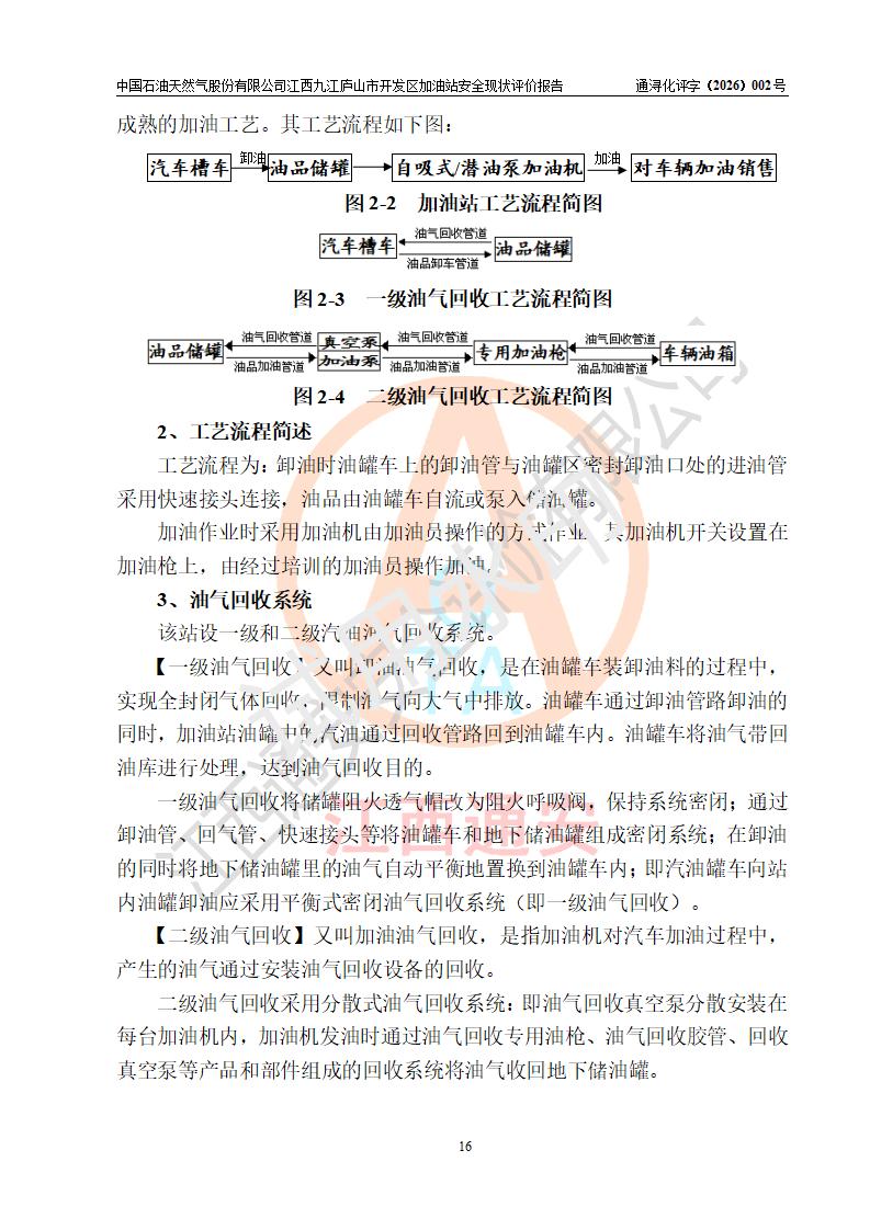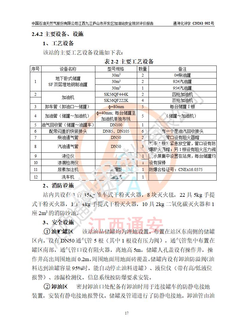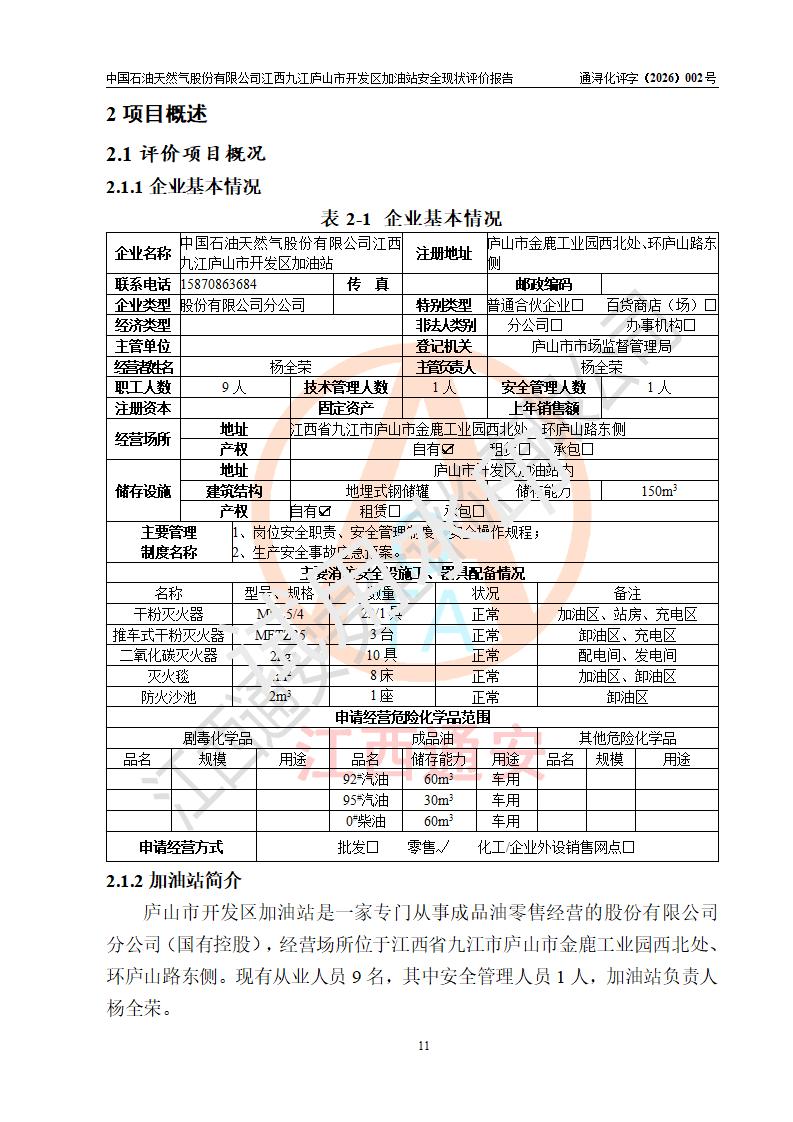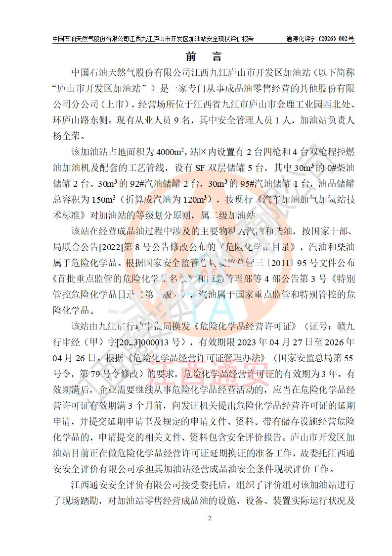 项目简介 | 中国石油天然气股份有限公司江西九江庐山市开发区加油站是一家专门从事成品油零售经营的其他股份有限公司分公司(上市),经营场所位于江西省九江市庐山市金鹿工业园西北处、环庐山路东侧。现有从业人员9名,其中安全管理人员1人,加油站负责人杨全荣。 该加油站占地面积为4000m2,站区内设置有2台四枪和4台双枪程控燃油加油机及配套的工艺管线,设有SF双层储罐5台,其中30m3的0#柴油储罐2台、30m3的92#汽油储罐2台,30m3的95#汽油储罐1台,油品储罐总容积为150m3(折算成汽油为120m3),按现行《汽车加油加气加氢站技术标准》对加油站的等级划分原则,属二级加油站。 该站由九江市行政审批局换发《危险化学品经营许可证》(证号:赣九行审经(甲)字[2023]000013号),**期限2023年04月27日至2026年04月26日。 | |||
