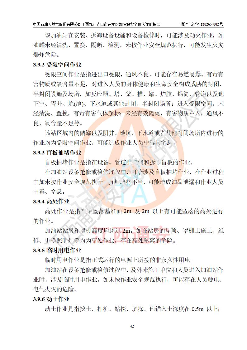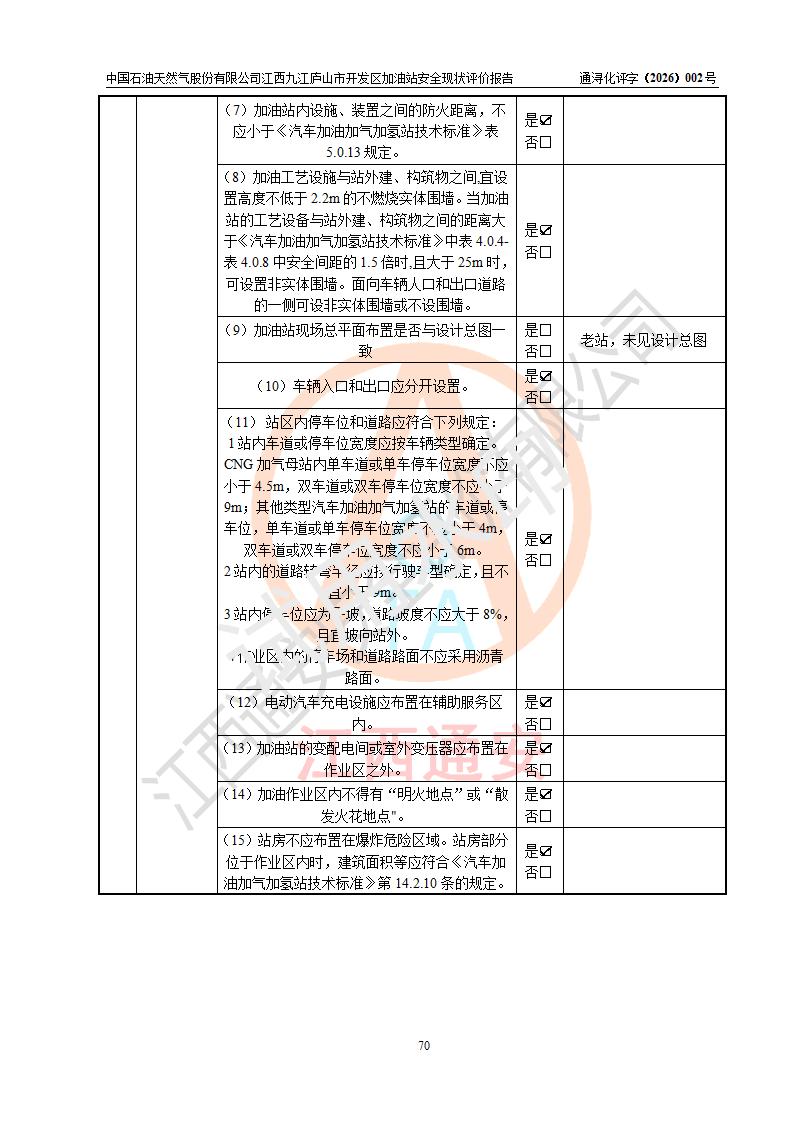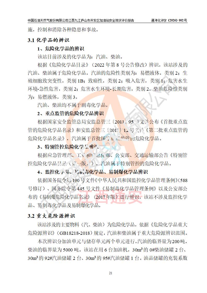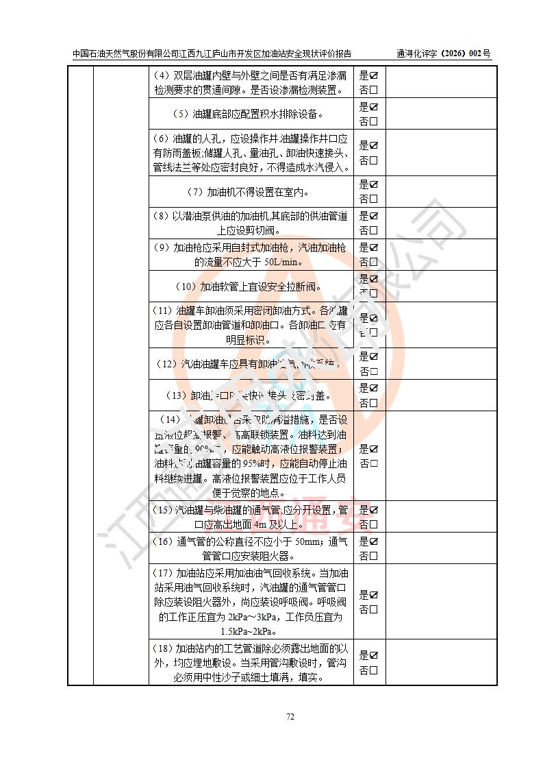 项目简介 | 中国石油天然气股份有限公司江西九江庐山市开发区加油站是一家专门从事成品油零售经营的其他股份有限公司分公司(上市),经营场所位于江西省九江市庐山市金鹿工业园西北处、环庐山路东侧。现有从业人员9名,其中安全管理人员1人,加油站负责人杨全荣。 该加油站占地面积为4000m2,站区内设置有2台四枪和4台双枪程控燃油加油机及配套的工艺管线,设有SF双层储罐5台,其中30m3的0#柴油储罐2台、30m3的92#汽油储罐2台,30m3的95#汽油储罐1台,油品储罐总容积为150m3(折算成汽油为120m3),按现行《汽车加油加气加氢站技术标准》对加油站的等级划分原则,属二级加油站。 该站由九江市行政审批局换发《危险化学品经营许可证》(证号:赣九行审经(甲)字[2023]000013号),**期限2023年04月27日至2026年04月26日。 | |||