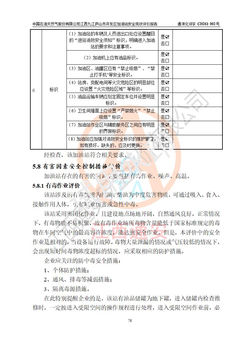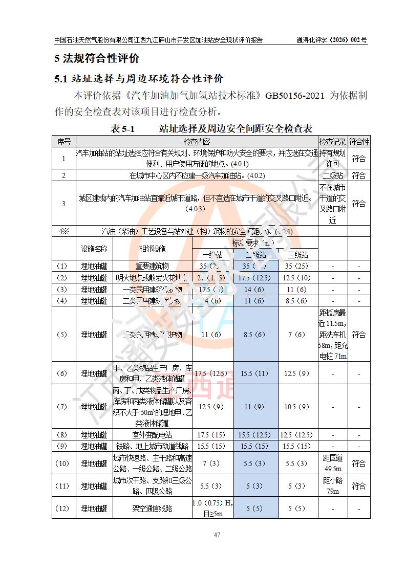 评价结论 | 中国石油天然气股份有限公司江西九江庐山市开发区加油站涉及的安全条件、安全经营条件、安全生产管理符合《危险化学品经营许可证管理办法》、《汽车加油加气加氢站技术标准》等**有关法规、标准、规范要求,能满足危险化学品经营安全条件。 | |||