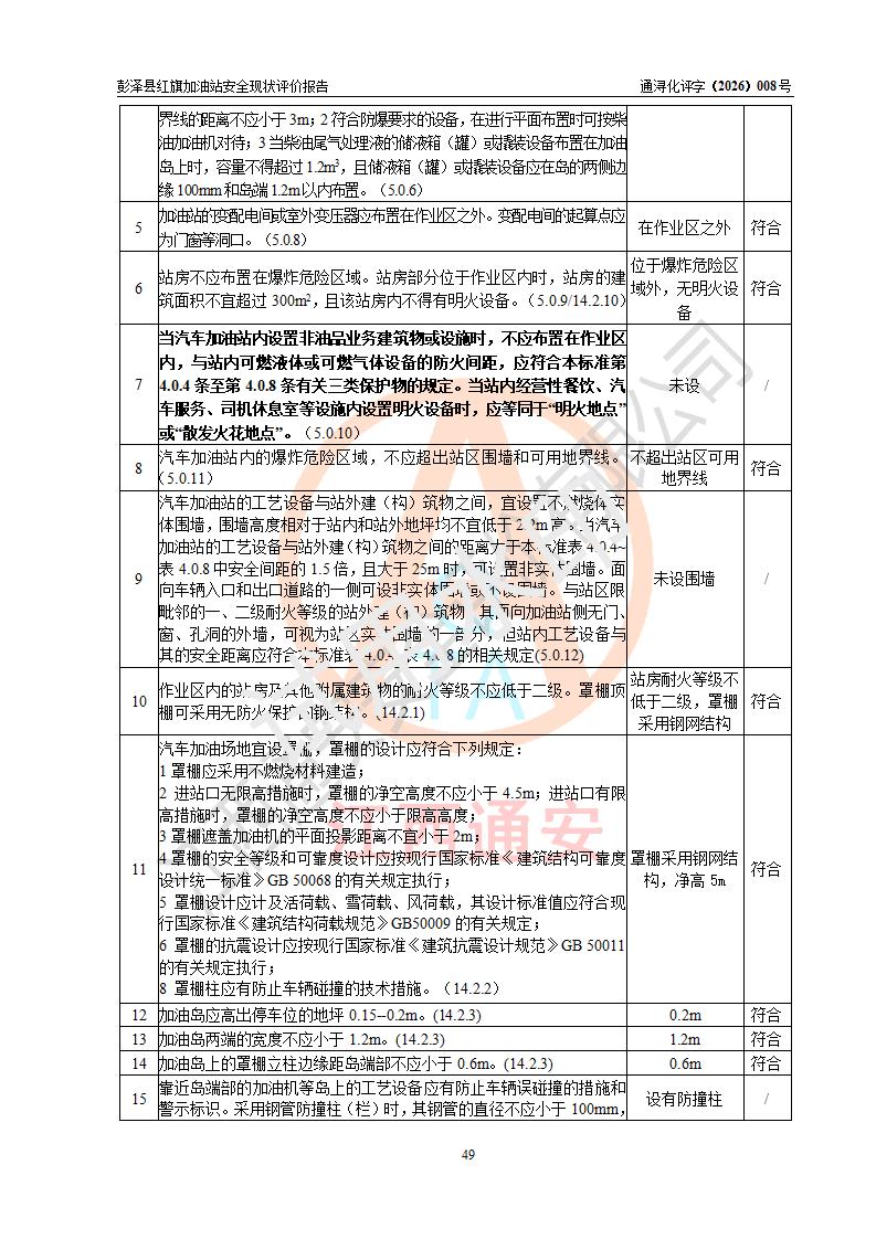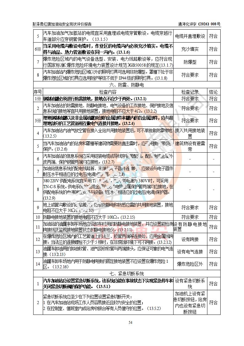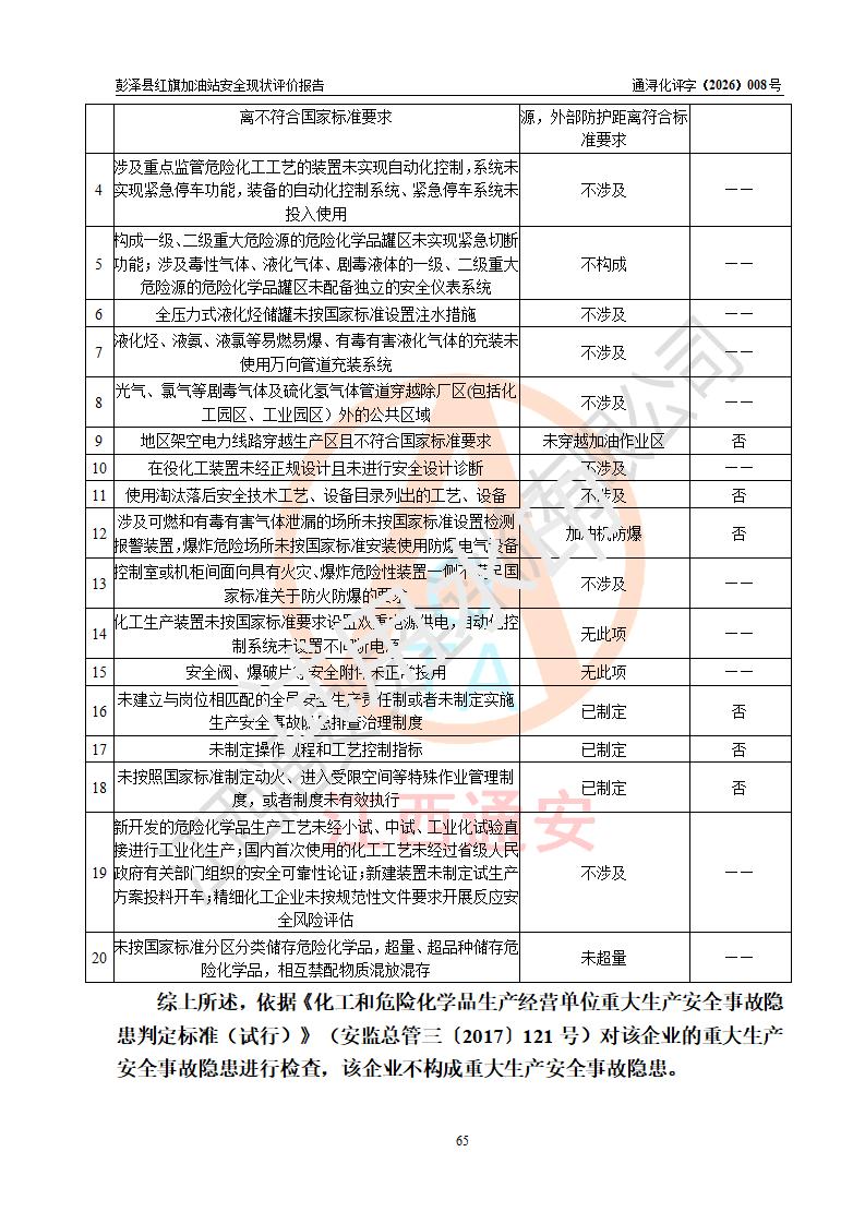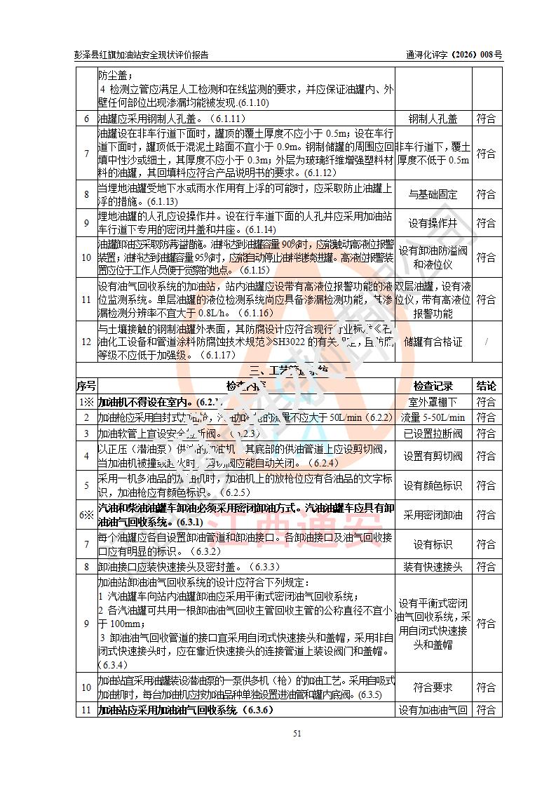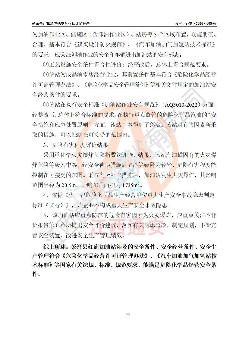 评价结论 | 彭泽县红旗加油站涉及的安全条件、安全经营条件、安全生产管理符合《危险化学品经营许可证管理办法》、《汽车加油加气加氢站技术标准》等**有关法规、标准、规范要求,能满足危险化学品经营安全条件。 | |||