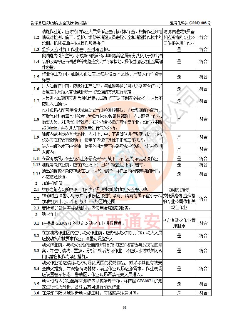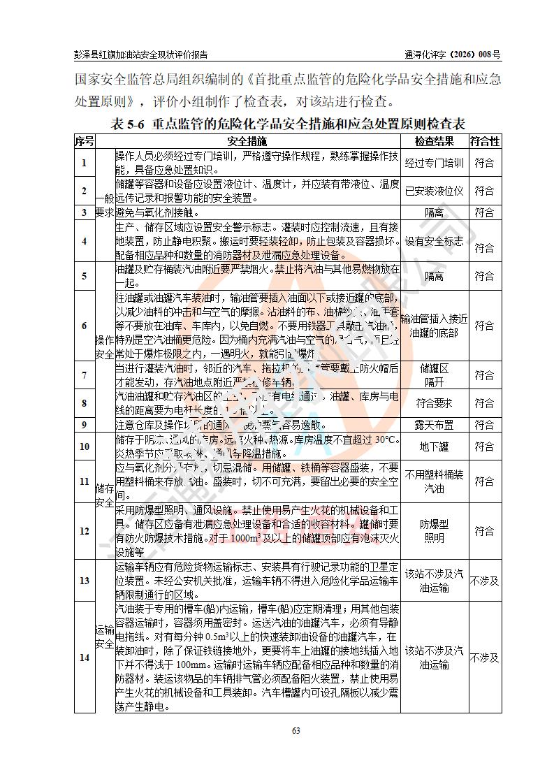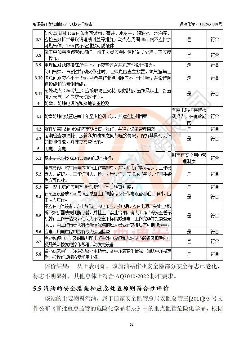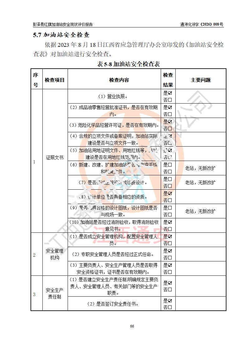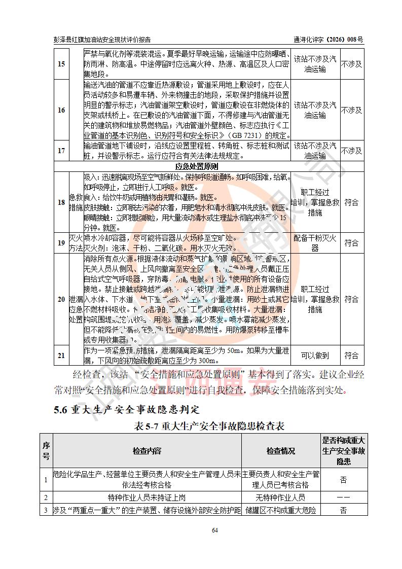 评价结论 | 彭泽县红旗加油站涉及的安全条件、安全经营条件、安全生产管理符合《危险化学品经营许可证管理办法》、《汽车加油加气加氢站技术标准》等**有关法规、标准、规范要求,能满足危险化学品经营安全条件。 | |||