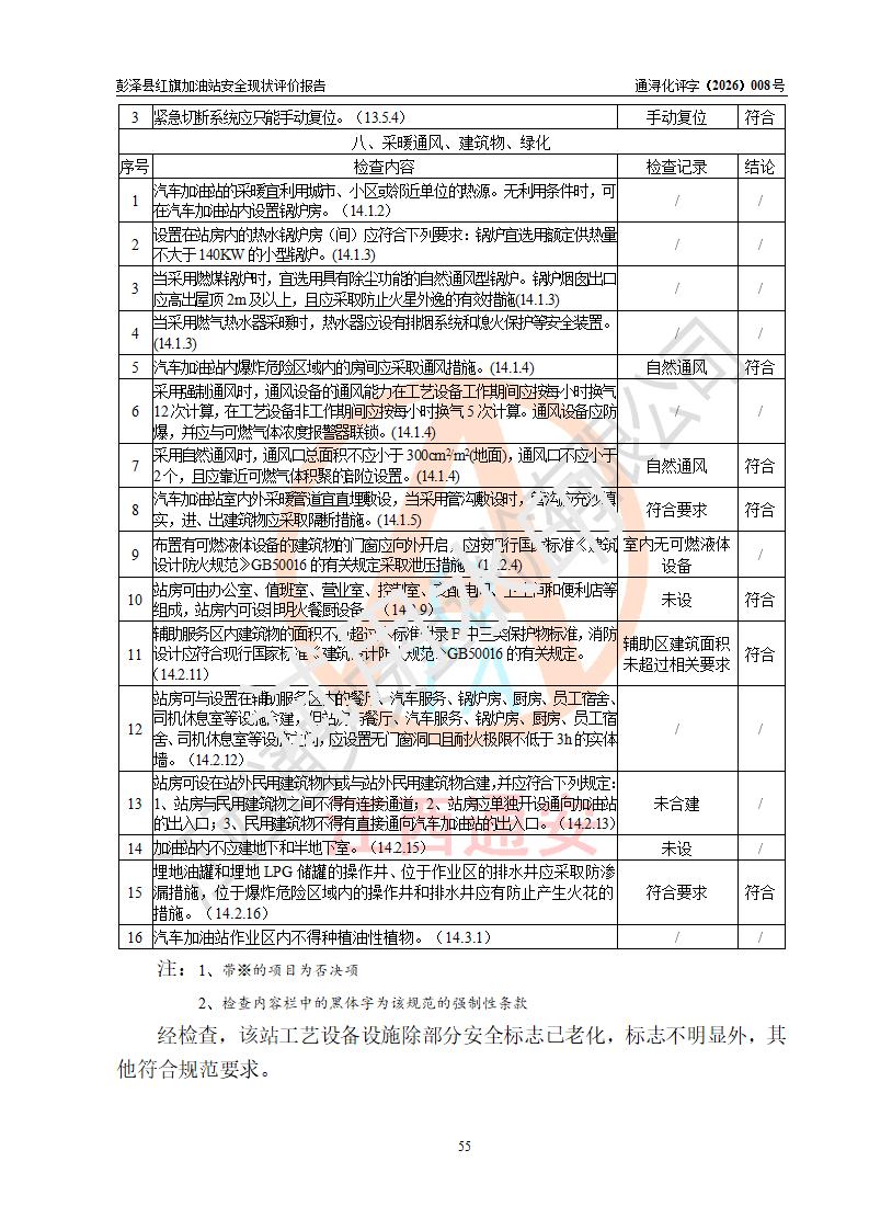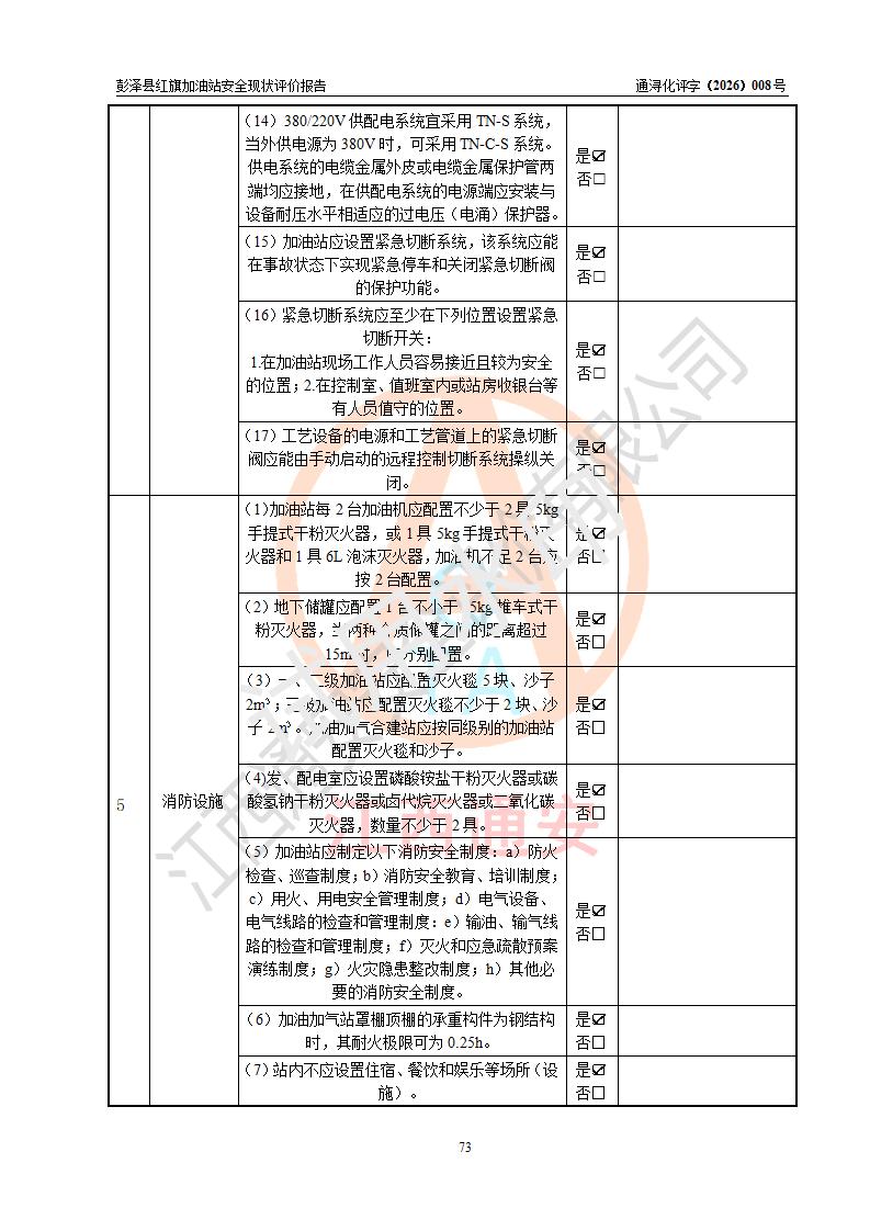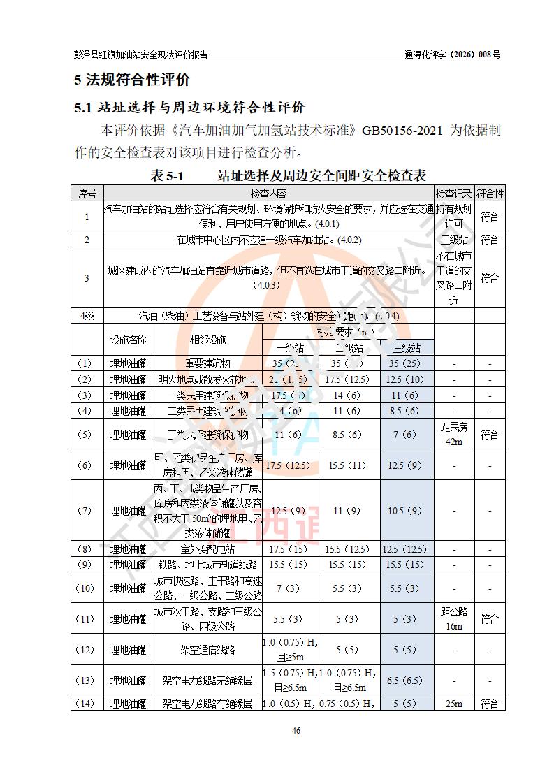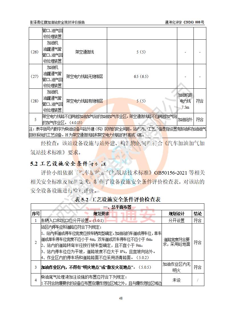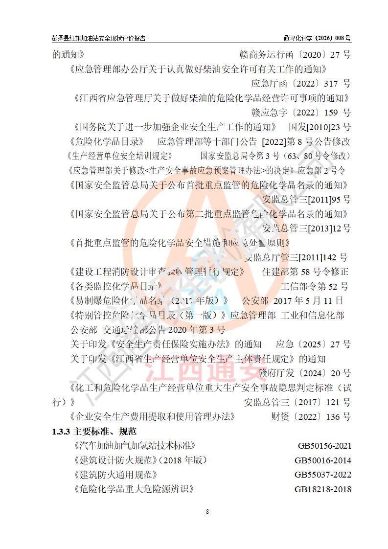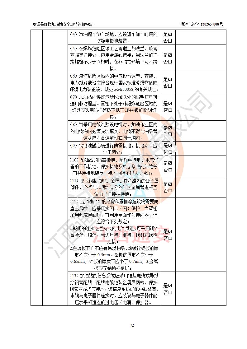 评价结论 | 彭泽县红旗加油站涉及的安全条件、安全经营条件、安全生产管理符合《危险化学品经营许可证管理办法》、《汽车加油加气加氢站技术标准》等**有关法规、标准、规范要求,能满足危险化学品经营安全条件。 | |||