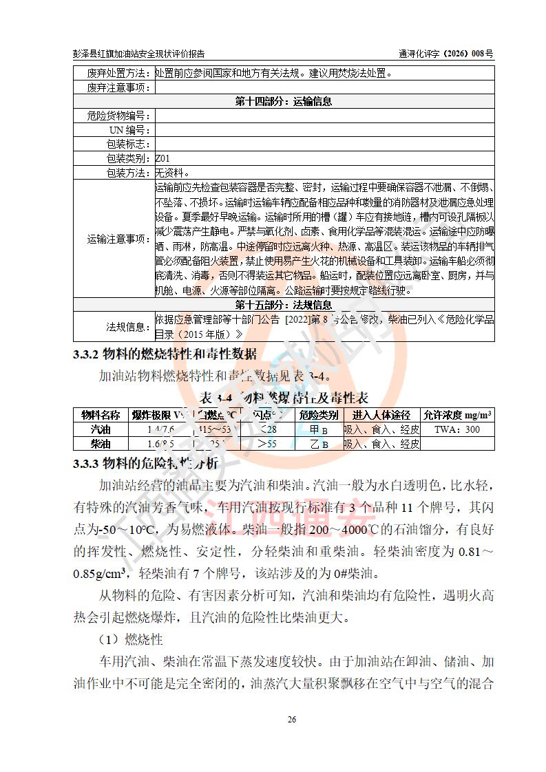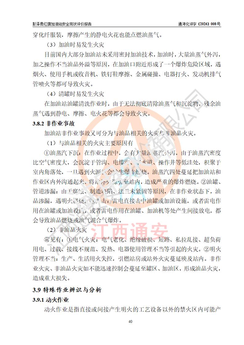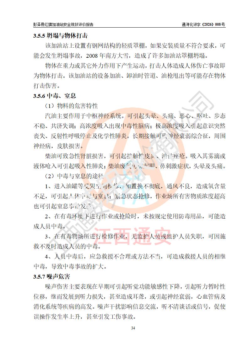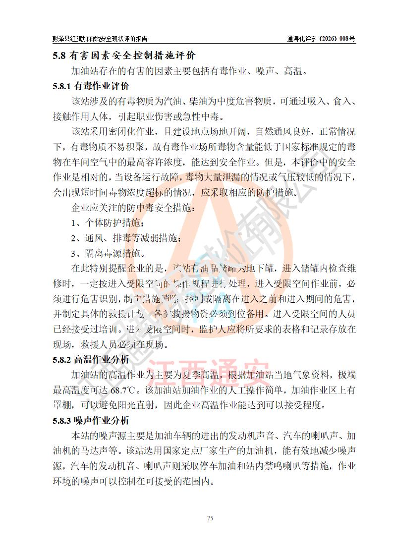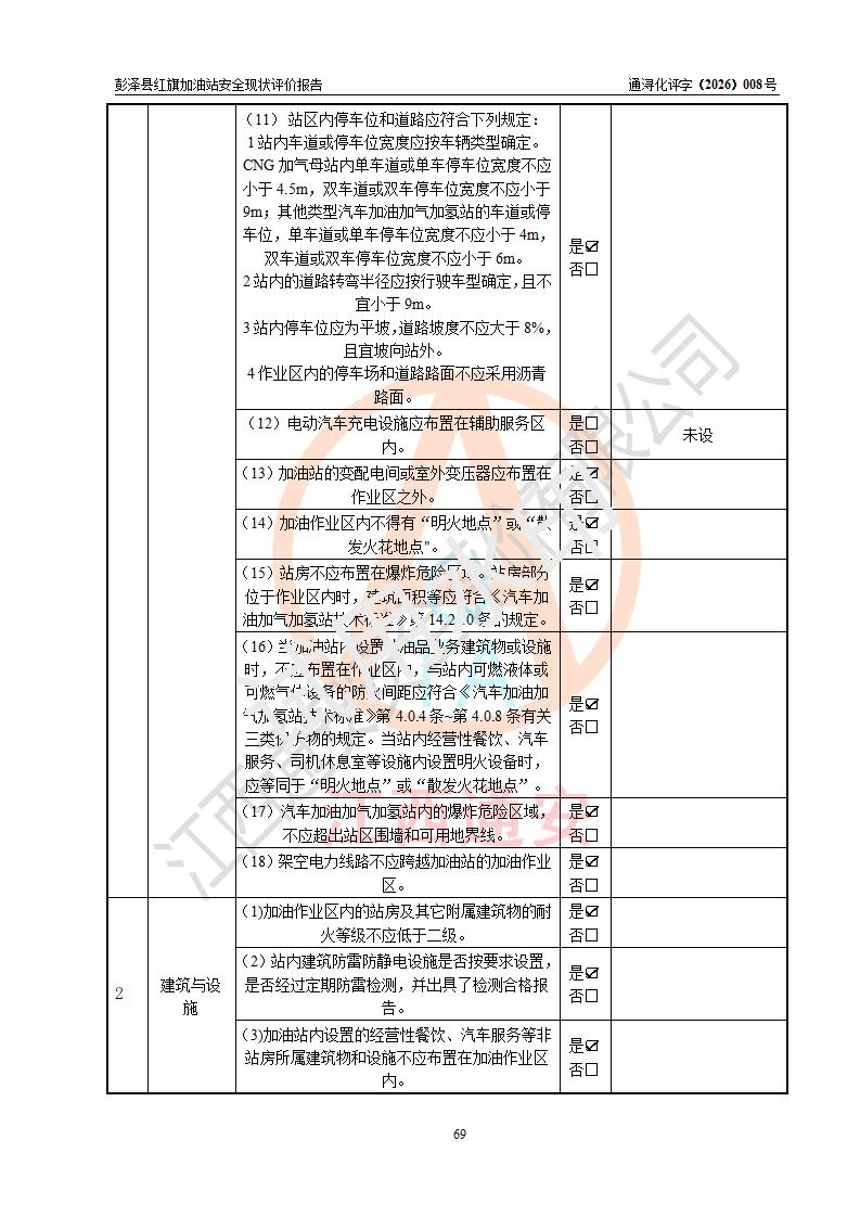 评价结论 | 彭泽县红旗加油站涉及的安全条件、安全经营条件、安全生产管理符合《危险化学品经营许可证管理办法》、《汽车加油加气加氢站技术标准》等**有关法规、标准、规范要求,能满足危险化学品经营安全条件。 | |||