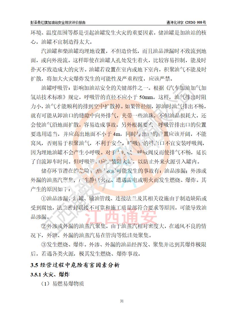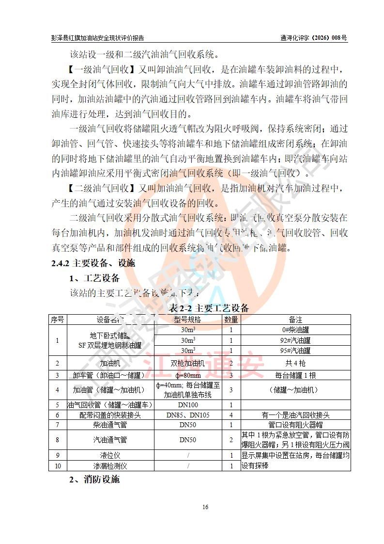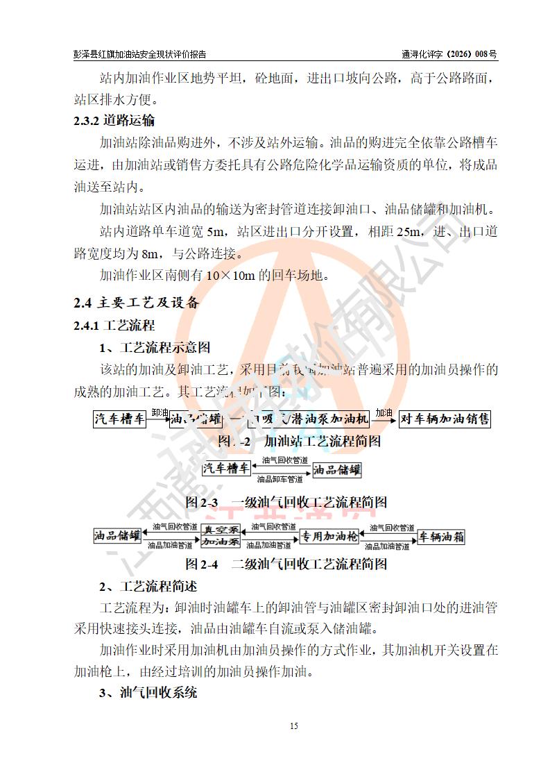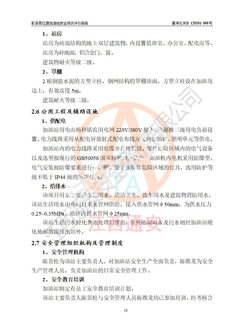 项目简介 | 彭泽县红旗加油站是一家专门从事成品油零售经营的个体工商户,经营场所位于江西省九江市彭泽县杨梓镇红旗村。现有从业人员3名,其中安全管理人员1人,加油站负责人陈贵松。 该加油站占地面积为1376.2m2,站区内设置有2台双枪程控燃油加油机及配套的工艺管线,设有SF双层储罐3台,其中30m3的0#柴油储罐1台、30m3的92#汽油储罐1台、30m3的95#汽油储罐1台,油品储罐总容积为90m3(折算成汽油为75m3),按现行《汽车加油加气加氢站技术标准》对加油站的等级划分原则,属三级加油站。 该站由九江市行政审批局换发《危险化学品经营许可证》(证号:赣九行审经(甲)字[2023]000016号),**期限2023年04月18日至2026年04月17日。 | |||