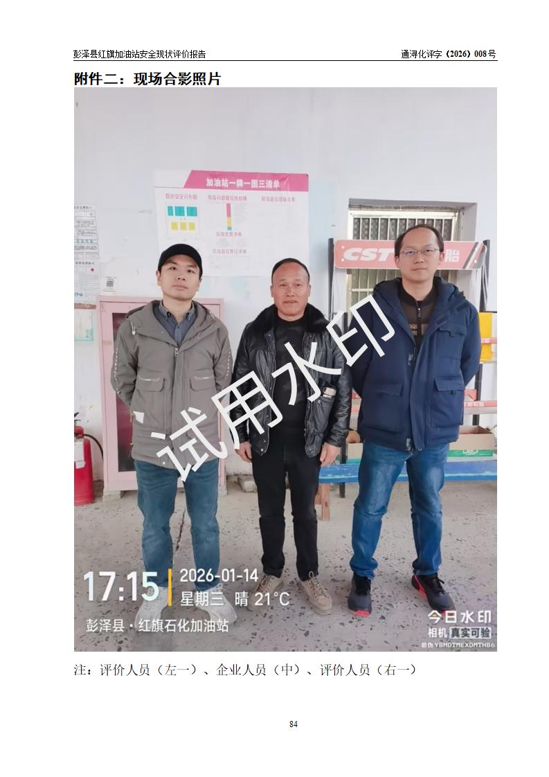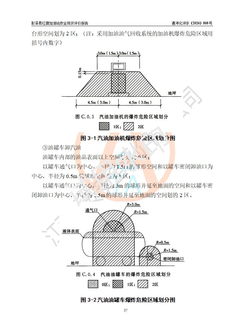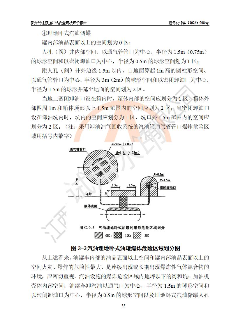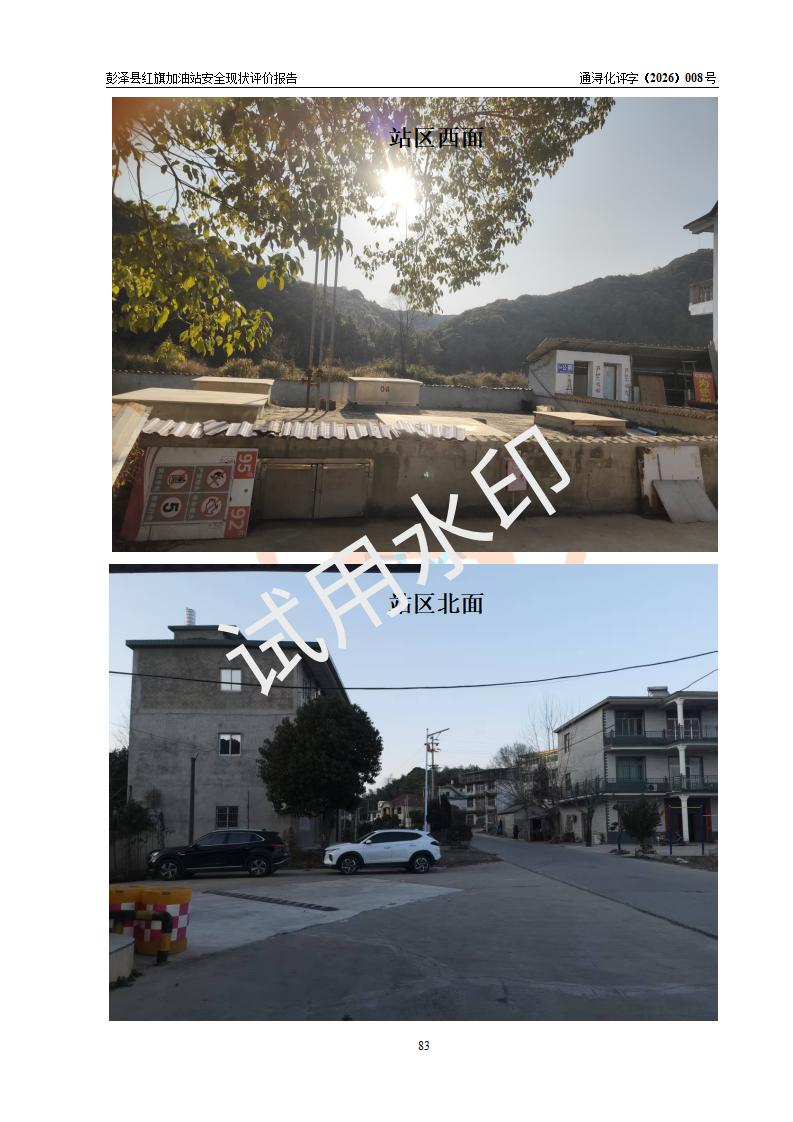 项目简介 | 彭泽县红旗加油站是一家专门从事成品油零售经营的个体工商户,经营场所位于江西省九江市彭泽县杨梓镇红旗村。现有从业人员3名,其中安全管理人员1人,加油站负责人陈贵松。 该加油站占地面积为1376.2m2,站区内设置有2台双枪程控燃油加油机及配套的工艺管线,设有SF双层储罐3台,其中30m3的0#柴油储罐1台、30m3的92#汽油储罐1台、30m3的95#汽油储罐1台,油品储罐总容积为90m3(折算成汽油为75m3),按现行《汽车加油加气加氢站技术标准》对加油站的等级划分原则,属三级加油站。 该站由九江市行政审批局换发《危险化学品经营许可证》(证号:赣九行审经(甲)字[2023]000016号),**期限2023年04月18日至2026年04月17日。 | |||