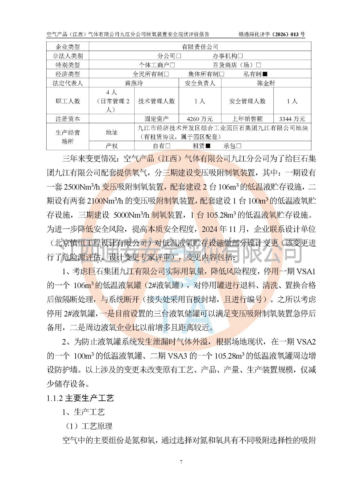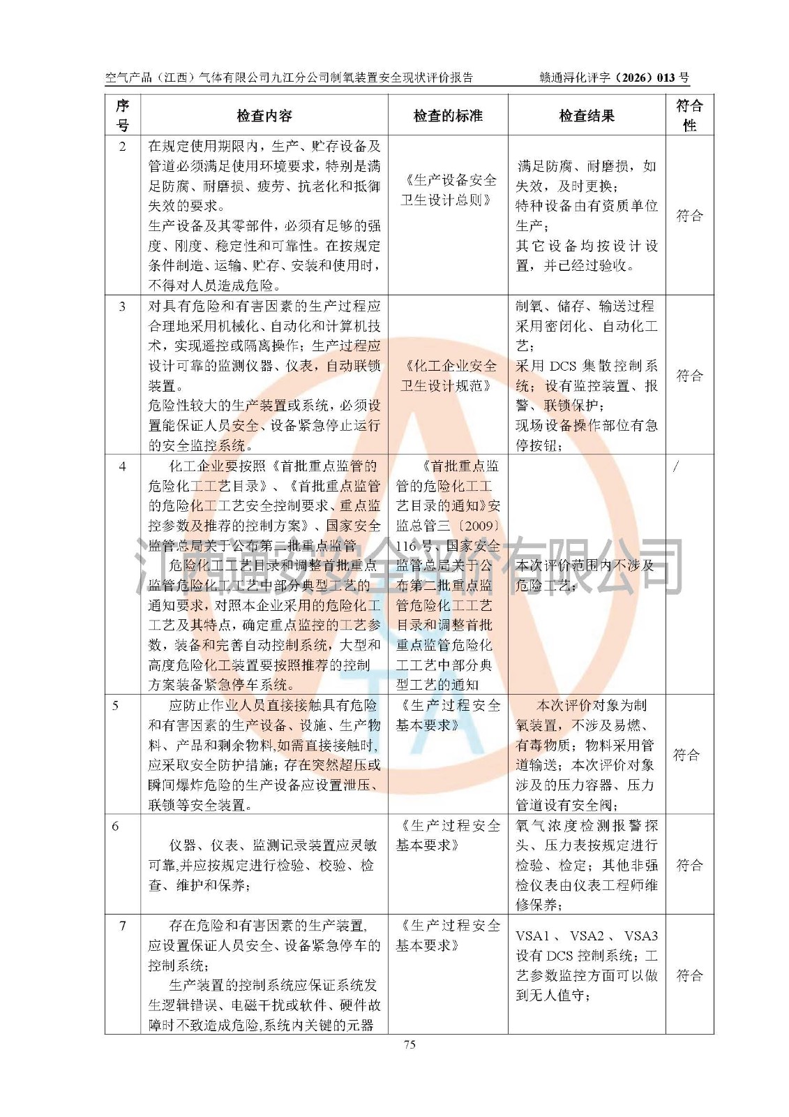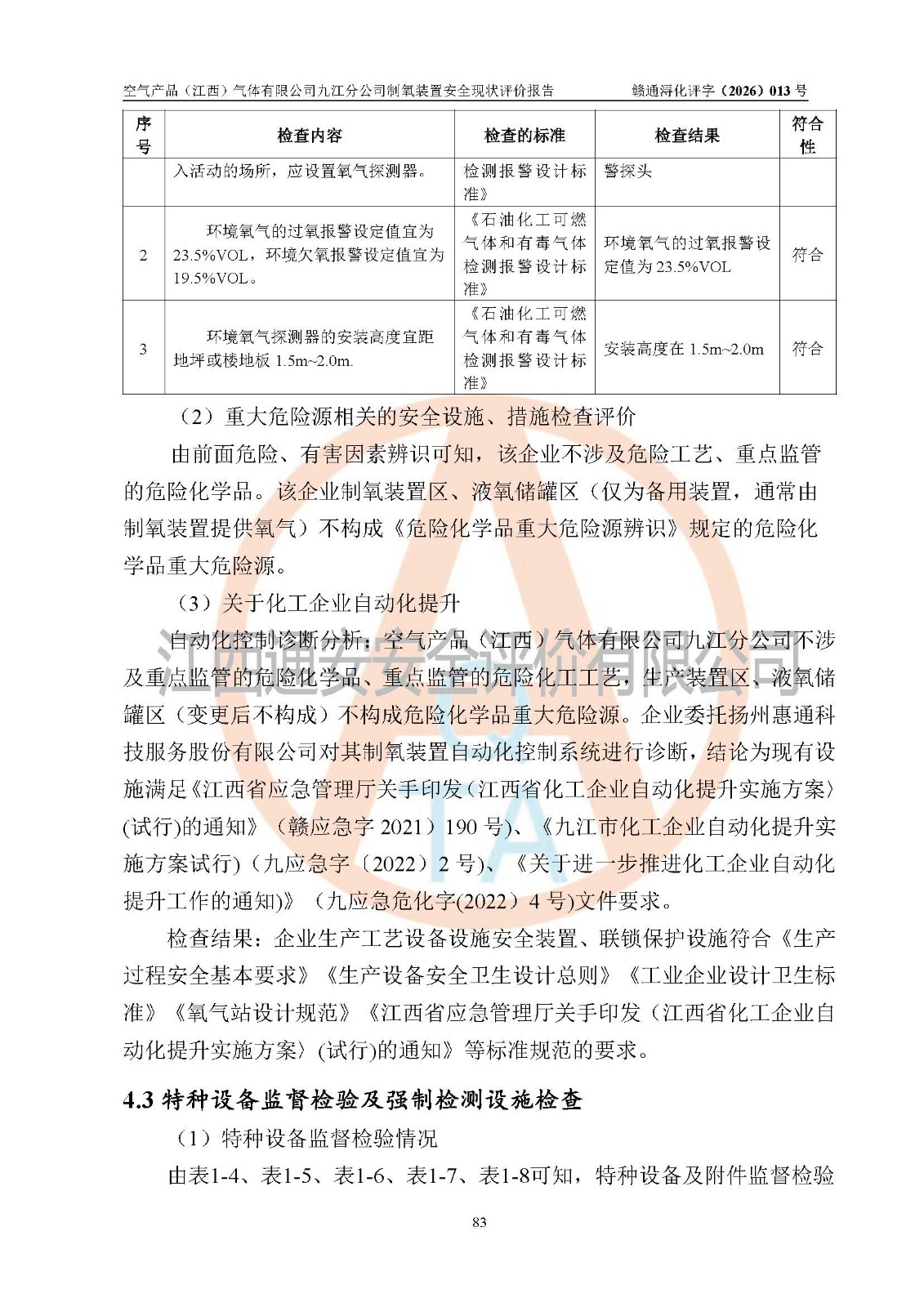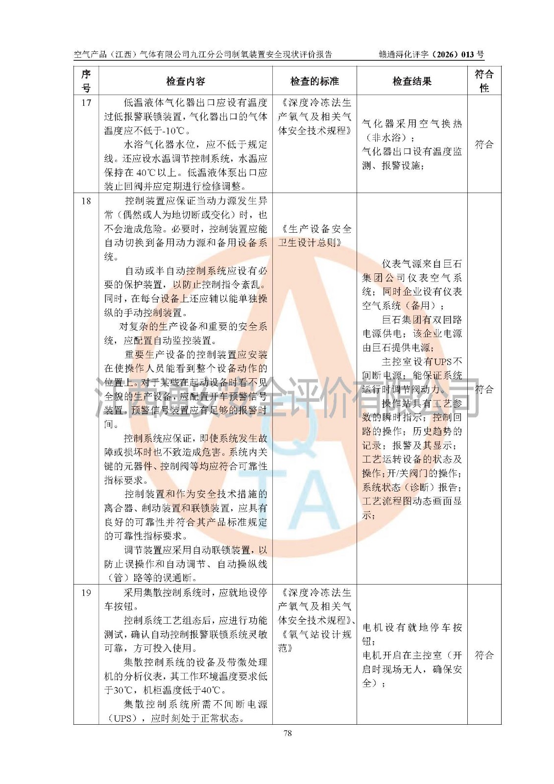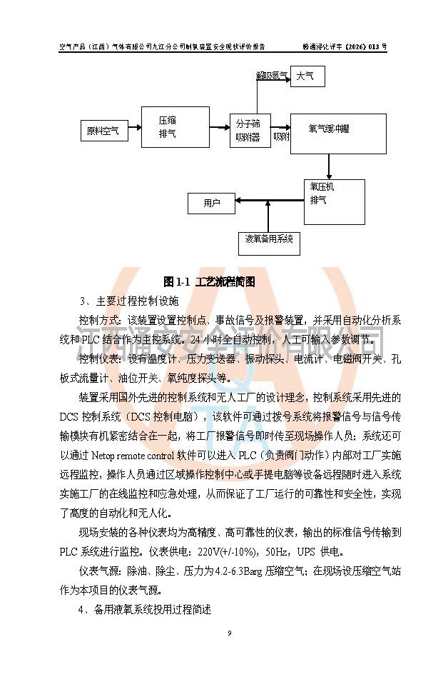 经评价组评价,空气产品(江西)气体有限公司九江分公司制氧装置现场总体布局、设备布置情况与设计图纸一致,企业在役装置不涉及危险工艺、重点监管的危险化学品、重大危险源,按设计设置有DCS系统(现场供气装置自动化程度高,做到无人值守),符合《江西省应急管理厅关手印发(江西省化工企业自动化提升实施方案〉(试行)的通知》规定。企业主要负责人(化学工程专业)及安全生产管理人员(化工安全注册安全工程师)已取得安全生产知识和管理能力考核合格证,均有三年以上化工管理经历。