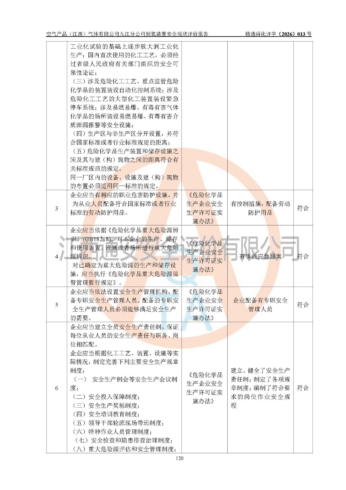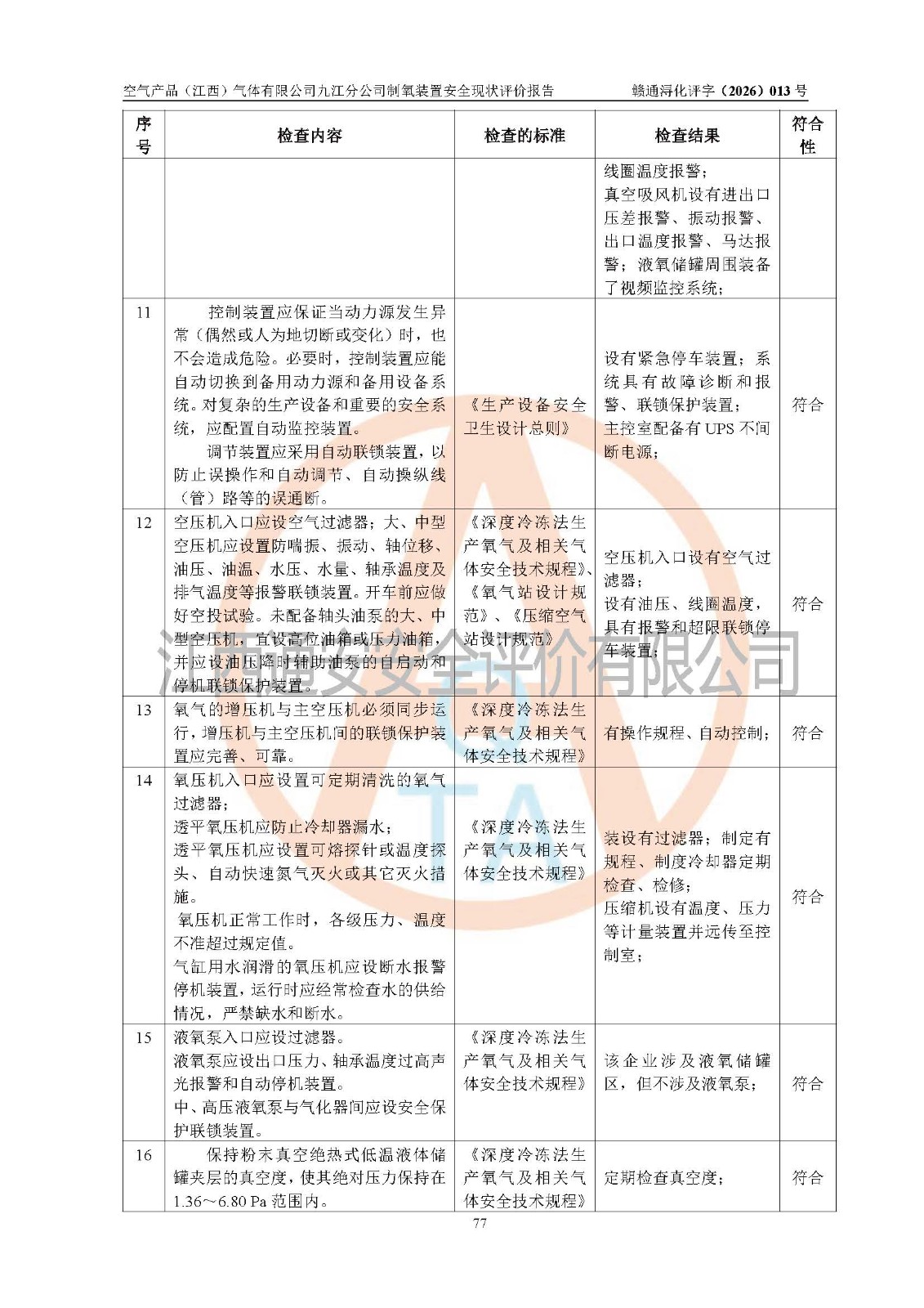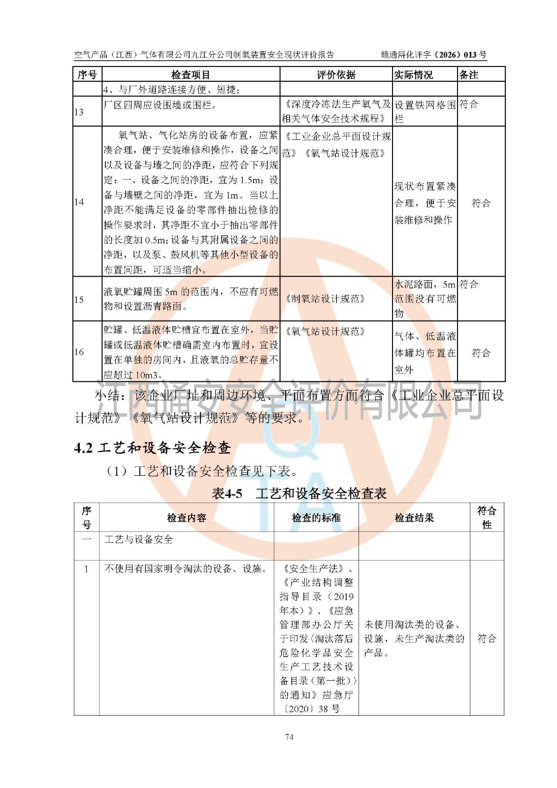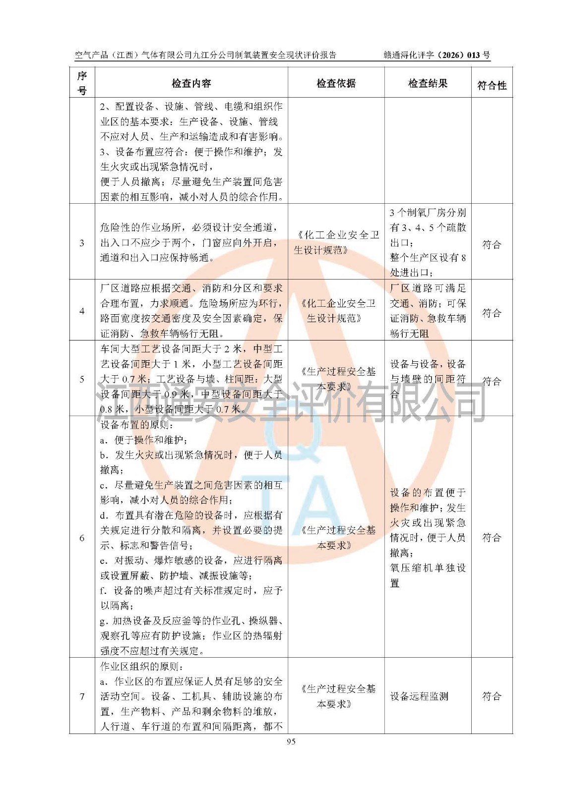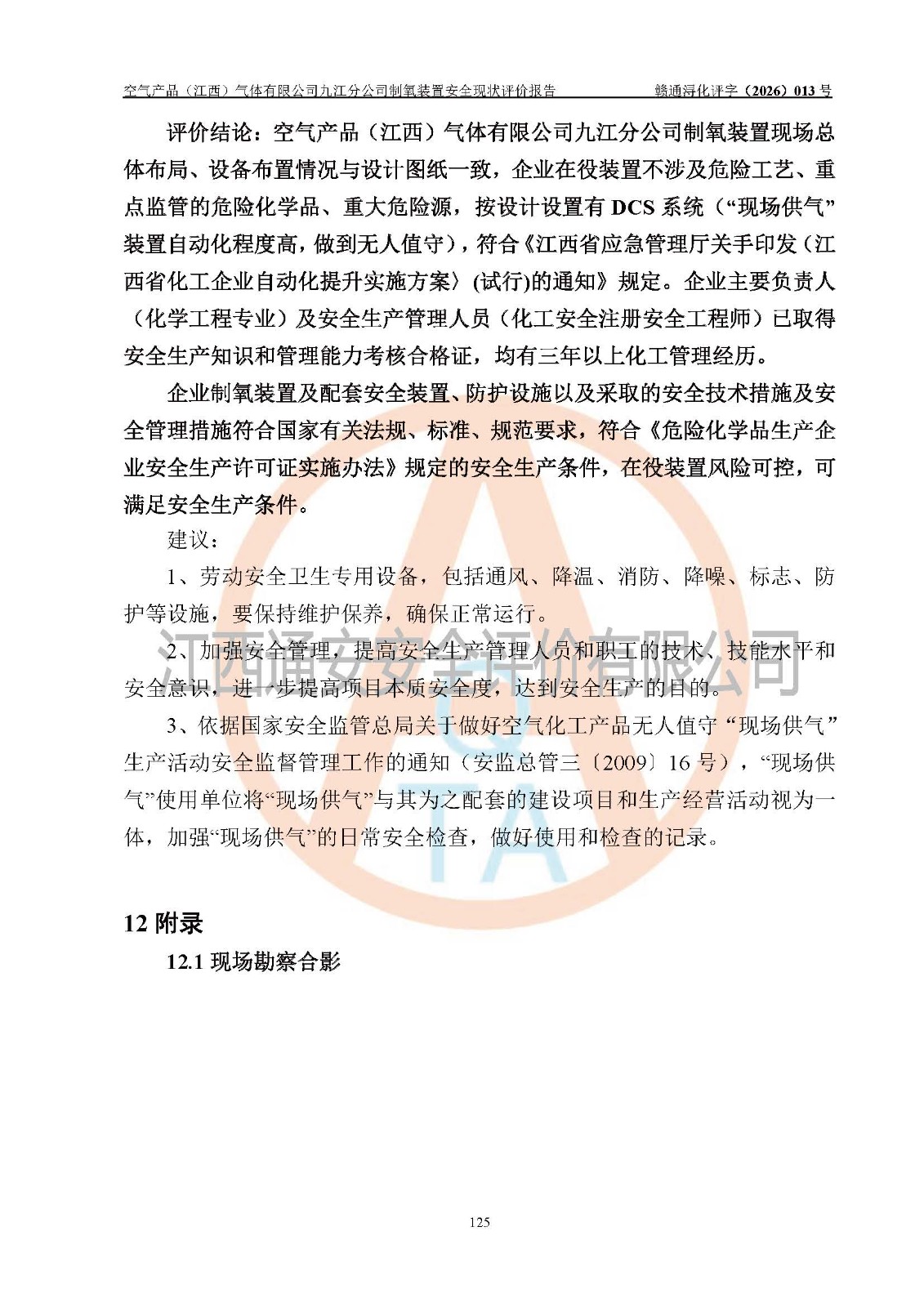 经评价组评价,空气产品(江西)气体有限公司九江分公司制氧装置现场总体布局、设备布置情况与设计图纸一致,企业在役装置不涉及危险工艺、重点监管的危险化学品、重大危险源,按设计设置有DCS系统(现场供气装置自动化程度高,做到无人值守),符合《江西省应急管理厅关手印发(江西省化工企业自动化提升实施方案〉(试行)的通知》规定。企业主要负责人(化学工程专业)及安全生产管理人员(化工安全注册安全工程师)已取得安全生产知识和管理能力考核合格证,均有三年以上化工管理经历。