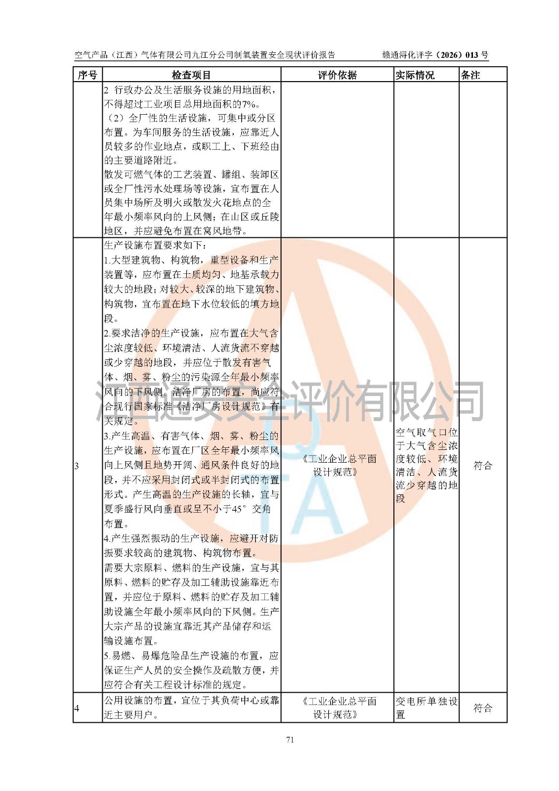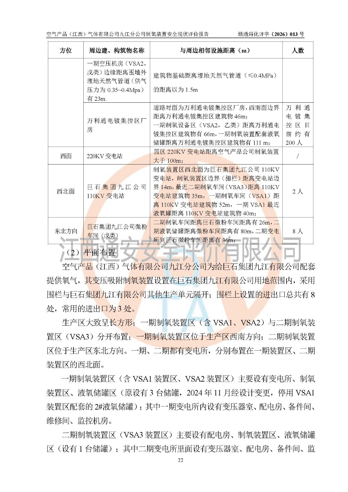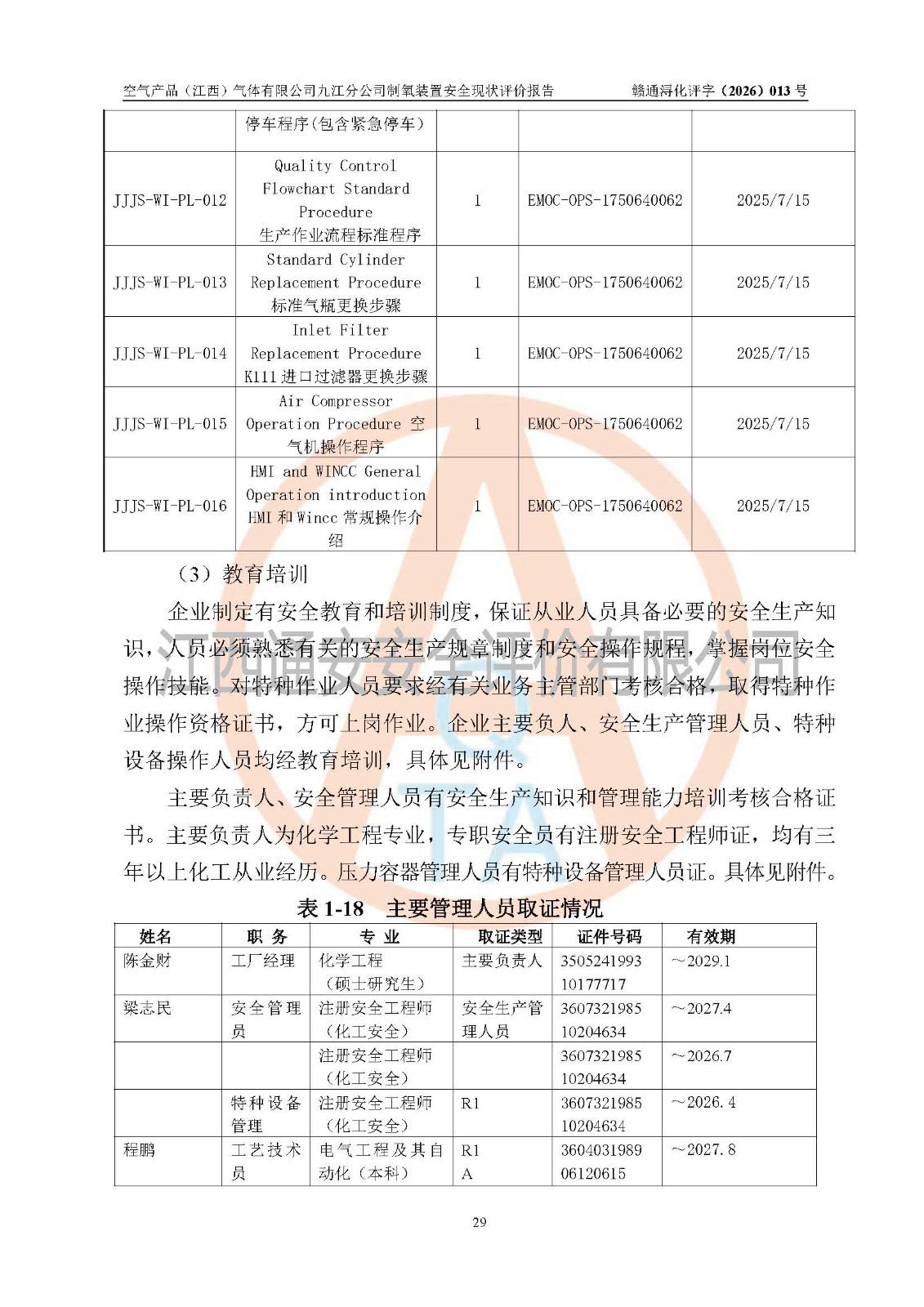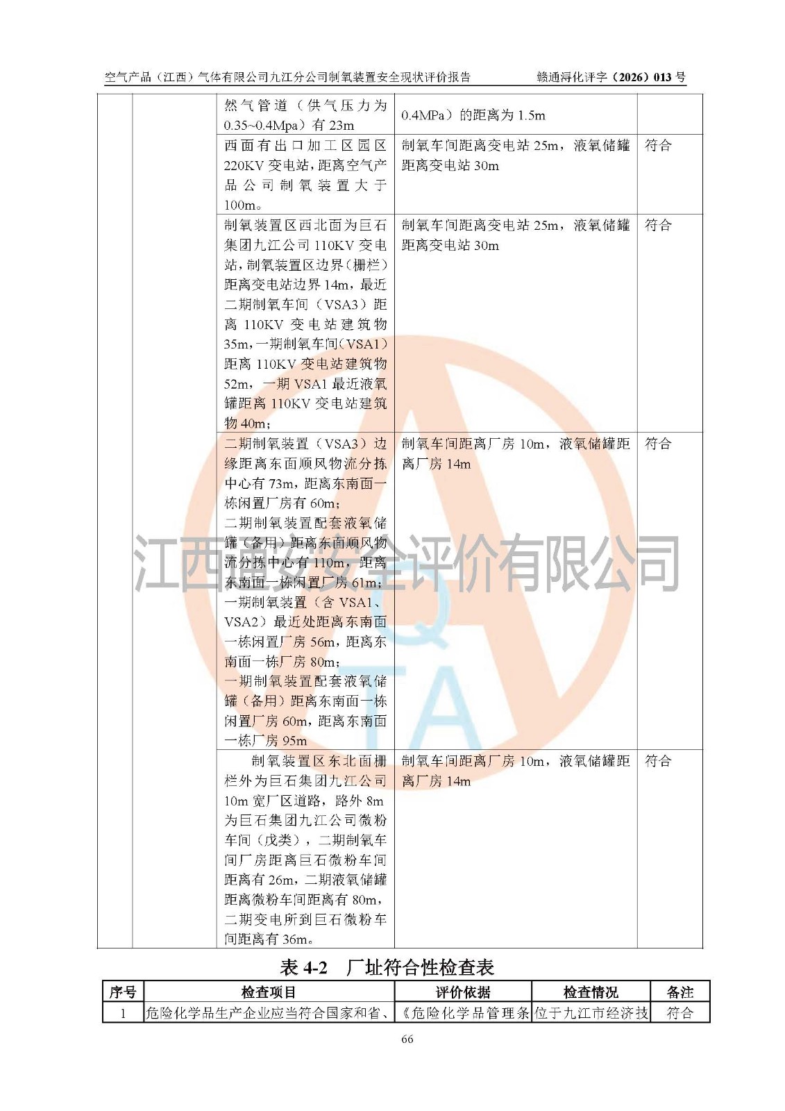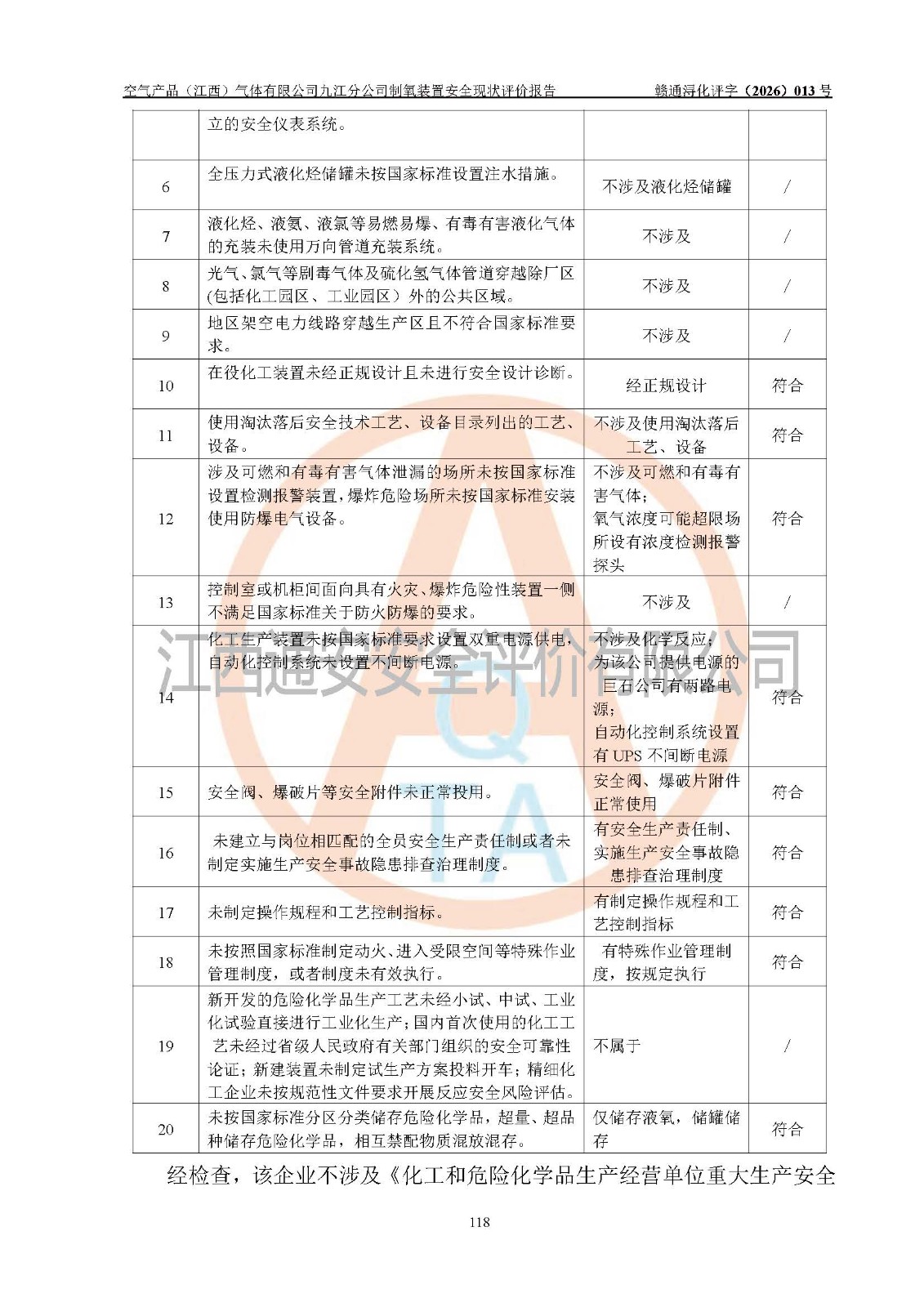 经评价组评价,空气产品(江西)气体有限公司九江分公司制氧装置现场总体布局、设备布置情况与设计图纸一致,企业在役装置不涉及危险工艺、重点监管的危险化学品、重大危险源,按设计设置有DCS系统(现场供气装置自动化程度高,做到无人值守),符合《江西省应急管理厅关手印发(江西省化工企业自动化提升实施方案〉(试行)的通知》规定。企业主要负责人(化学工程专业)及安全生产管理人员(化工安全注册安全工程师)已取得安全生产知识和管理能力考核合格证,均有三年以上化工管理经历。