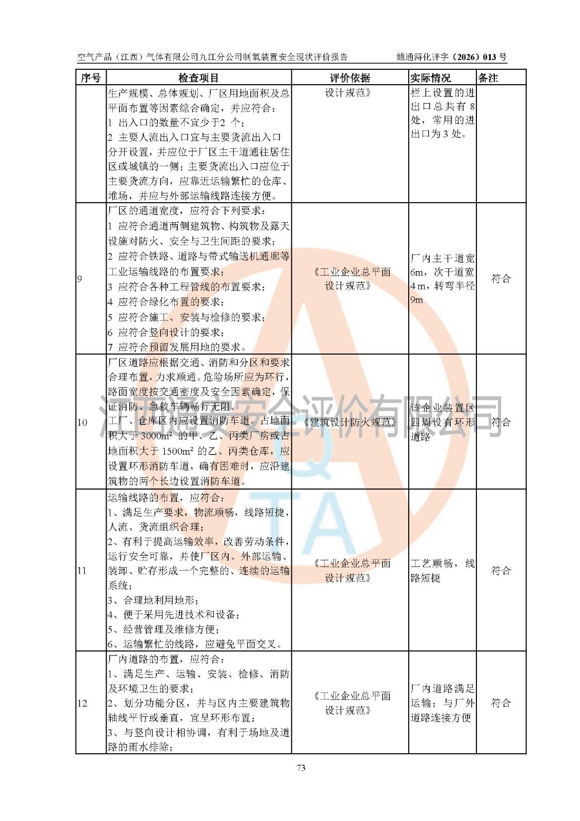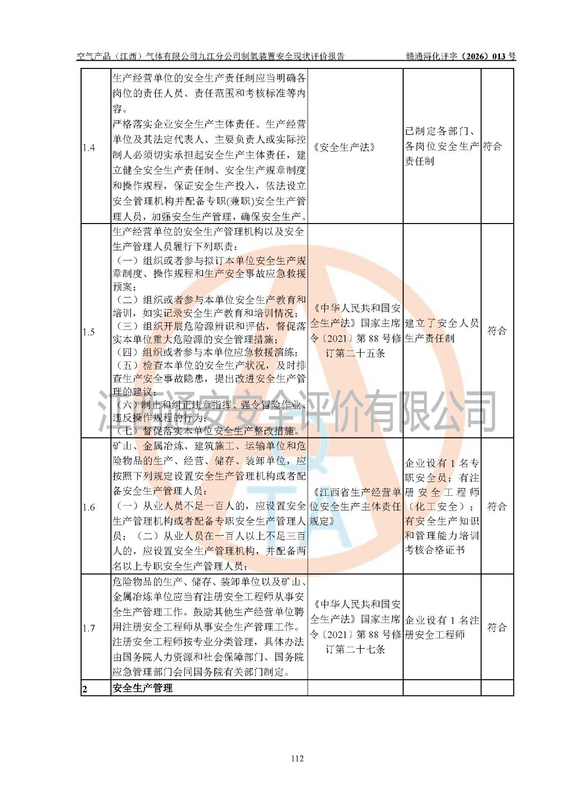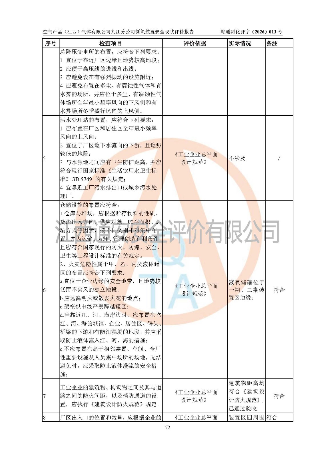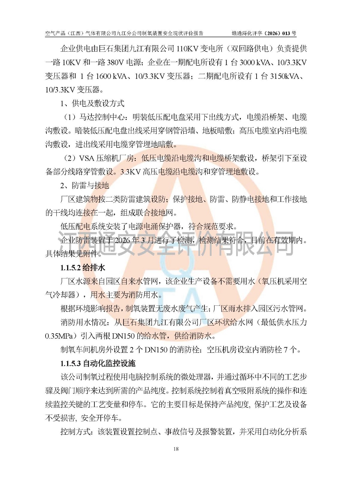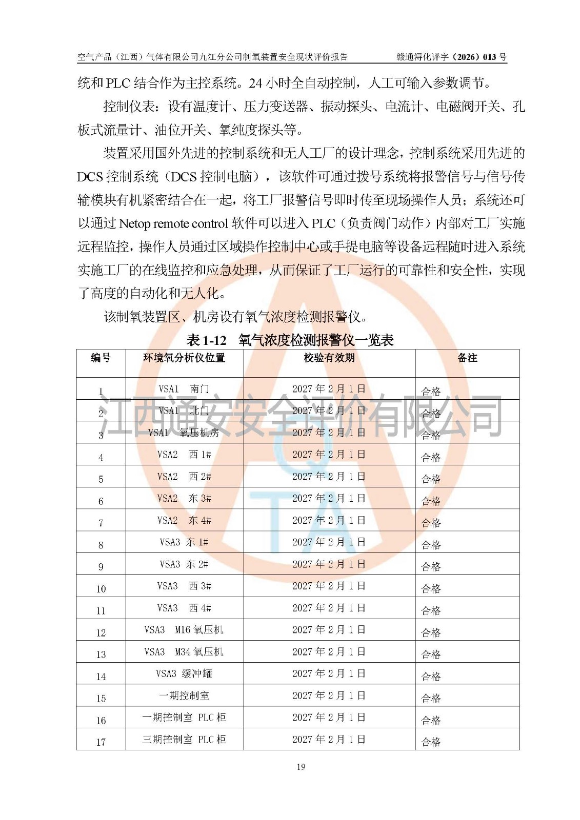 经评价组评价,空气产品(江西)气体有限公司九江分公司制氧装置现场总体布局、设备布置情况与设计图纸一致,企业在役装置不涉及危险工艺、重点监管的危险化学品、重大危险源,按设计设置有DCS系统(现场供气装置自动化程度高,做到无人值守),符合《江西省应急管理厅关手印发(江西省化工企业自动化提升实施方案〉(试行)的通知》规定。企业主要负责人(化学工程专业)及安全生产管理人员(化工安全注册安全工程师)已取得安全生产知识和管理能力考核合格证,均有三年以上化工管理经历。