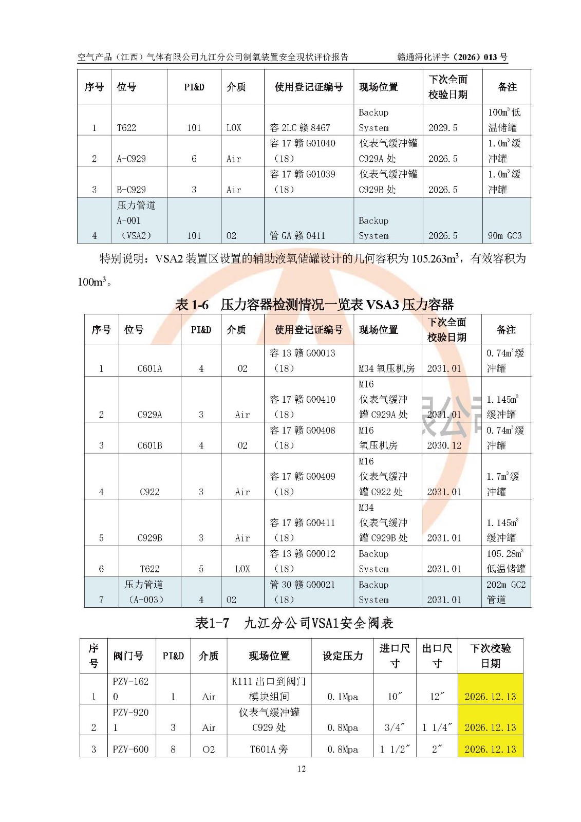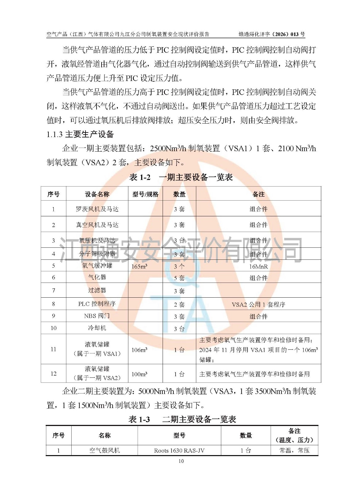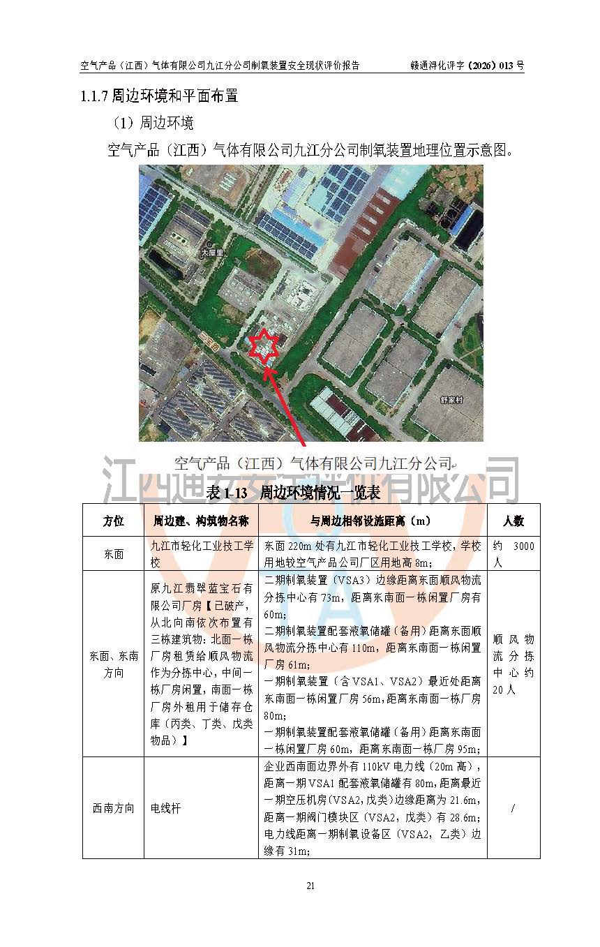 空气产品(江西)气体有限公司九江分公司前期(2017年之前)为了给巨石集团九江有限公司“年产35万吨玻璃纤维原丝生产线建设项目”一期工程配套提供氧气,设有一套2500Nm3/h变压吸附制氧装置VSA1配套建设2106m3的低温液氧贮存设施(备用,202411月停用一台);设有一套4200Nm3/h的变压吸附制氧装置VSA2,包括两套2100 Nm3/h VSA制氧装置,配套建设1100m3的低温液氧贮存设施(备用连续供氧)2017年为了给巨石集团九江有限公司“年产35万吨玻璃纤维原丝生产线建设项目”二期工程配套提供氧气,空气产品(江西)气体有限公司九江分公司投资建设了5000Nm3/h制氧装置VSA3,一套3500Nm3/h变压吸附制氧装置,一套1500Nm3/h变压吸附制氧装置,同时配套建设一台105.28m3的低温液氧贮存设施(备用连续供氧),2019年通过验收,**建成之后企业总供氧能力达到11700Nm3/h