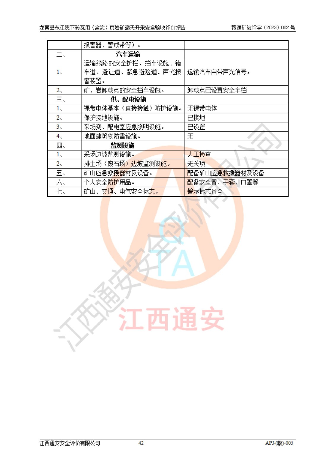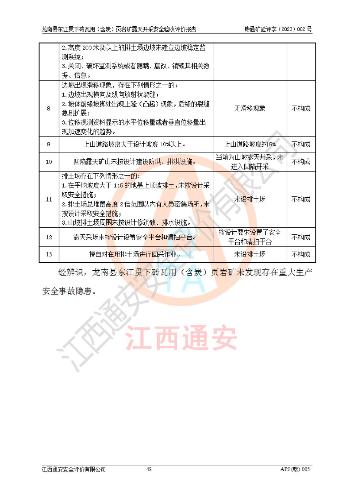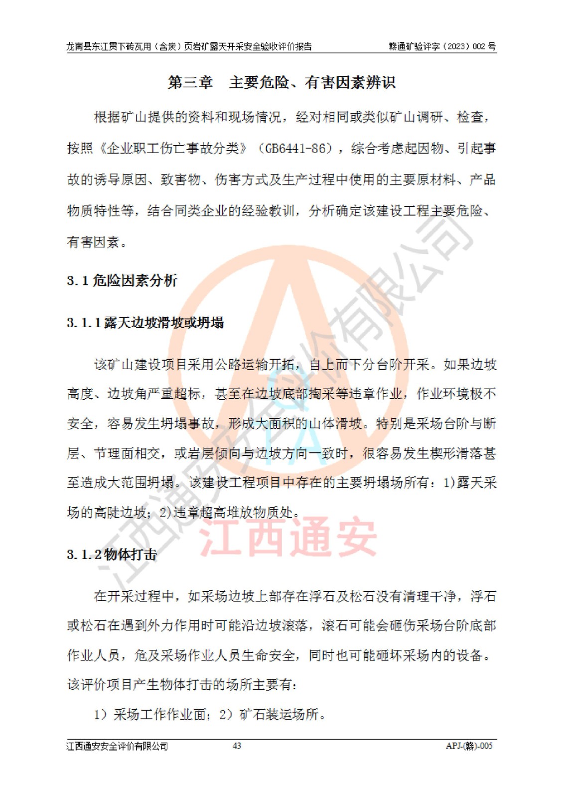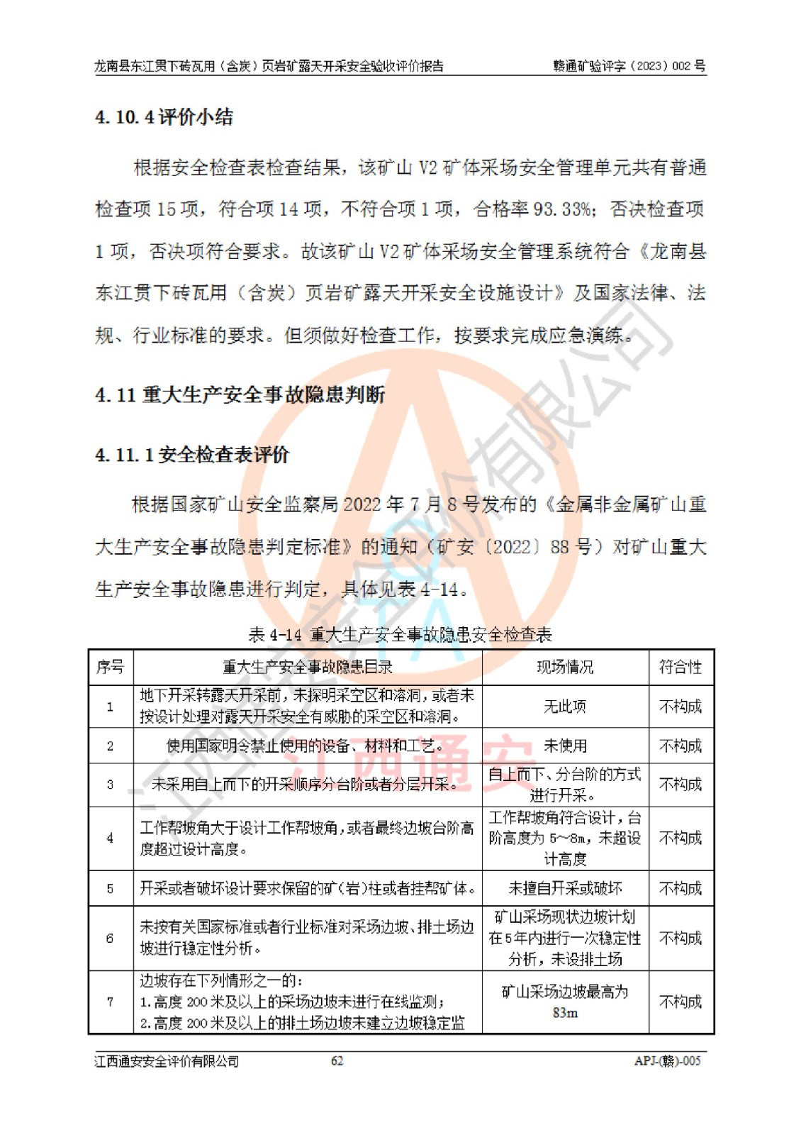 其它 | 1、该评价项目中存在的主要危险因素坍塌(滑坡)、**伤害、高处坠落、物体打击、触电、机械伤害、火灾、泥石流、淹溺等。 2、该评价项目中存在的有害因素包括:粉尘、噪声与振动、不良作业环境和其他不利的环境因素等。 3、该评价项目为页岩矿开采矿山,无瓦斯和自燃发火危险,水文地质条件属简单类型。该矿山无瓦斯和自燃发火危险。不使用有毒有害危险化学品药剂进行原矿深度加工,矿山开采未使用**明令禁止使用的设备、材料和工艺等,本建设项目不存在重大危险源。 上述主要危险、有害因素在采取本报告第五章中提出的安全对策措施后,能得到**控制。该项目从安全生产角度符合**有关安全生产法律、法规、规章和技术标准的要求,龙南县东江贯下砖瓦用(含炭)页岩矿露天开采项目,通过矿山基建和试生产,符合安全设施与主体工程同时设计、同时施工、同时投入生产和使用的要求;安全设施符合《龙南县东江贯下砖瓦用(含炭)页岩矿露天开采安全设施设计》的要求,龙南县东江贯下砖瓦用(含炭)页岩矿露天开采项目符合安全设施验收条件。 | ||||