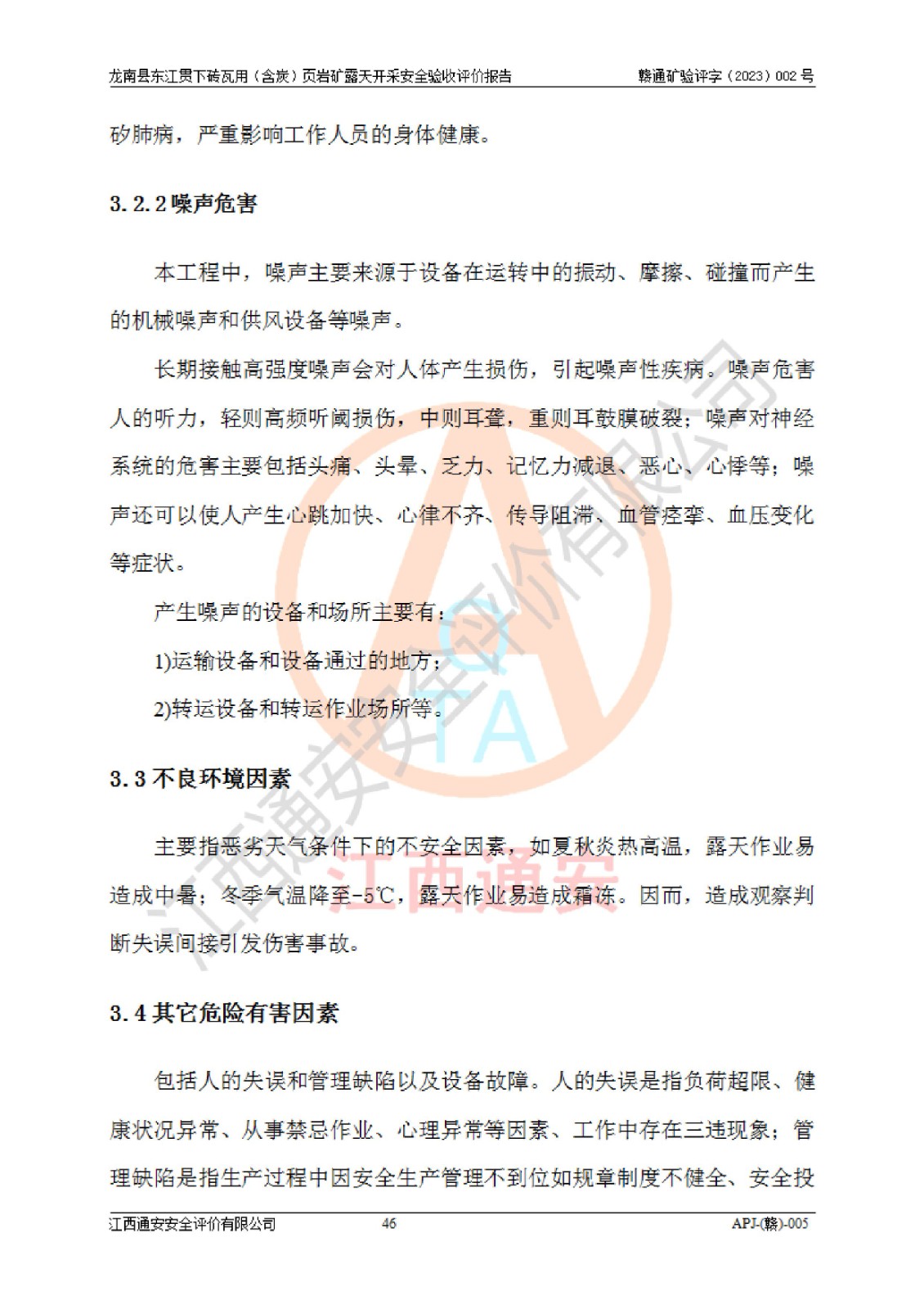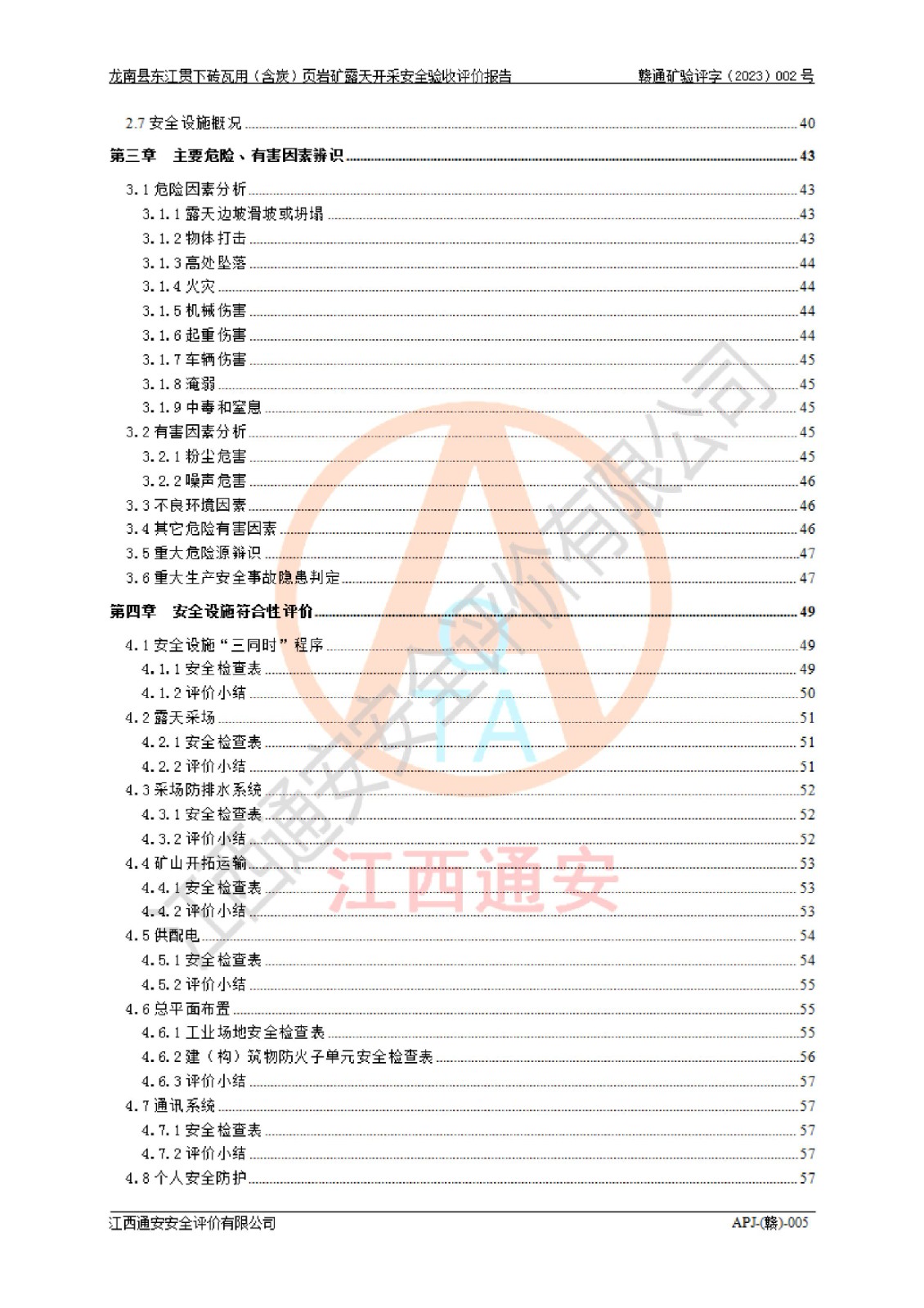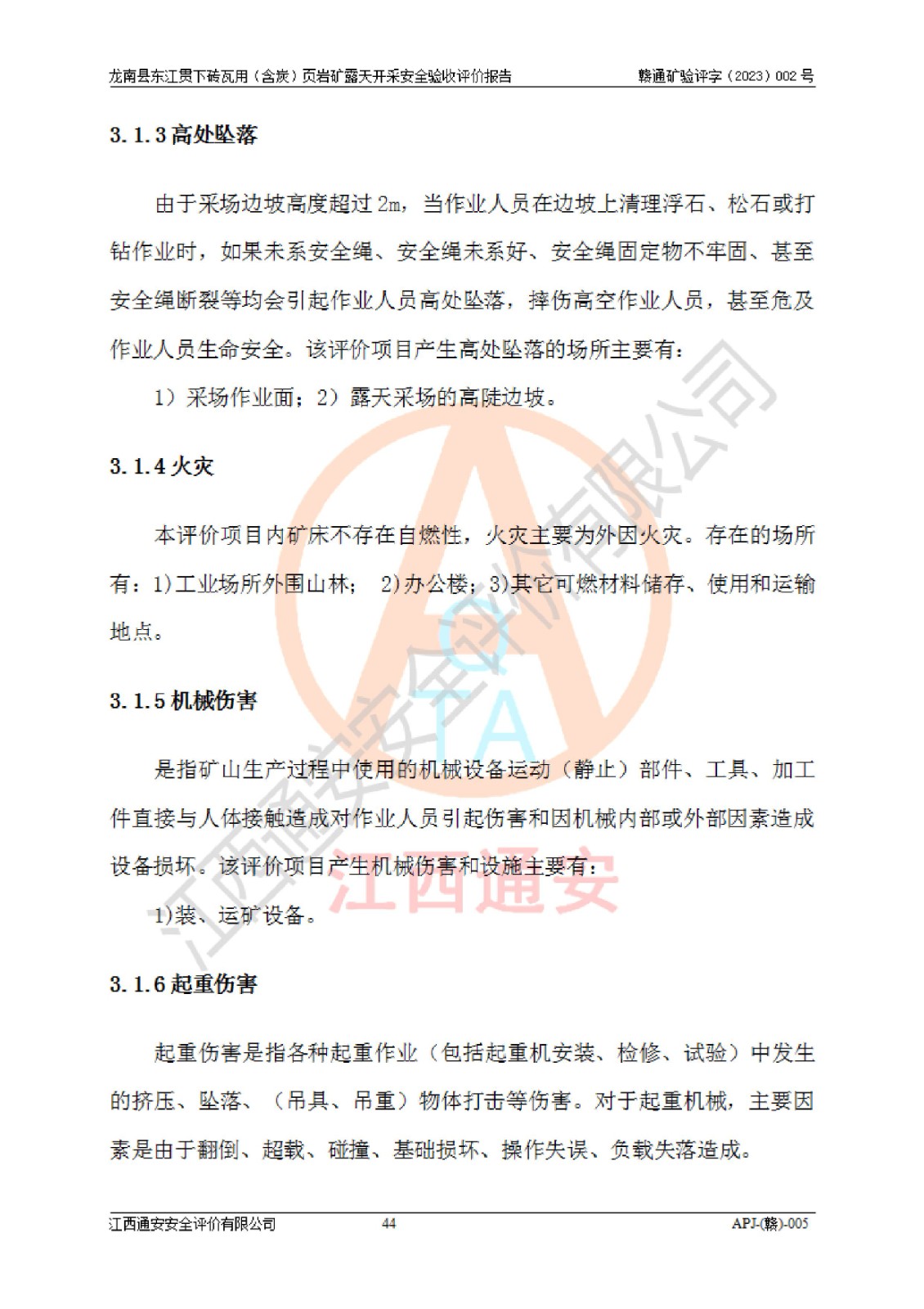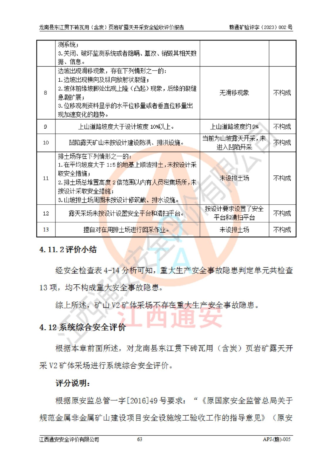其它 | 1、该评价项目中存在的主要危险因素坍塌(滑坡)、**伤害、高处坠落、物体打击、触电、机械伤害、火灾、泥石流、淹溺等。 2、该评价项目中存在的有害因素包括:粉尘、噪声与振动、不良作业环境和其他不利的环境因素等。 3、该评价项目为页岩矿开采矿山,无瓦斯和自燃发火危险,水文地质条件属简单类型。该矿山无瓦斯和自燃发火危险。不使用有毒有害危险化学品药剂进行原矿深度加工,矿山开采未使用**明令禁止使用的设备、材料和工艺等,本建设项目不存在重大危险源。 上述主要危险、有害因素在采取本报告第五章中提出的安全对策措施后,能得到**控制。该项目从安全生产角度符合**有关安全生产法律、法规、规章和技术标准的要求,龙南县东江贯下砖瓦用(含炭)页岩矿露天开采项目,通过矿山基建和试生产,符合安全设施与主体工程同时设计、同时施工、同时投入生产和使用的要求;安全设施符合《龙南县东江贯下砖瓦用(含炭)页岩矿露天开采安全设施设计》的要求,龙南县东江贯下砖瓦用(含炭)页岩矿露天开采项目符合安全设施验收条件。 | ||||