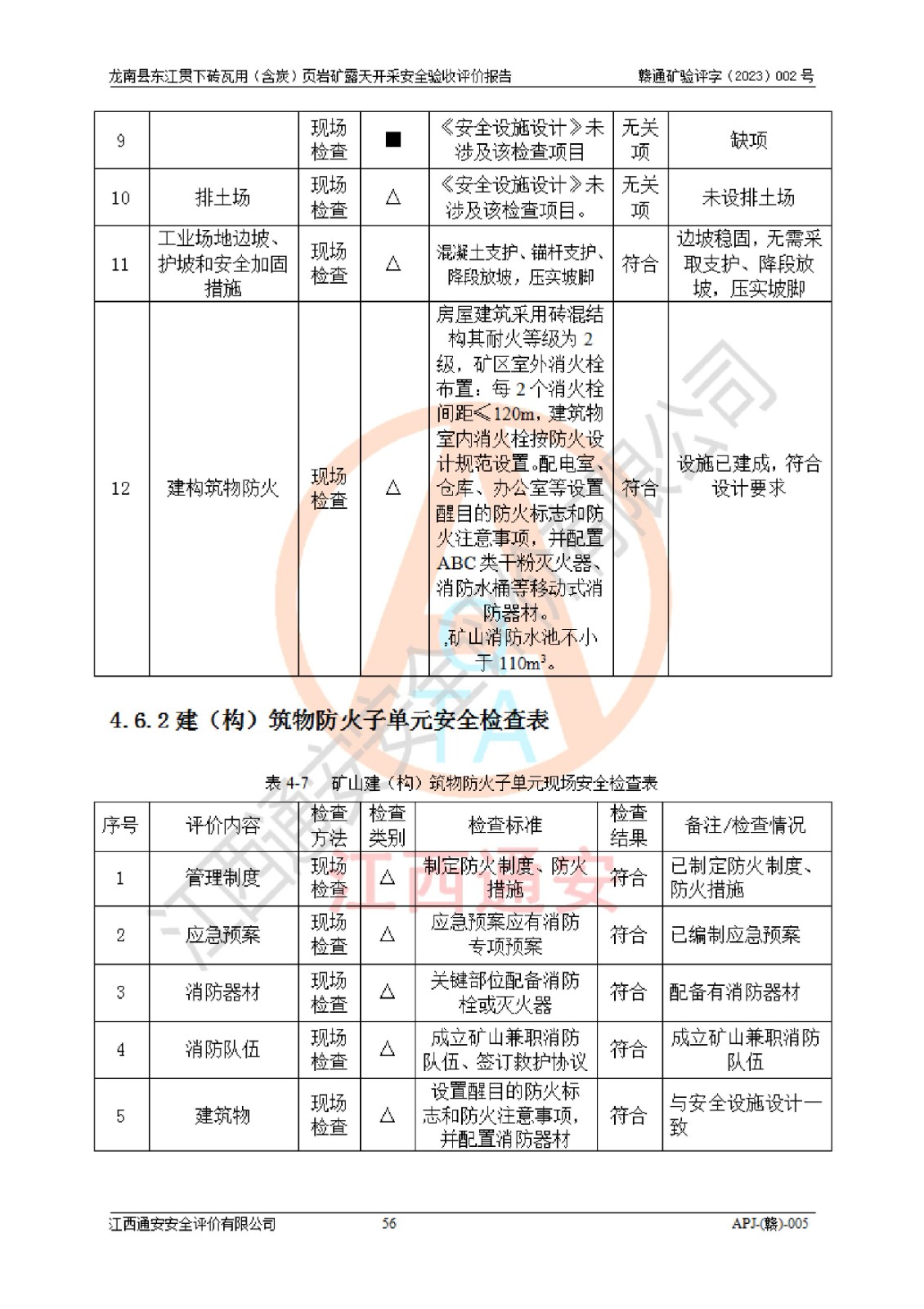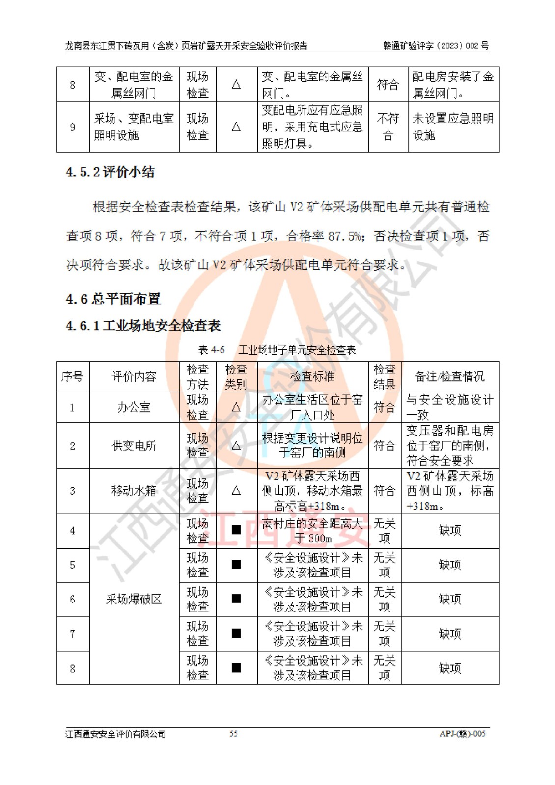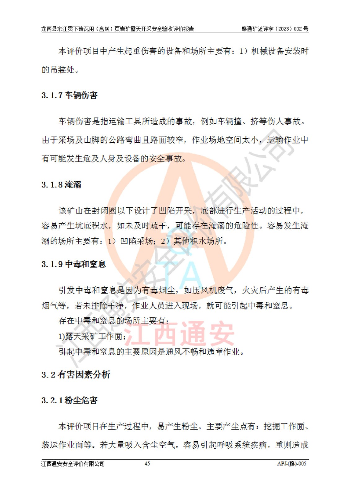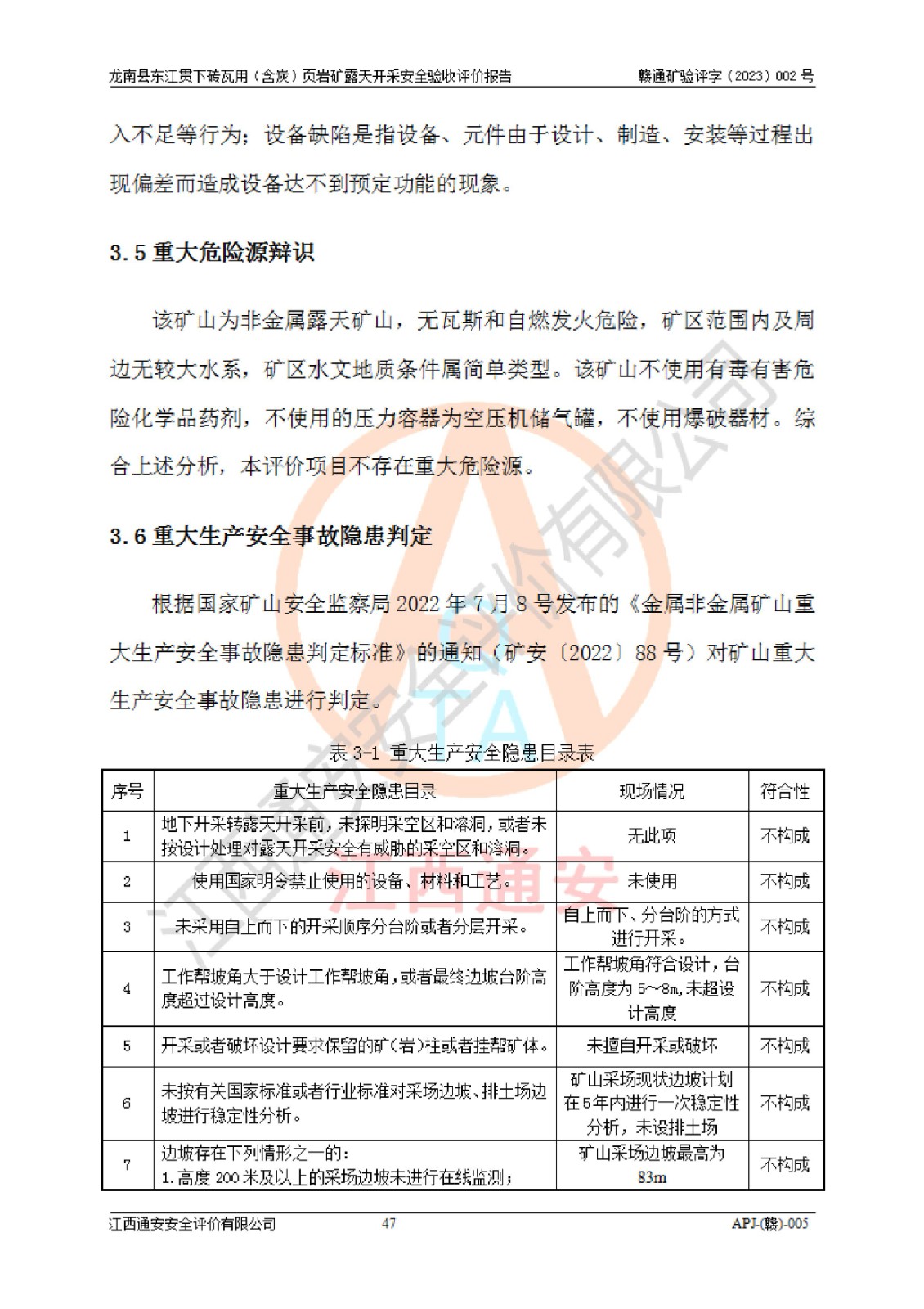 其它 | 1、该评价项目中存在的主要危险因素坍塌(滑坡)、**伤害、高处坠落、物体打击、触电、机械伤害、火灾、泥石流、淹溺等。 2、该评价项目中存在的有害因素包括:粉尘、噪声与振动、不良作业环境和其他不利的环境因素等。 3、该评价项目为页岩矿开采矿山,无瓦斯和自燃发火危险,水文地质条件属简单类型。该矿山无瓦斯和自燃发火危险。不使用有毒有害危险化学品药剂进行原矿深度加工,矿山开采未使用**明令禁止使用的设备、材料和工艺等,本建设项目不存在重大危险源。 上述主要危险、有害因素在采取本报告第五章中提出的安全对策措施后,能得到**控制。该项目从安全生产角度符合**有关安全生产法律、法规、规章和技术标准的要求,龙南县东江贯下砖瓦用(含炭)页岩矿露天开采项目,通过矿山基建和试生产,符合安全设施与主体工程同时设计、同时施工、同时投入生产和使用的要求;安全设施符合《龙南县东江贯下砖瓦用(含炭)页岩矿露天开采安全设施设计》的要求,龙南县东江贯下砖瓦用(含炭)页岩矿露天开采项目符合安全设施验收条件。 | ||||
