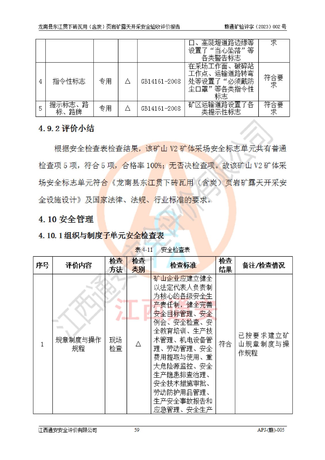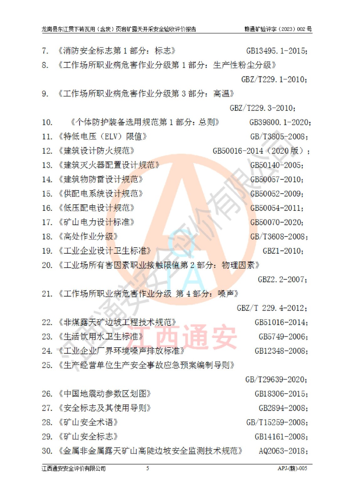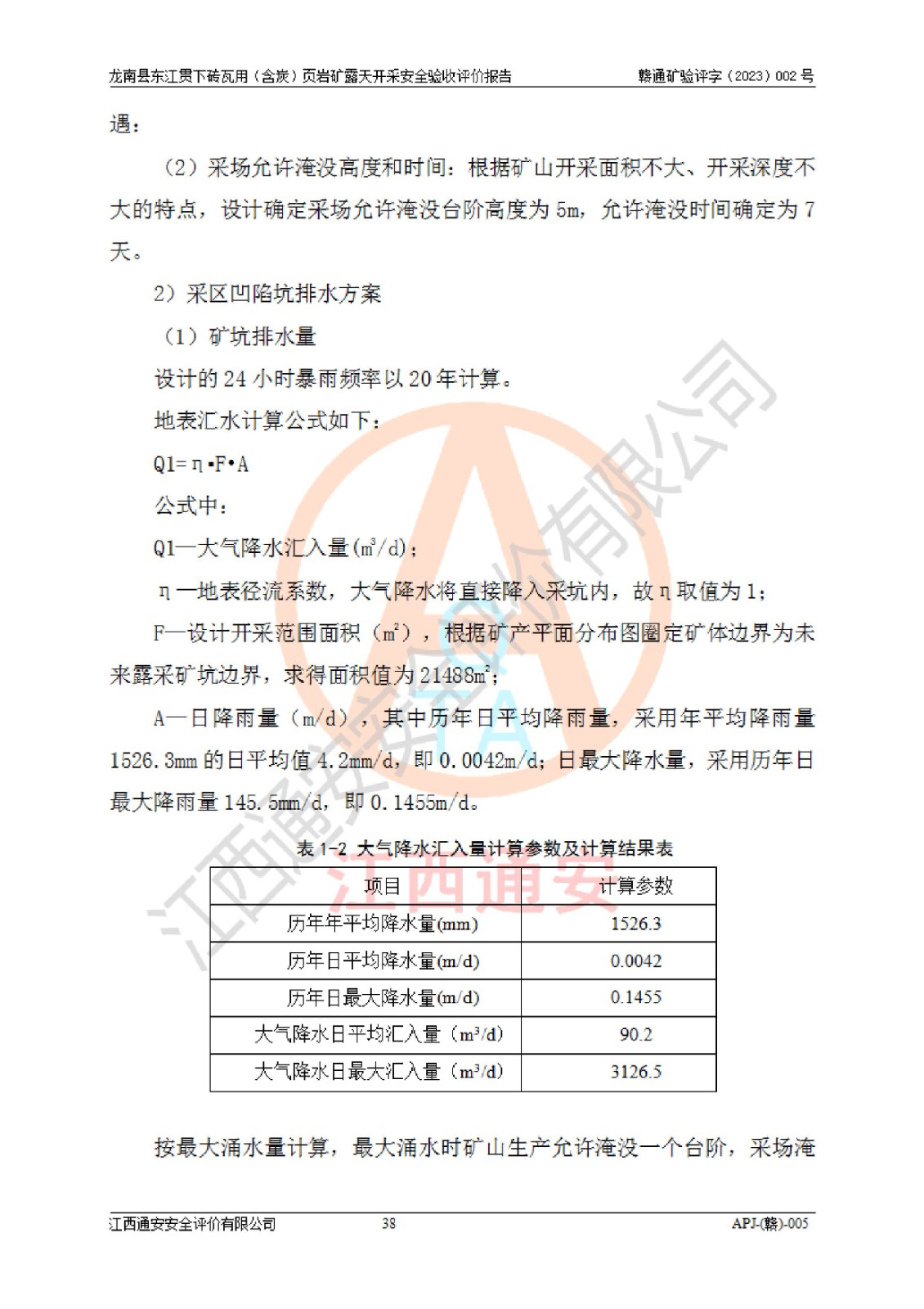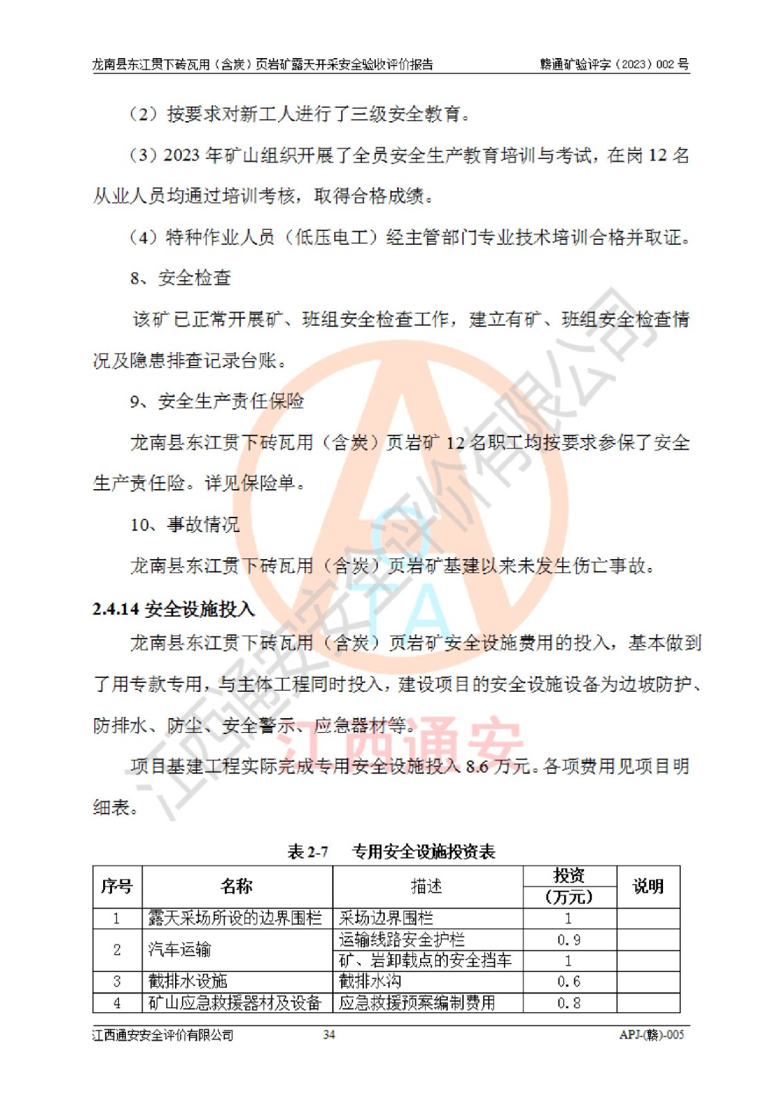 其它 | 1、该评价项目中存在的主要危险因素坍塌(滑坡)、**伤害、高处坠落、物体打击、触电、机械伤害、火灾、泥石流、淹溺等。 2、该评价项目中存在的有害因素包括:粉尘、噪声与振动、不良作业环境和其他不利的环境因素等。 3、该评价项目为页岩矿开采矿山,无瓦斯和自燃发火危险,水文地质条件属简单类型。该矿山无瓦斯和自燃发火危险。不使用有毒有害危险化学品药剂进行原矿深度加工,矿山开采未使用**明令禁止使用的设备、材料和工艺等,本建设项目不存在重大危险源。 上述主要危险、有害因素在采取本报告第五章中提出的安全对策措施后,能得到**控制。该项目从安全生产角度符合**有关安全生产法律、法规、规章和技术标准的要求,龙南县东江贯下砖瓦用(含炭)页岩矿露天开采项目,通过矿山基建和试生产,符合安全设施与主体工程同时设计、同时施工、同时投入生产和使用的要求;安全设施符合《龙南县东江贯下砖瓦用(含炭)页岩矿露天开采安全设施设计》的要求,龙南县东江贯下砖瓦用(含炭)页岩矿露天开采项目符合安全设施验收条件。 | ||||