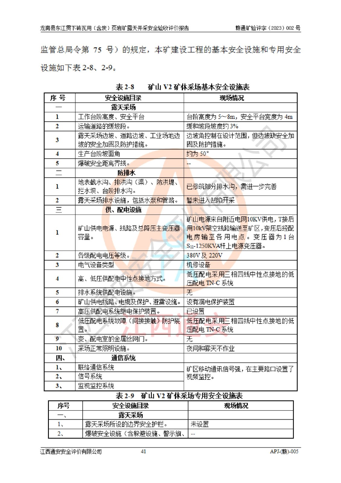 主要任务 | 现场收集企业基本信息,对企业周边环境及装置配套安全设施、安全生产管理、应急管理、前置条件等进行了实地检查,采集现场影像资料。通过对企业周边环境、总平面布置、露天采场、矿岩运输、供配电、通讯系统、防排水设施、供水供气设施及个人安全防护设施的安全状况进行勘察,辨识项目危险有害因素,进行风险程度评价,法规标准符合性评价,提出安全对策措施与建议,对该建设项目安全条件是否符合**法律规范等进行了判定,得出风险评价结论。 | ||||