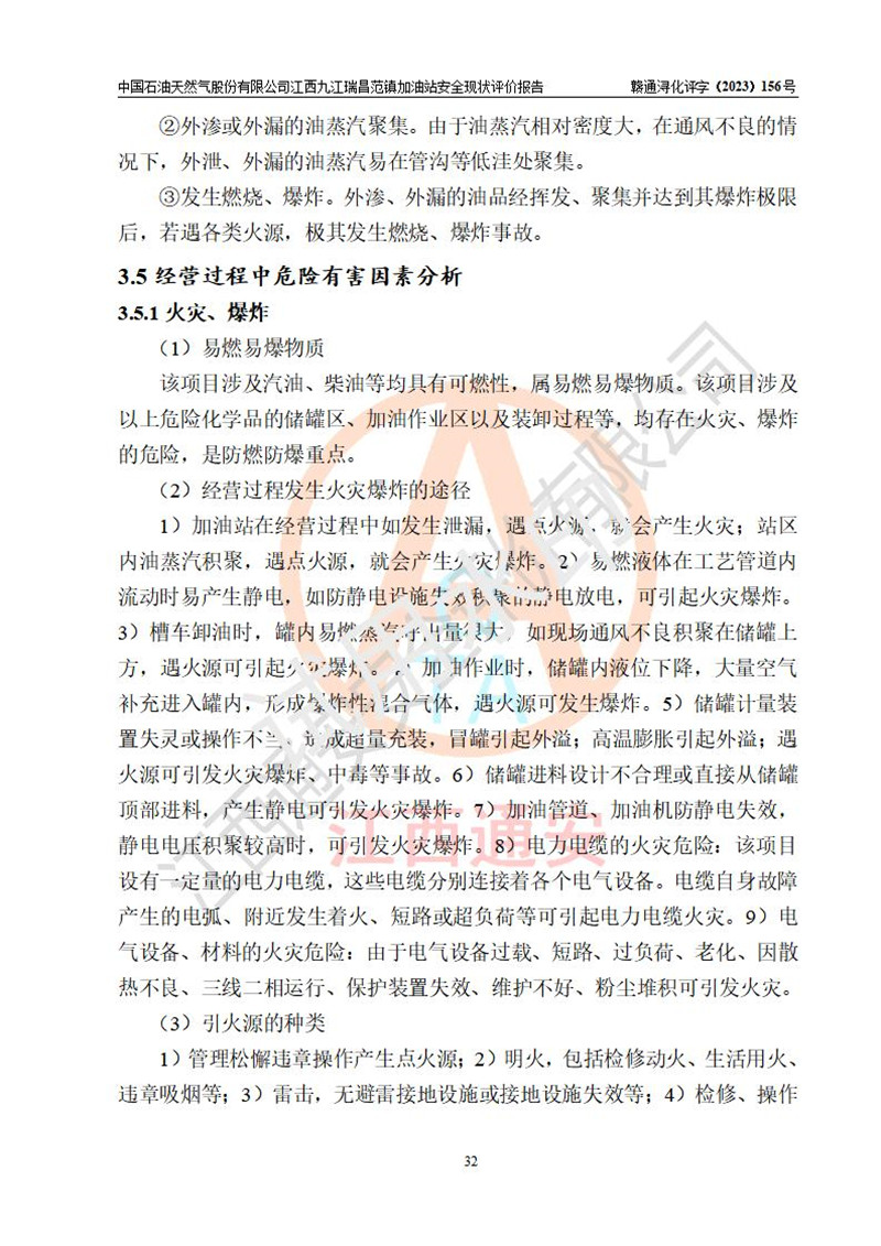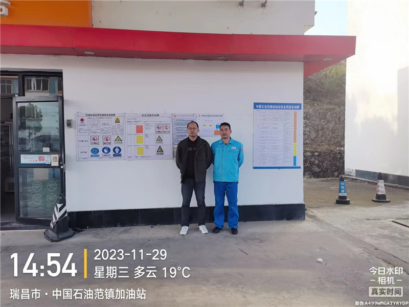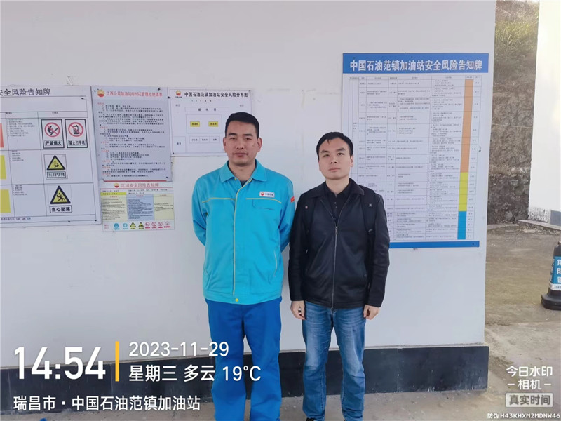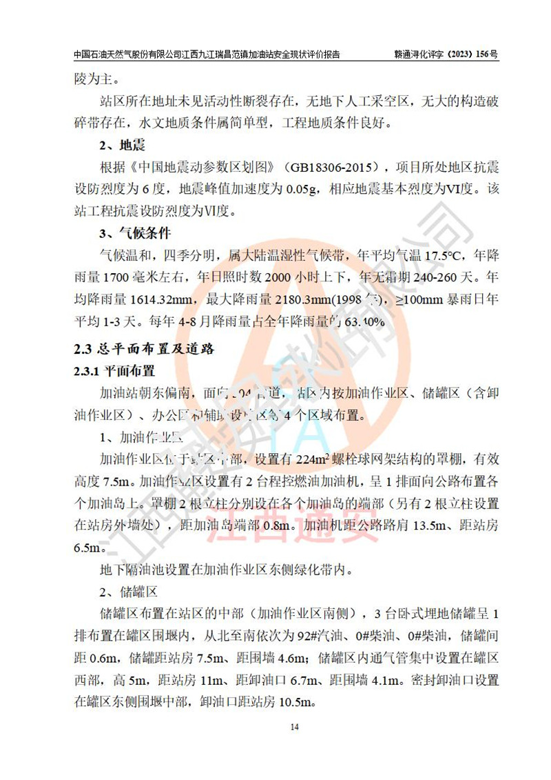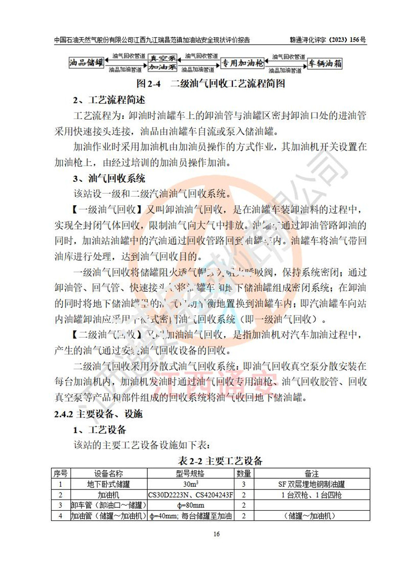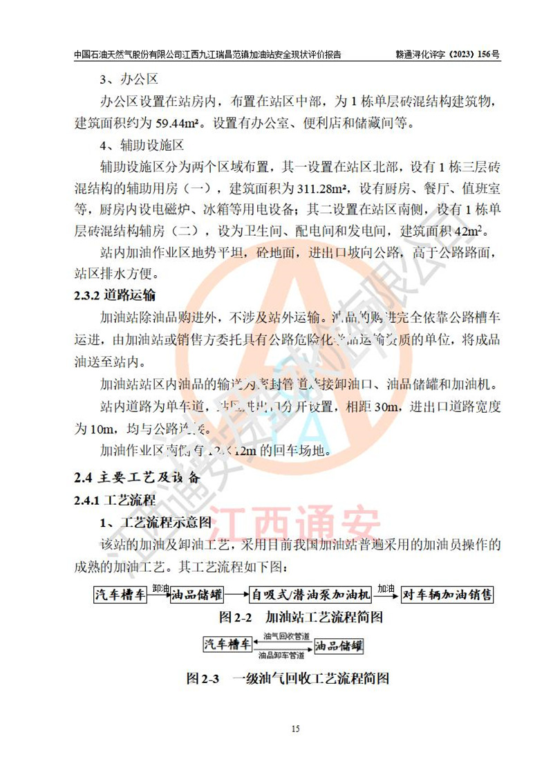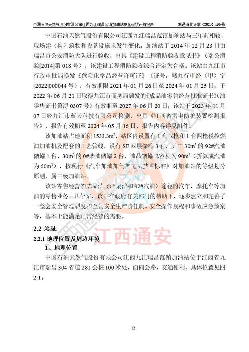 项目简介 | 中国石油天然气股份有限公司江西九江瑞昌范镇加油站是一家专门从事成品油零售经营的股份有限公司分公司(上市、国有控股),经营场所位于江西省九江市瑞昌304省道281公桩100米处。现有从业人员3名,其中安全管理人员1人,加油站负责人杨全荣。 该加油站占占地面积1533.3m2,站区内设置有1台双枪和1台四枪税控燃油加油机及配套的工艺管线,设有SF双层储罐3台,其中30m3的92#汽油储罐1台、30m3的0#柴油储罐2台,油品储罐总容积为90m3(折算成汽油为60m3),按现行《汽车加油加气加氢站技术标准》对加油站的等级划分原则,属三级加油站。 该站由九江市行政审批局换发《危险化学品经营许可证》(证号:赣九行审经(甲)字[2022]000044号),**期限2021年01月26日至2024年01月25日。 | |||
