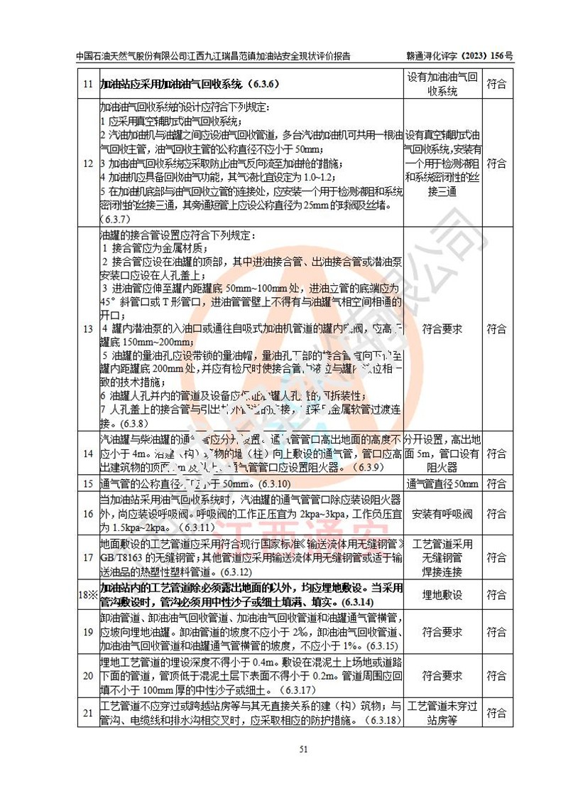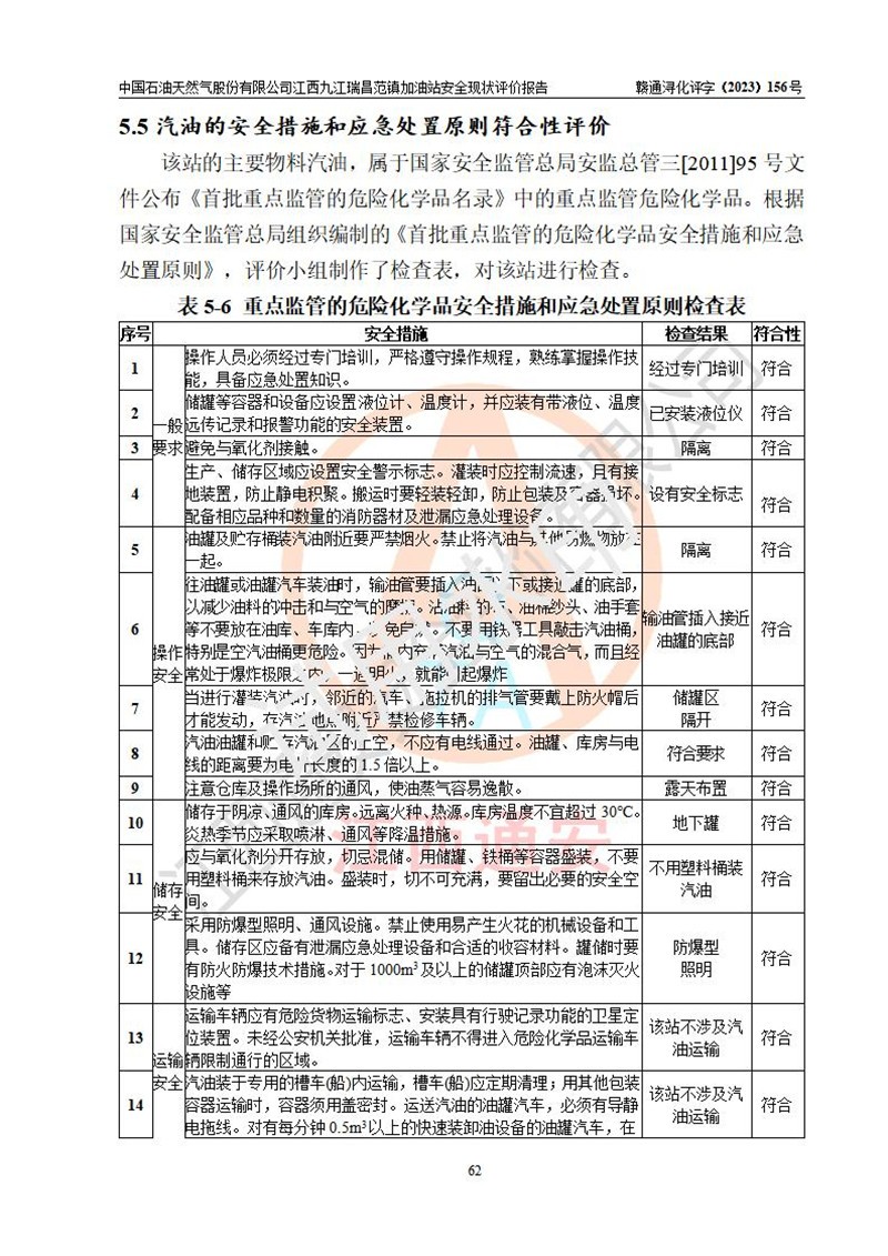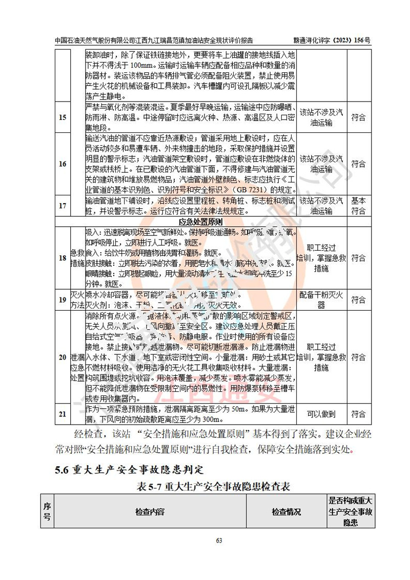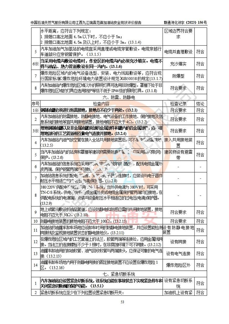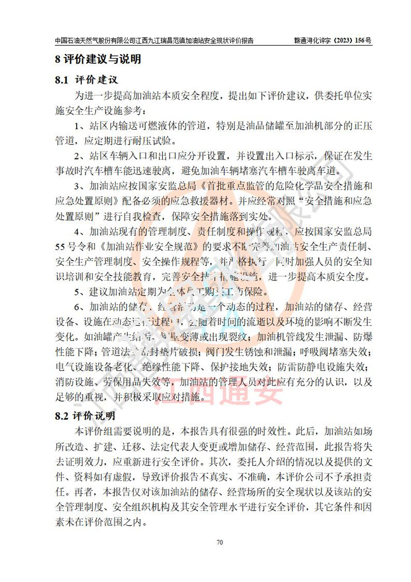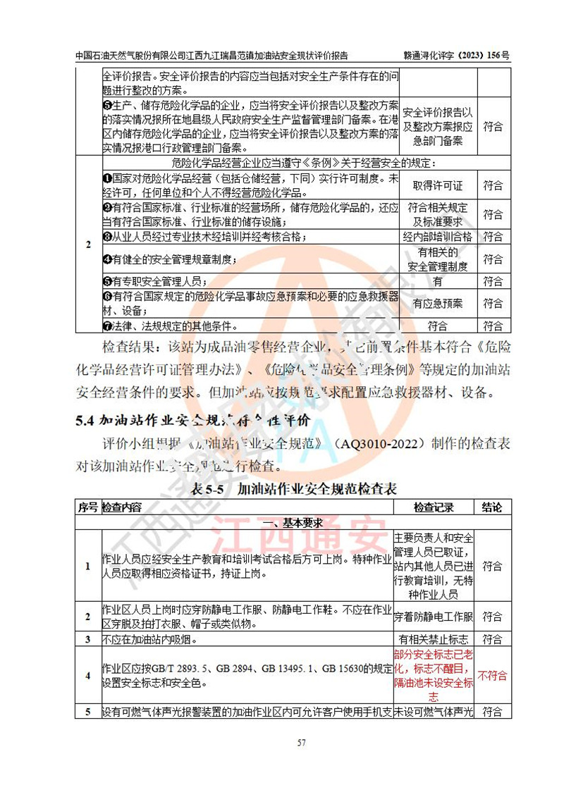 评价结论 | 中国石油天然气股份有限公司江西九江瑞昌范镇加油站涉及的安全条件、安全经营条件、安全生产管理符合《危险化学品经营许可证管理办法》、《汽车加油加气加氢站技术标准》等**有关法规、标准、规范要求,能满足危险化学品经营安全条件。 | |||
