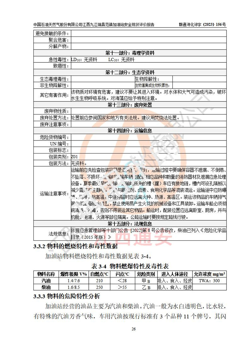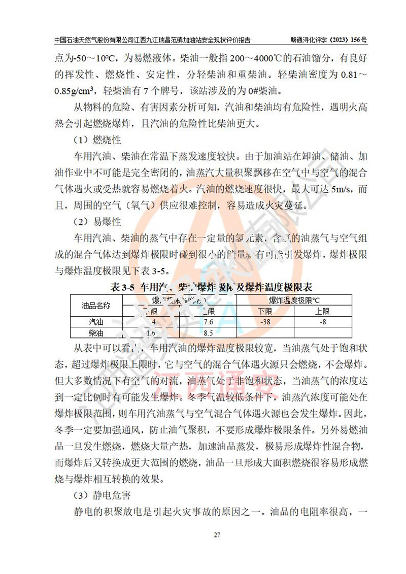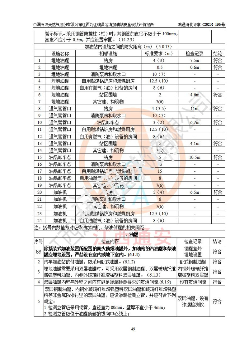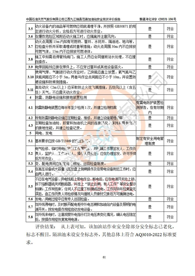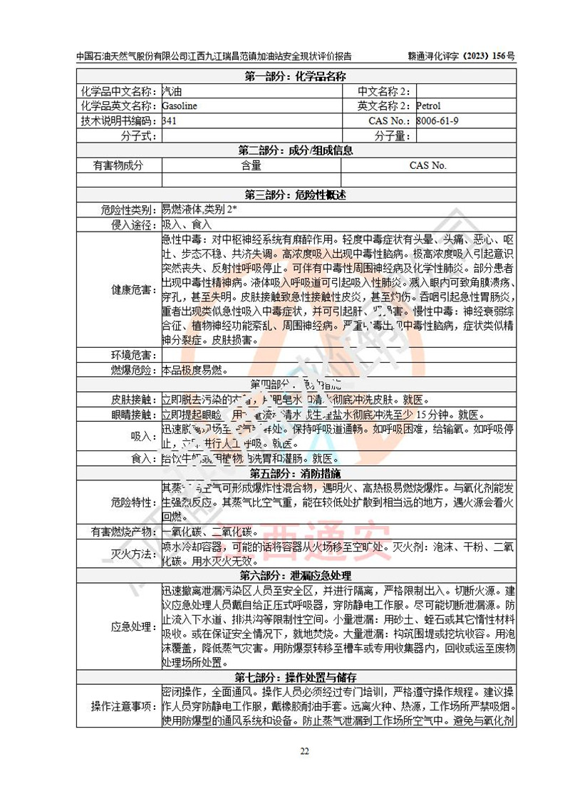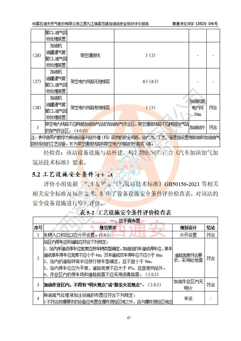 评价结论 | 中国石油天然气股份有限公司江西九江瑞昌范镇加油站涉及的安全条件、安全经营条件、安全生产管理符合《危险化学品经营许可证管理办法》、《汽车加油加气加氢站技术标准》等**有关法规、标准、规范要求,能满足危险化学品经营安全条件。 | |||